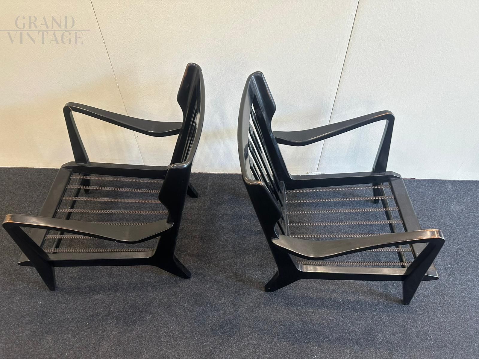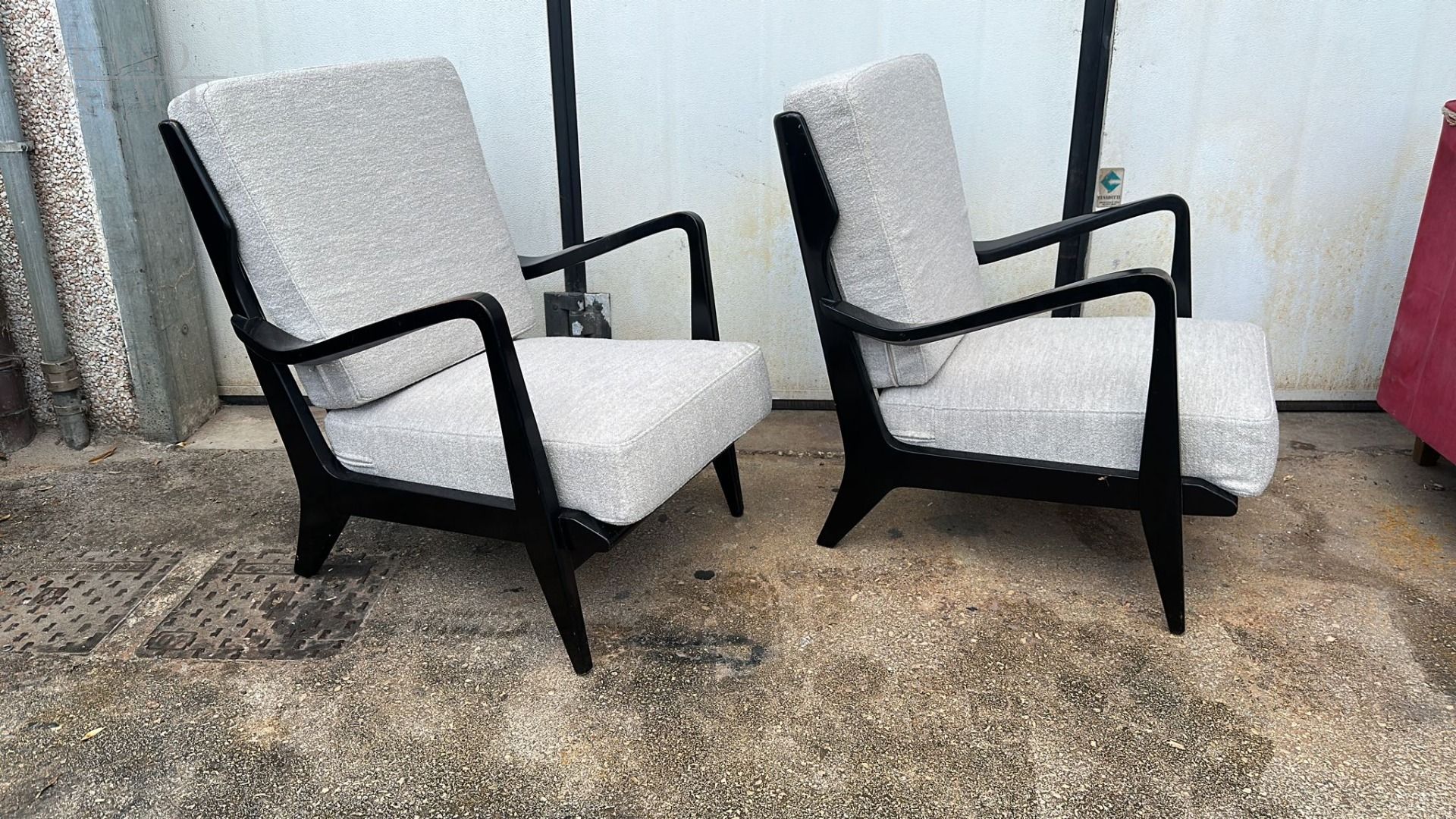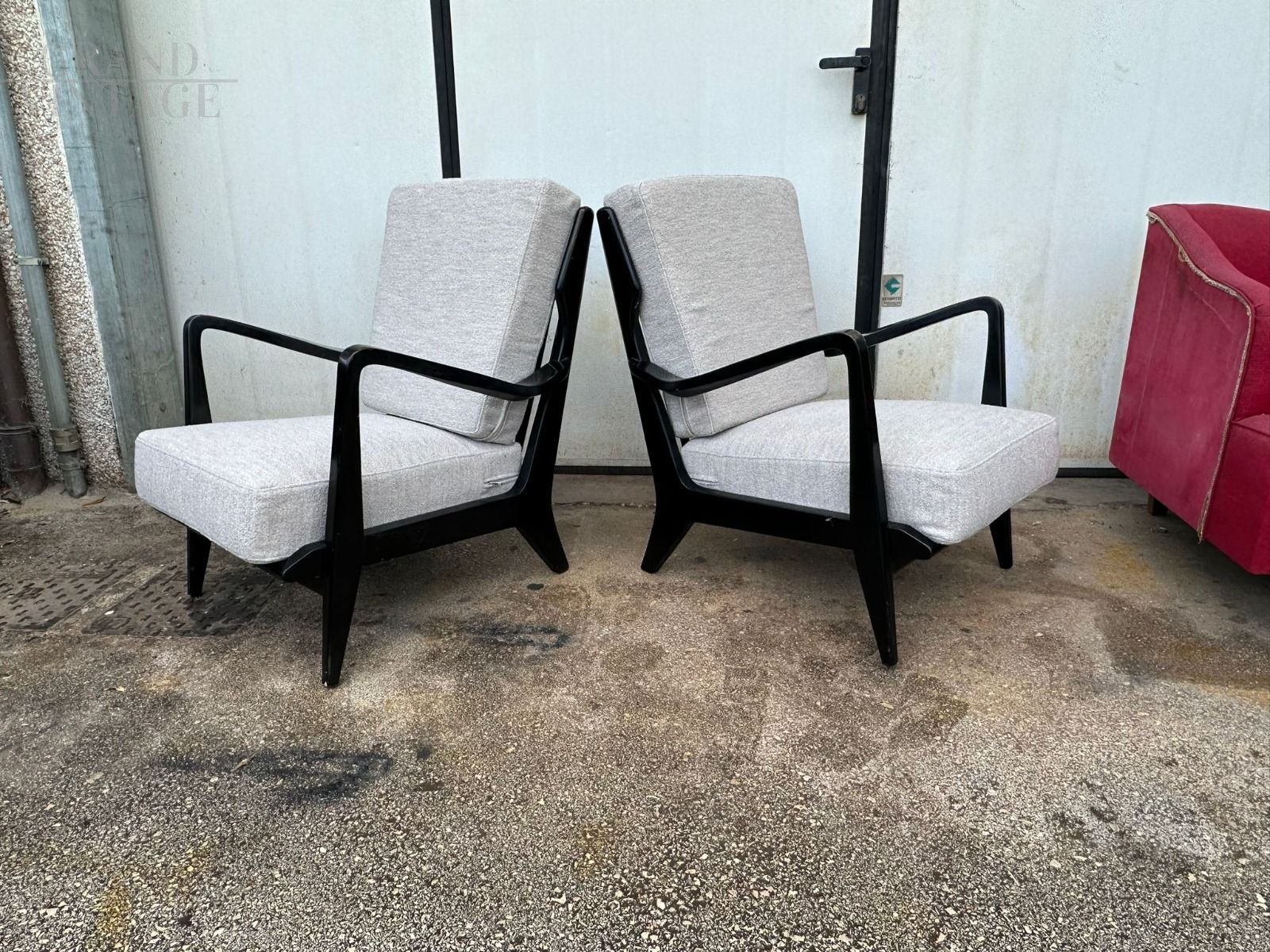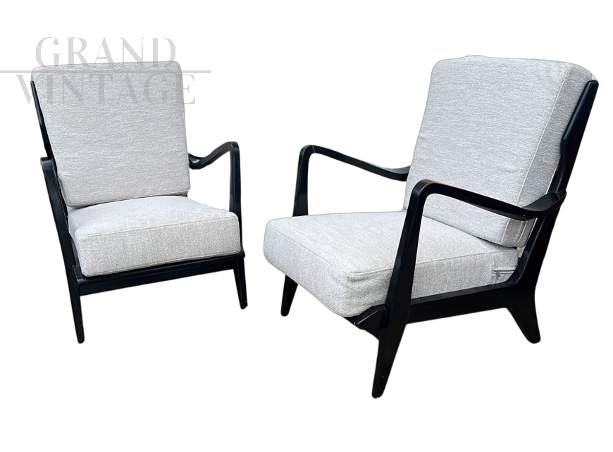 Coppia di poltrone modello 516 prodotte da Cassina negli anni ’50 e disegnate da Giò Ponti. La struttura è in legno di noce ebanizzato a gomma lacca. Le poltrone sono conservate e non presentano restauri. I cuscini (schiuma e fodere) sono nuovissimi. Le fodere sono in tessuto "bouclé" di Dedar.