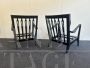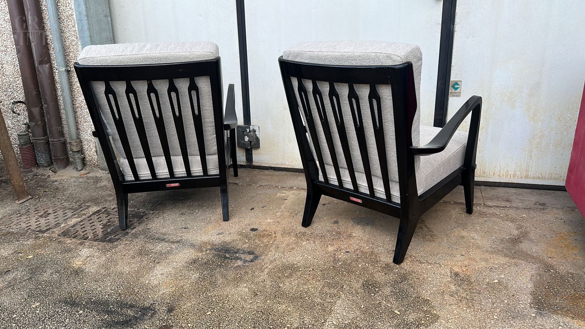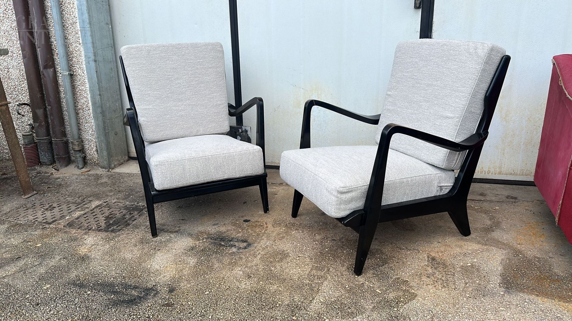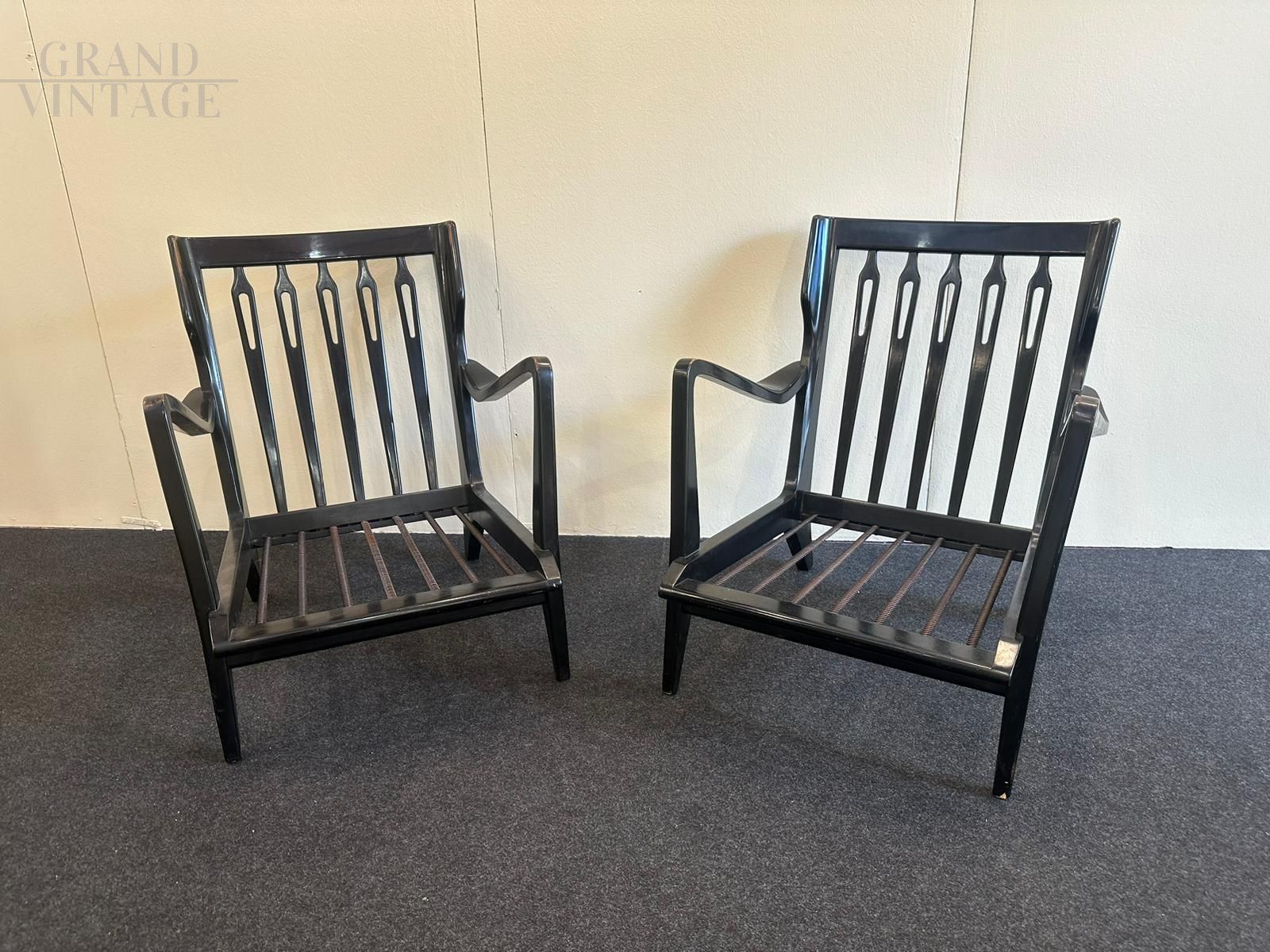 Coppia di poltrone modello 516 prodotte da Cassina negli anni ’50 e disegnate da Giò Ponti. La struttura è in legno di noce ebanizzato a gomma lacca. Le poltrone sono conservate e non presentano restauri. I cuscini (schiuma e fodere) sono nuovissimi. Le fodere sono in tessuto "bouclé" di Dedar.