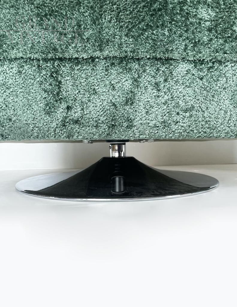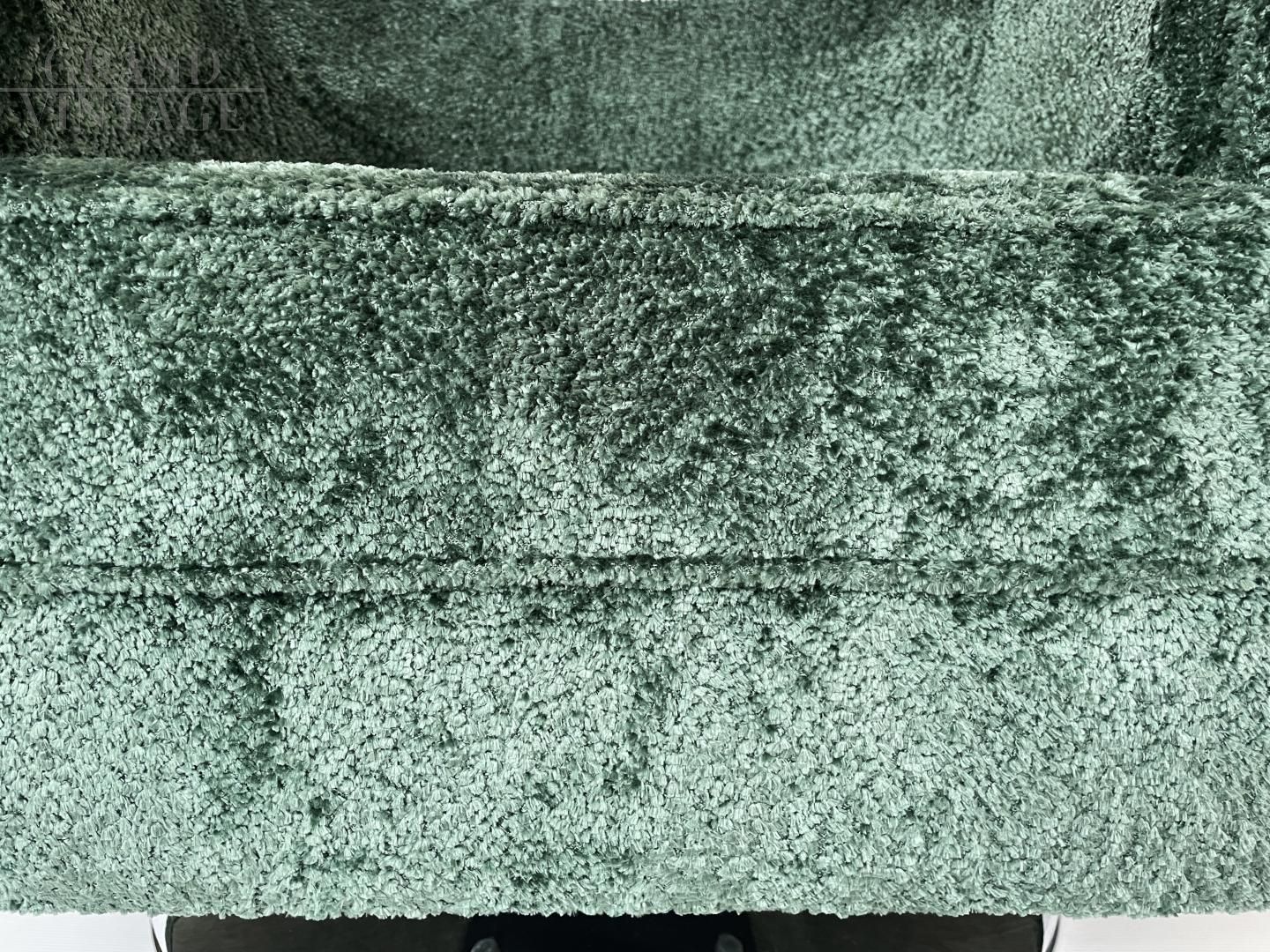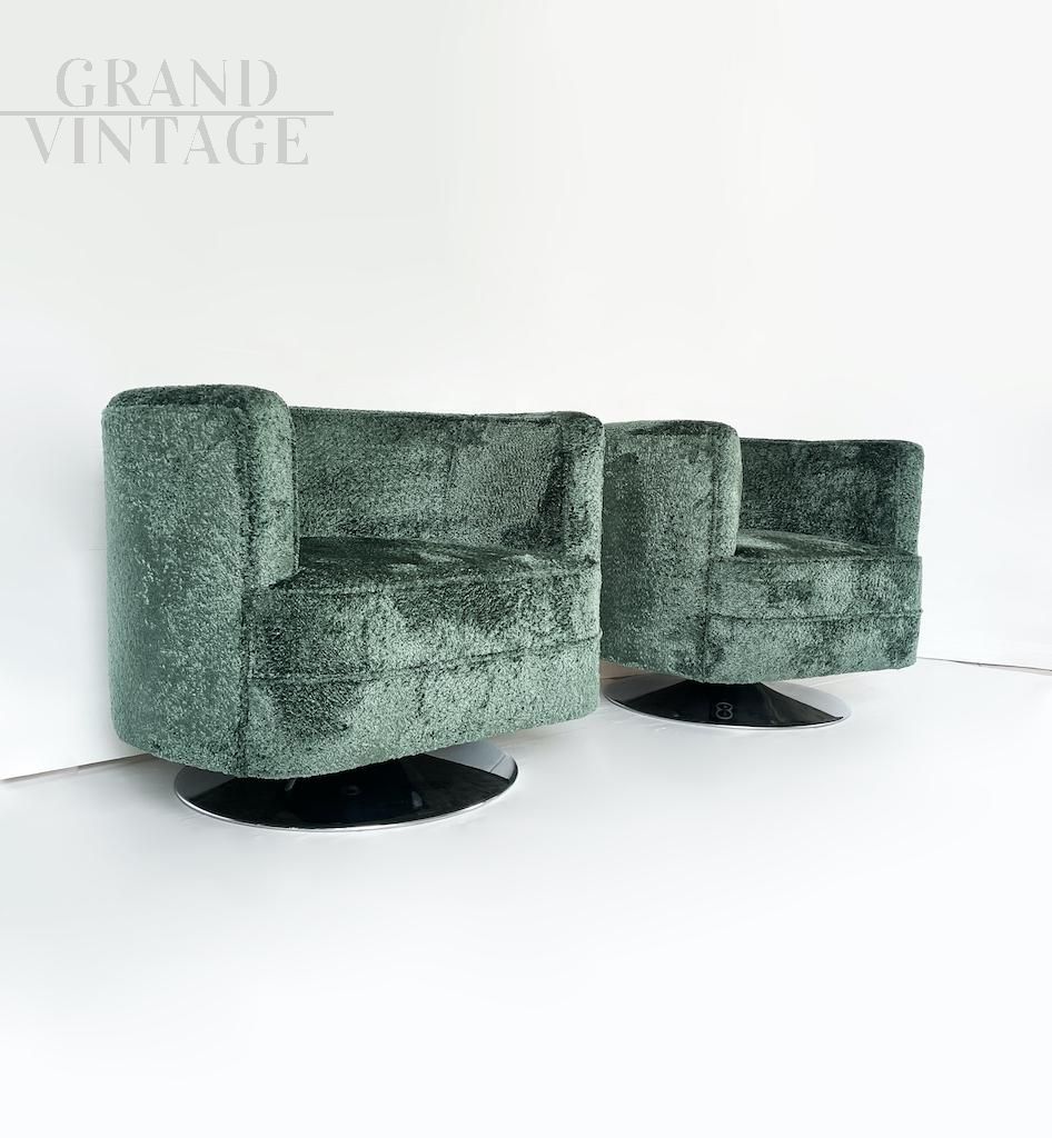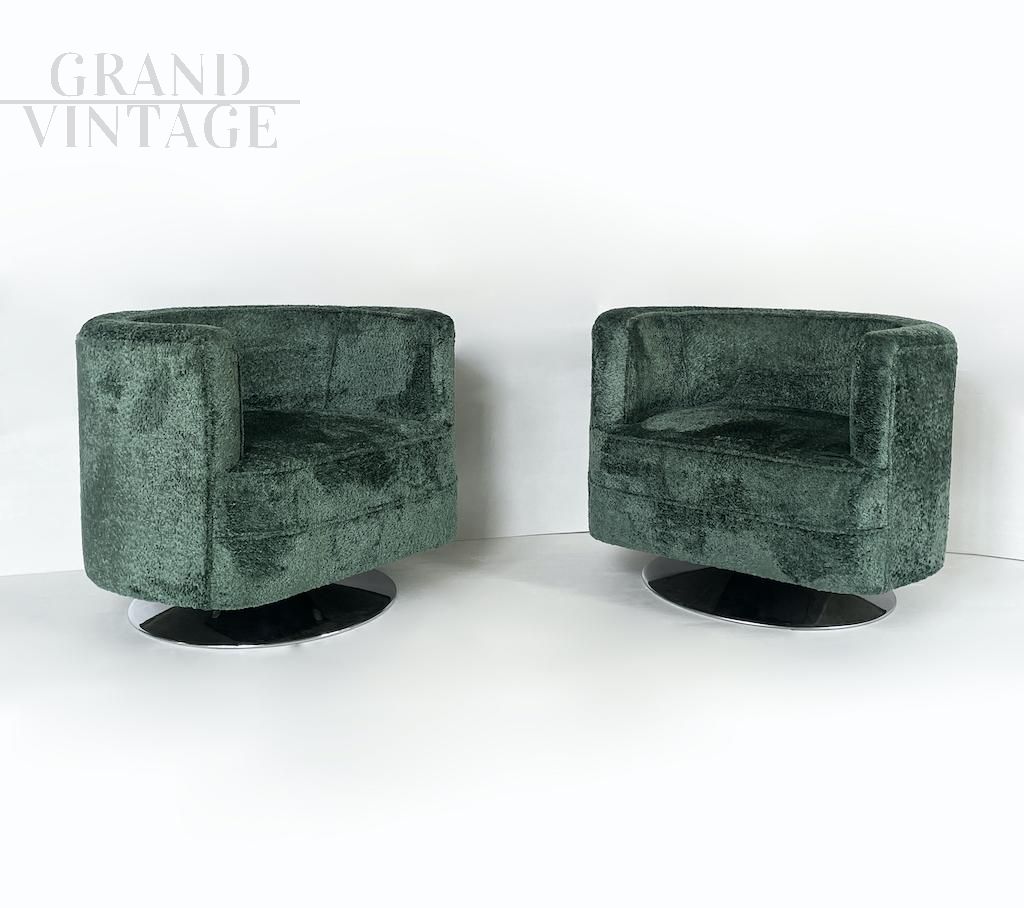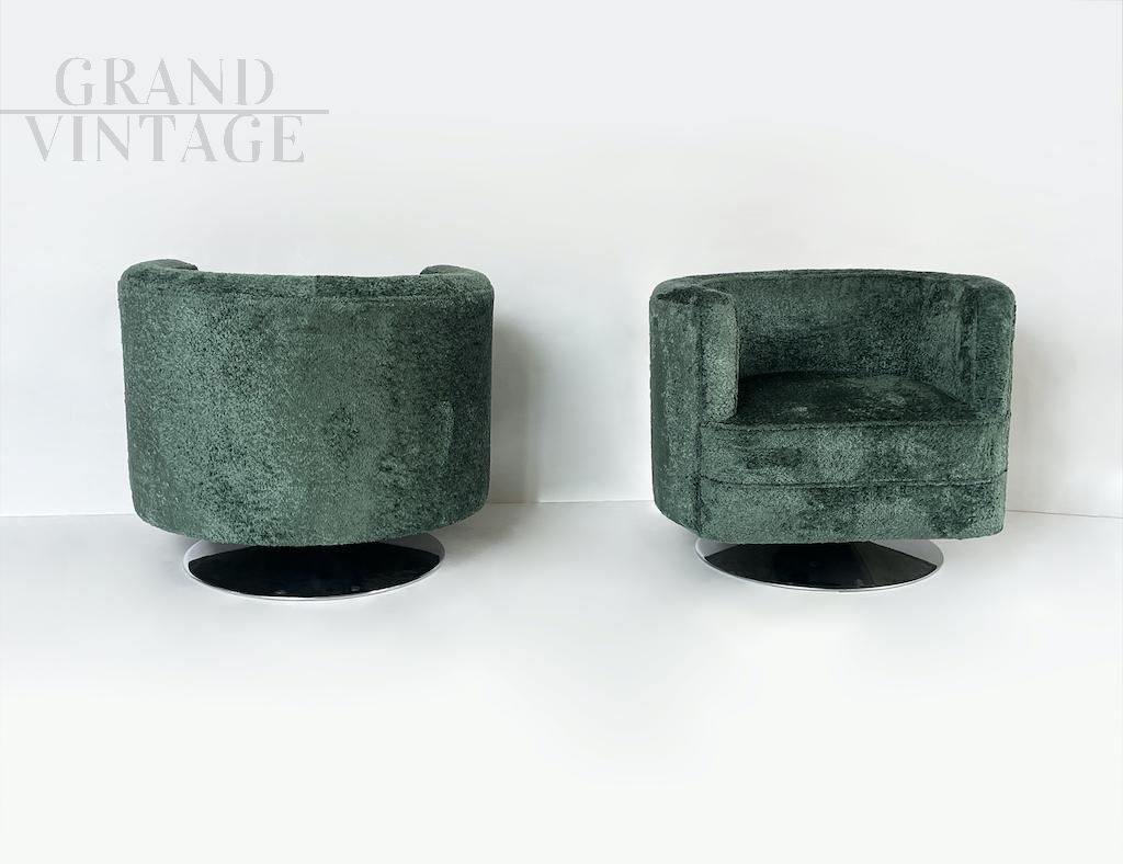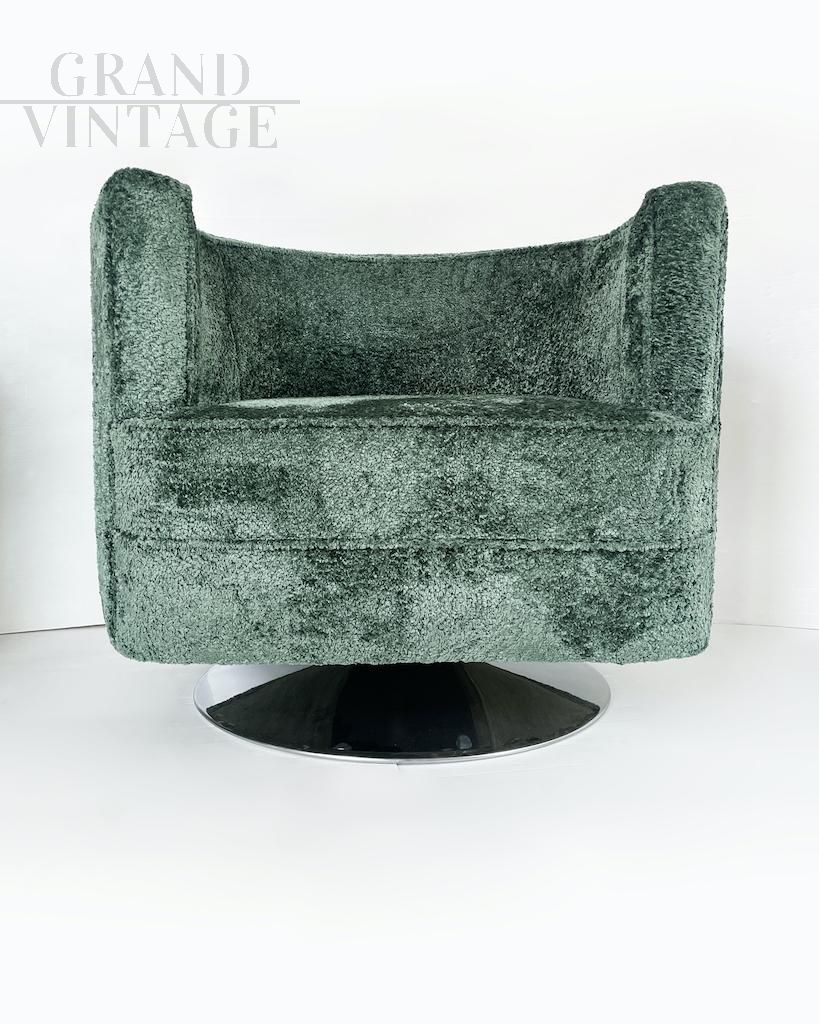 Particolari poltrone girevoli dalla comoda seduta e dalla forma tonda. Le poltrone sono interamente ricoperte da morbido tessuto bouclé verde e presentano una base circolare in acciaio. Italia anni '90.