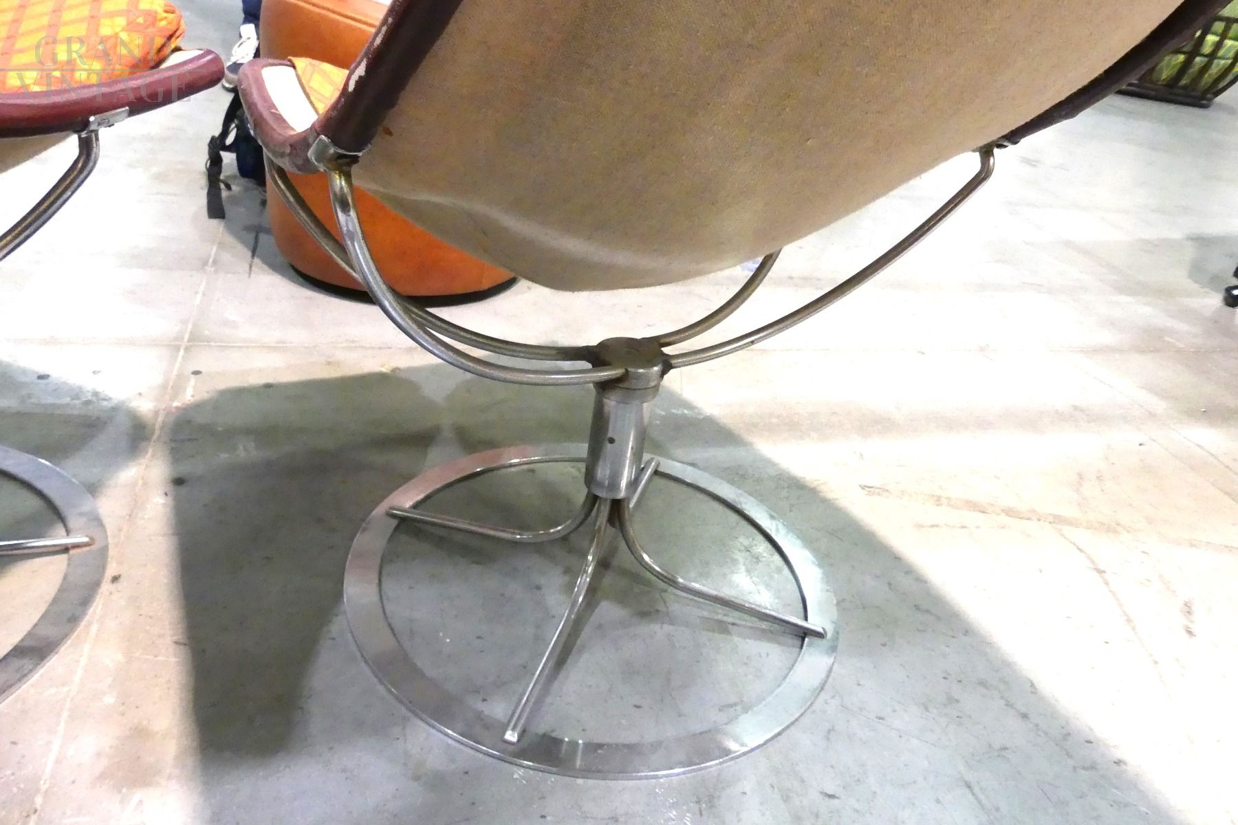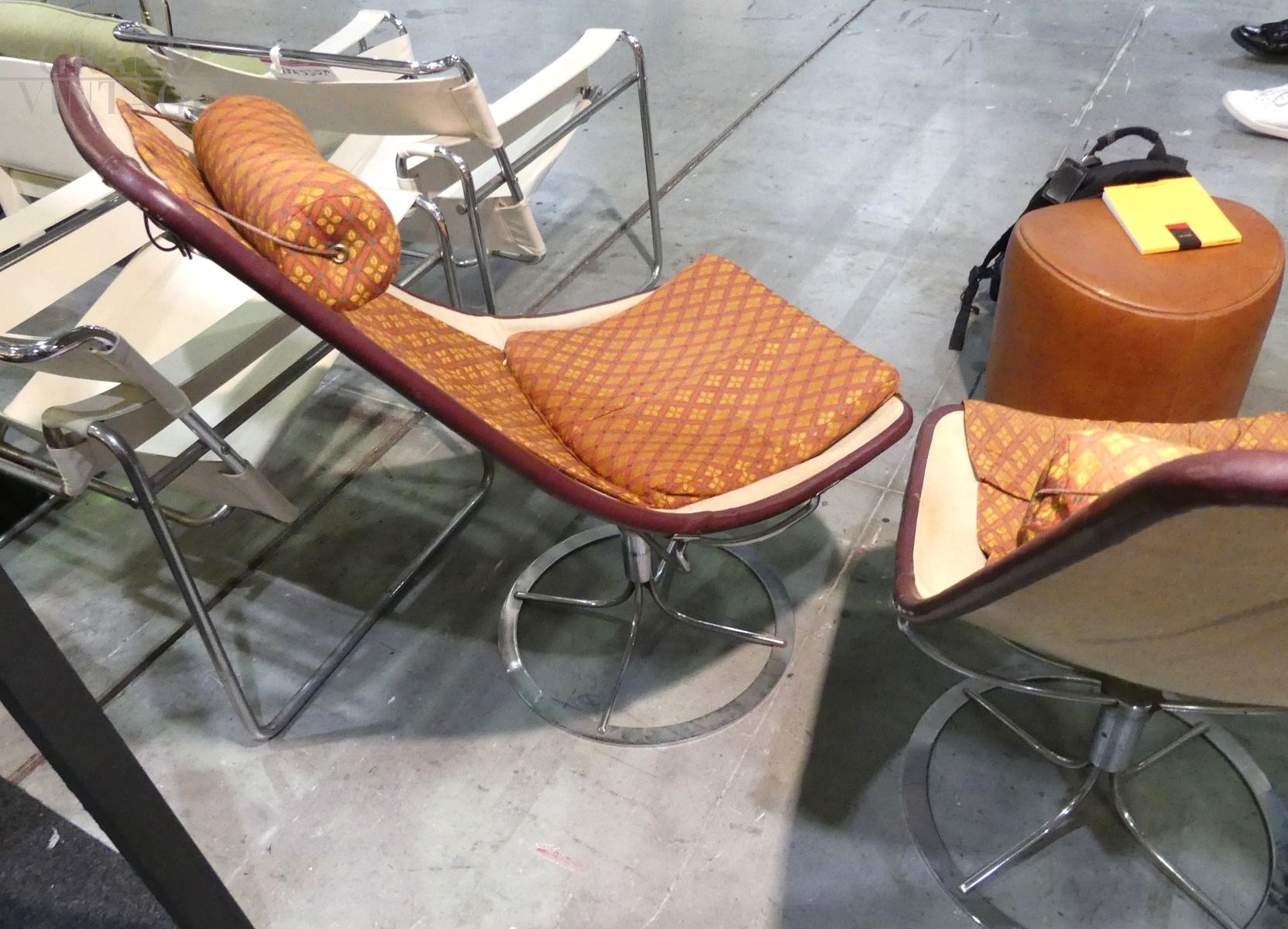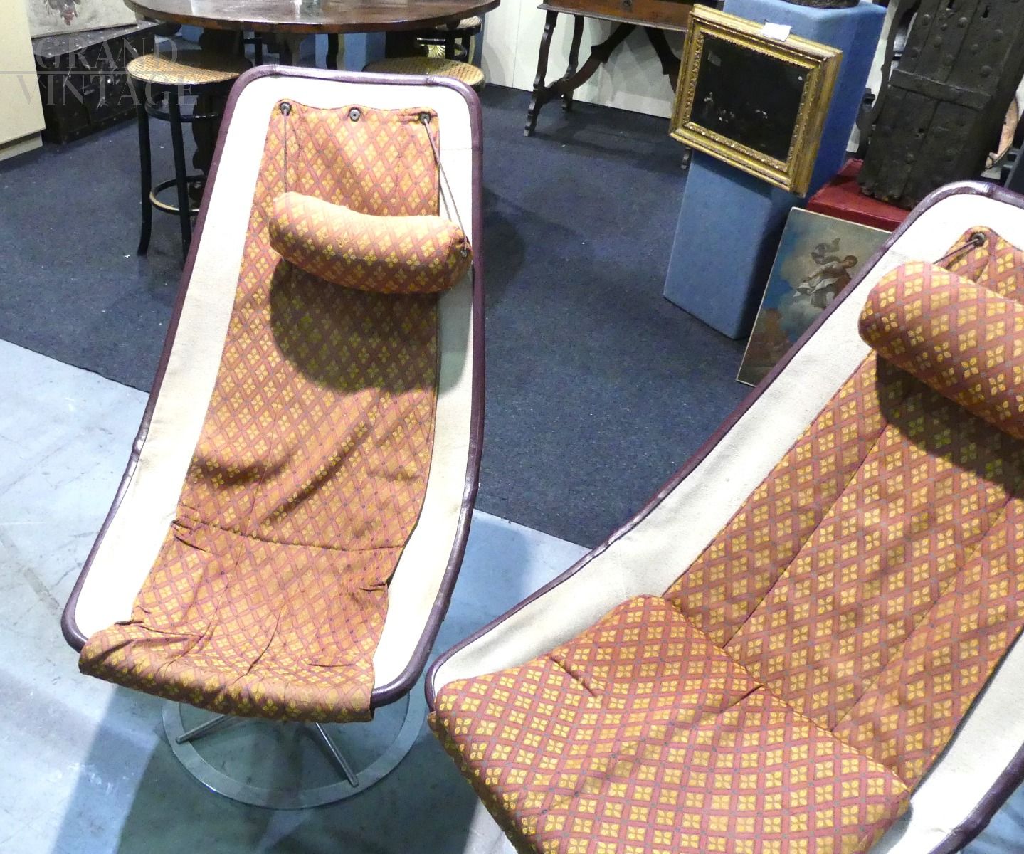 Coppia di poltrone Jetson di Bruno Mathsson per Dux, Svezia anni '60, con seduta in resistente tela di canapa e struttura in metallo rivestita in pelle o skai marrone. Sulla seduta, un rivestimento in tessuto marrone floreale con cuscinetto. Tutto originale, le poltrone sono in buone condizioni, presentano i naturali segni del tempo.