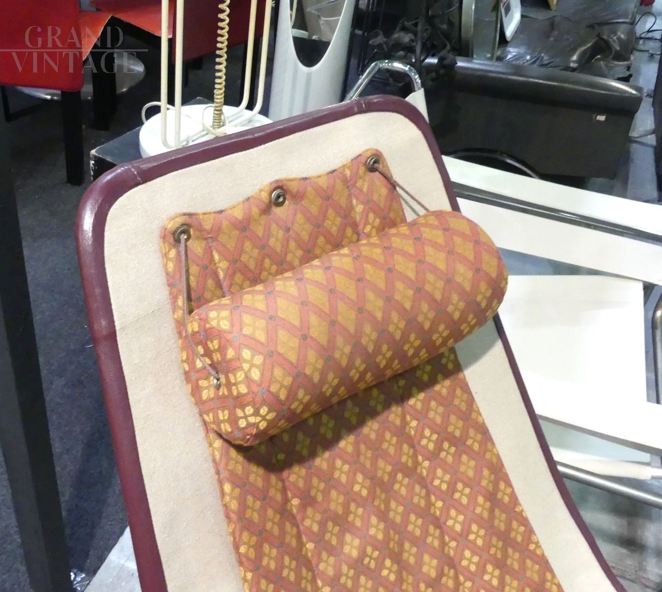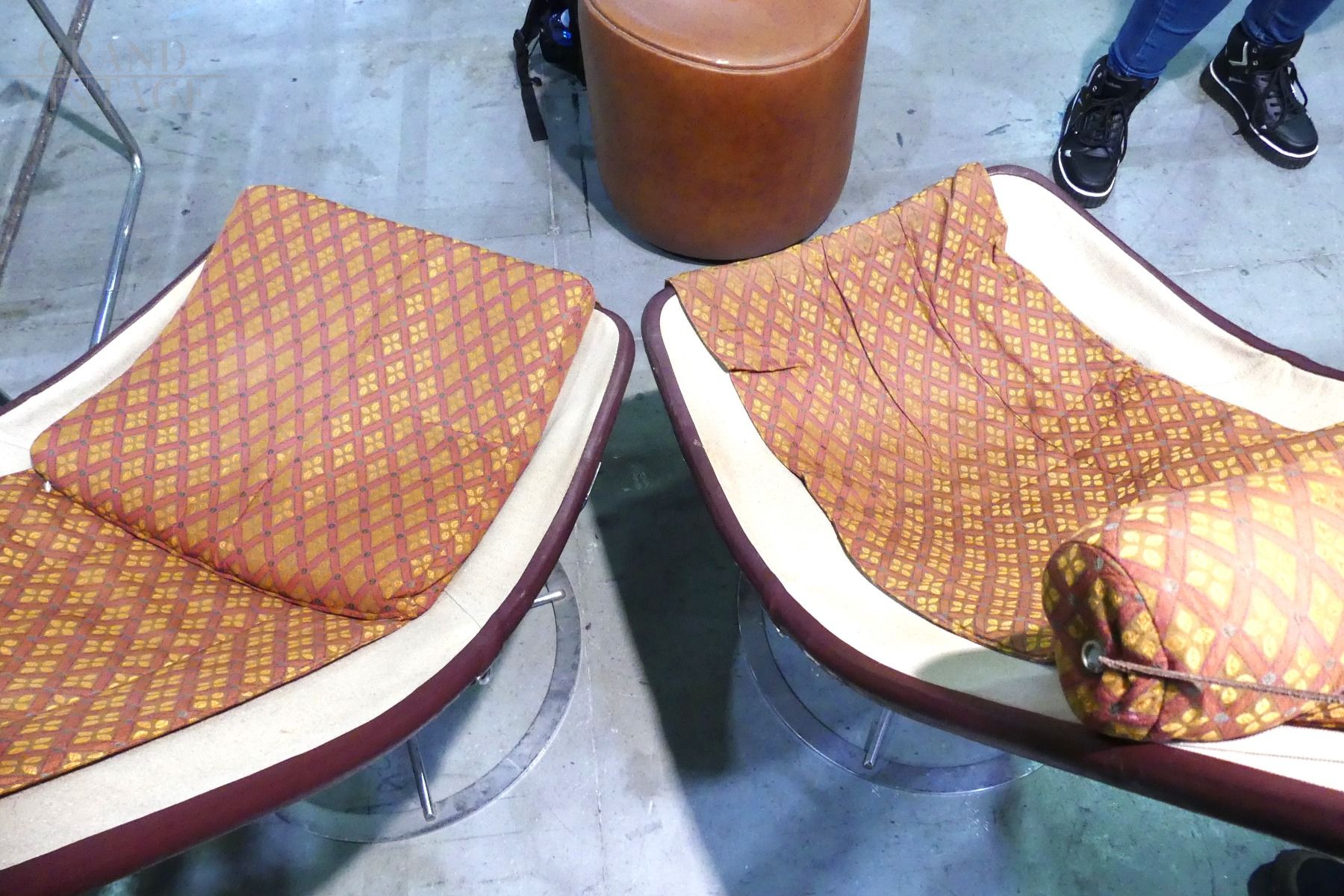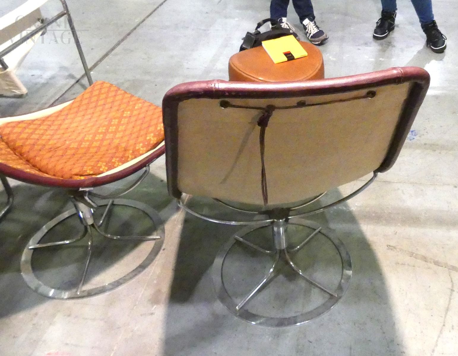 Coppia di poltrone Jetson di Bruno Mathsson per Dux, Svezia anni '60, con seduta in resistente tela di canapa e struttura in metallo rivestita in pelle o skai marrone. Sulla seduta, un rivestimento in tessuto marrone floreale con cuscinetto. Tutto originale, le poltrone sono in buone condizioni, presentano i naturali segni del tempo.