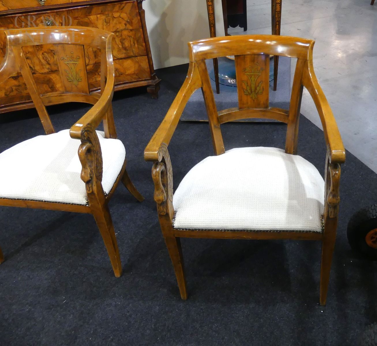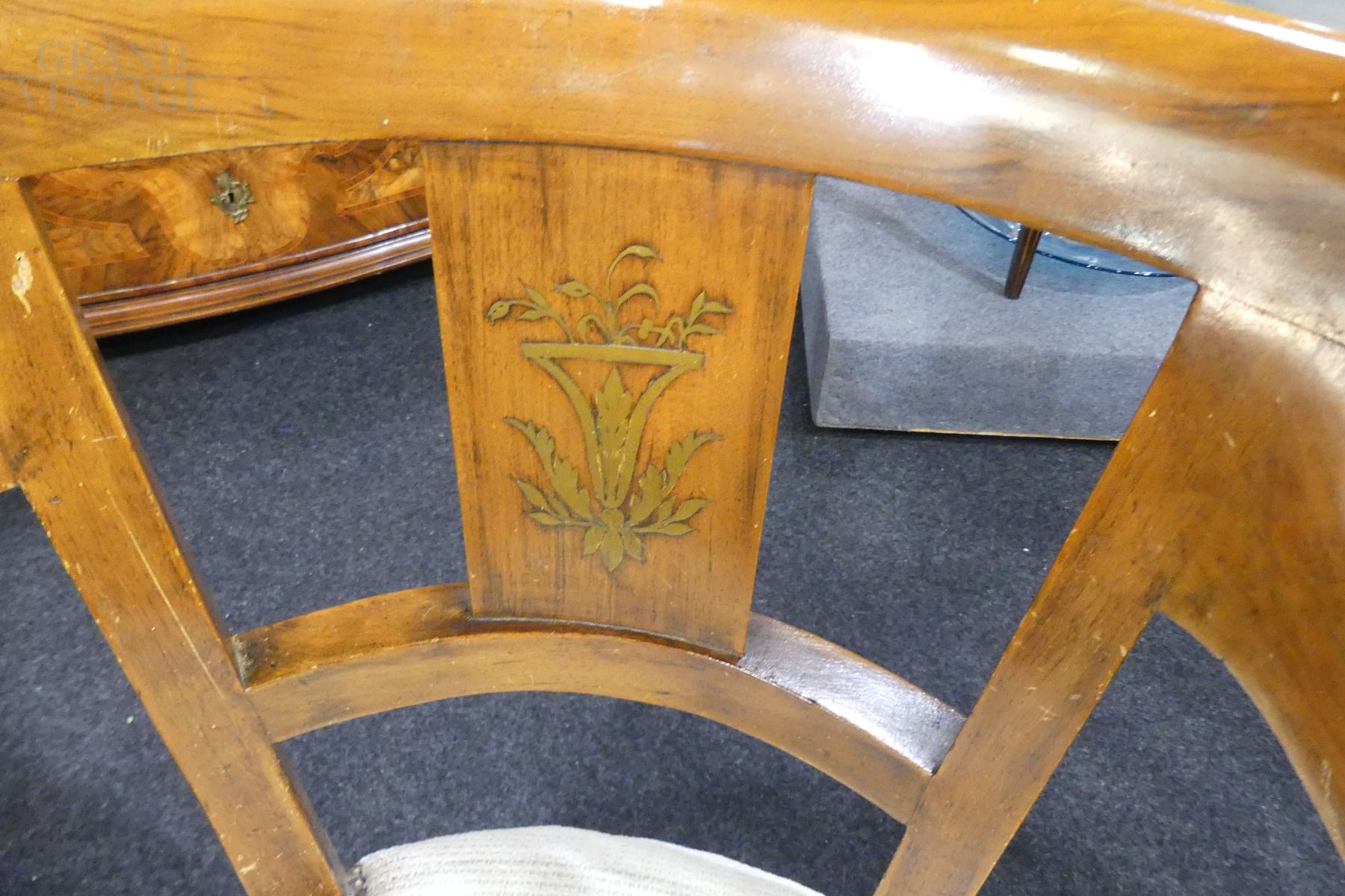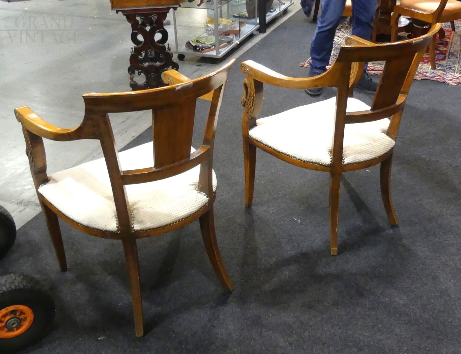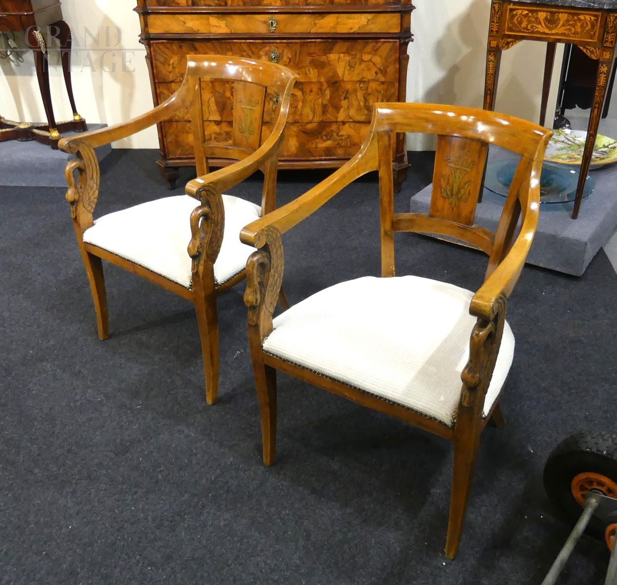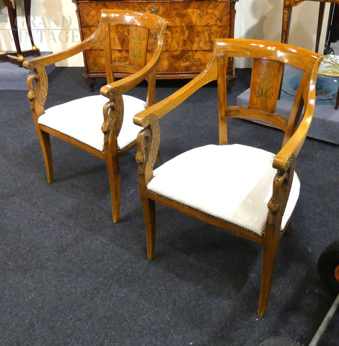 Bellissima coppia di poltrone antiche lombarde dei primi dell'800 in legno di noce biondo con intarsi floreali in ottone e braccioli intagliati a forma di cigno, gambe a sciabola.