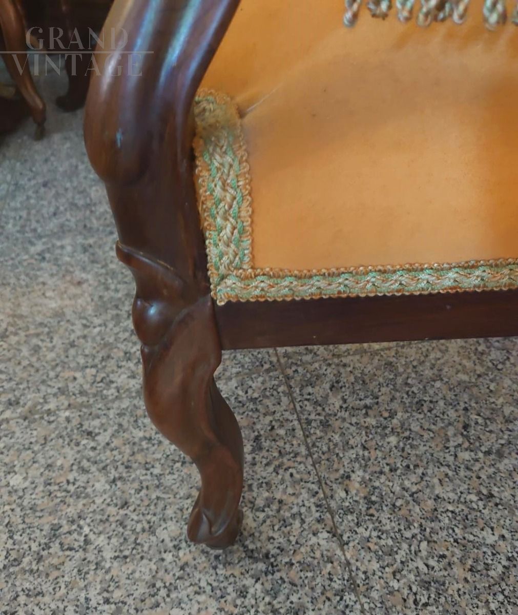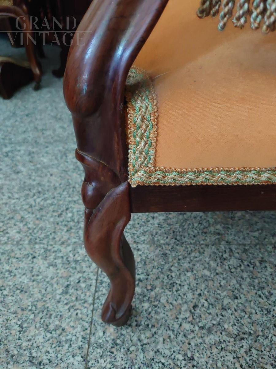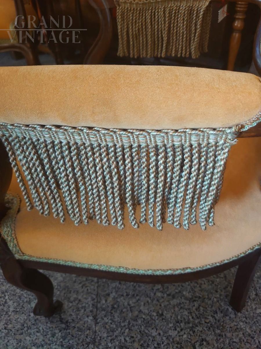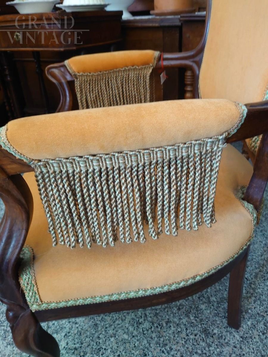 Coppia di poltrone antiche della metà dell'800 in legno di noce, rivestite in velluto arancio, con frange a cascata dai braccioli. In perfette condizioni.