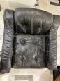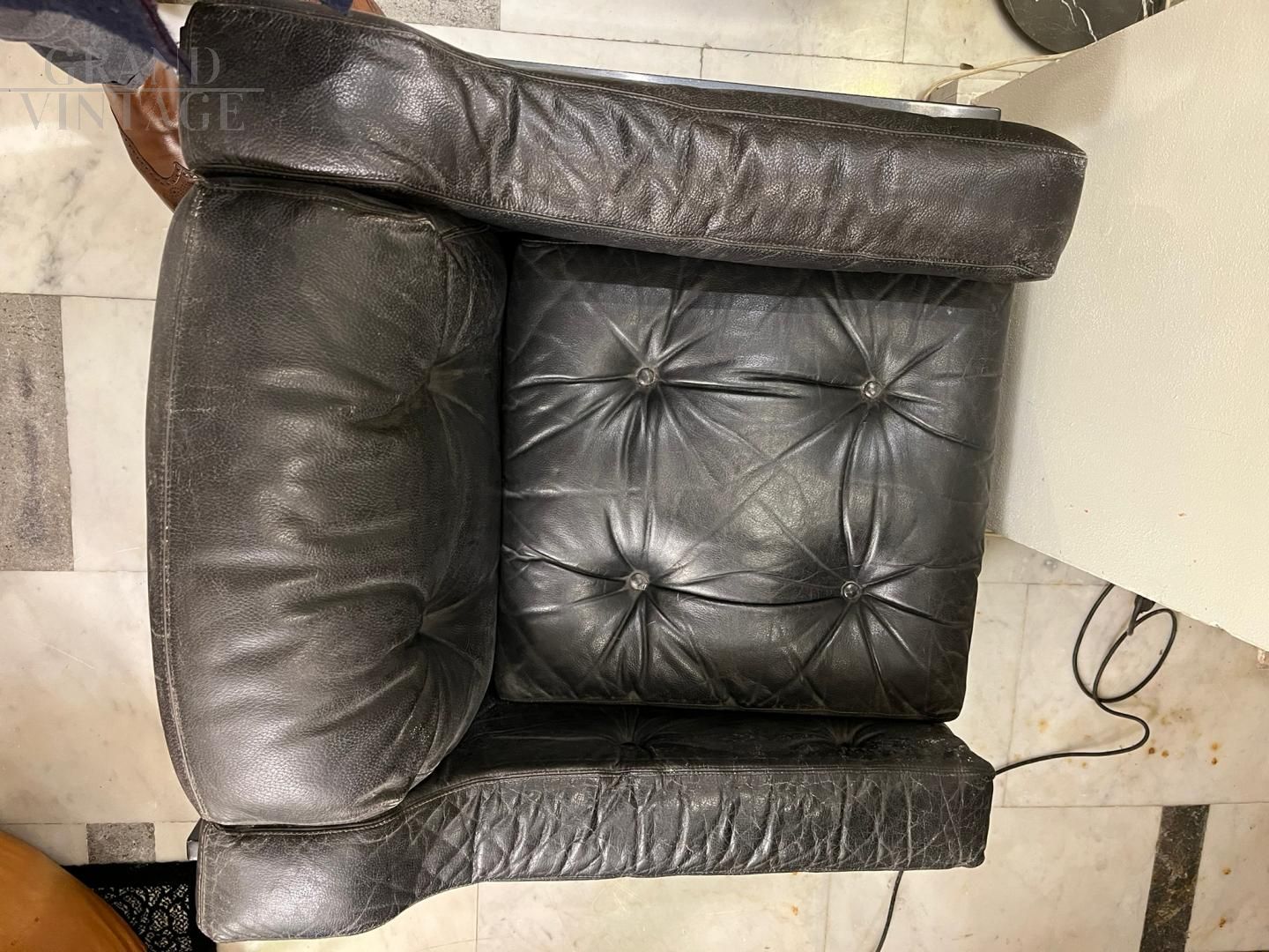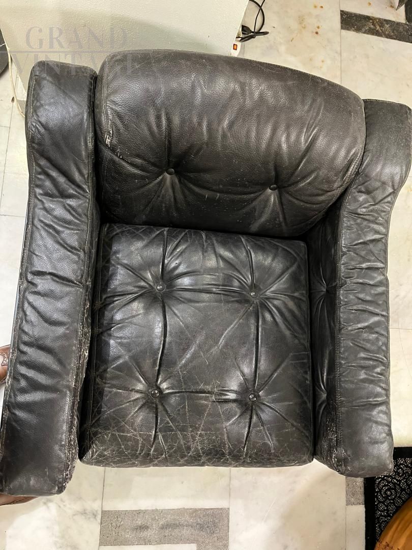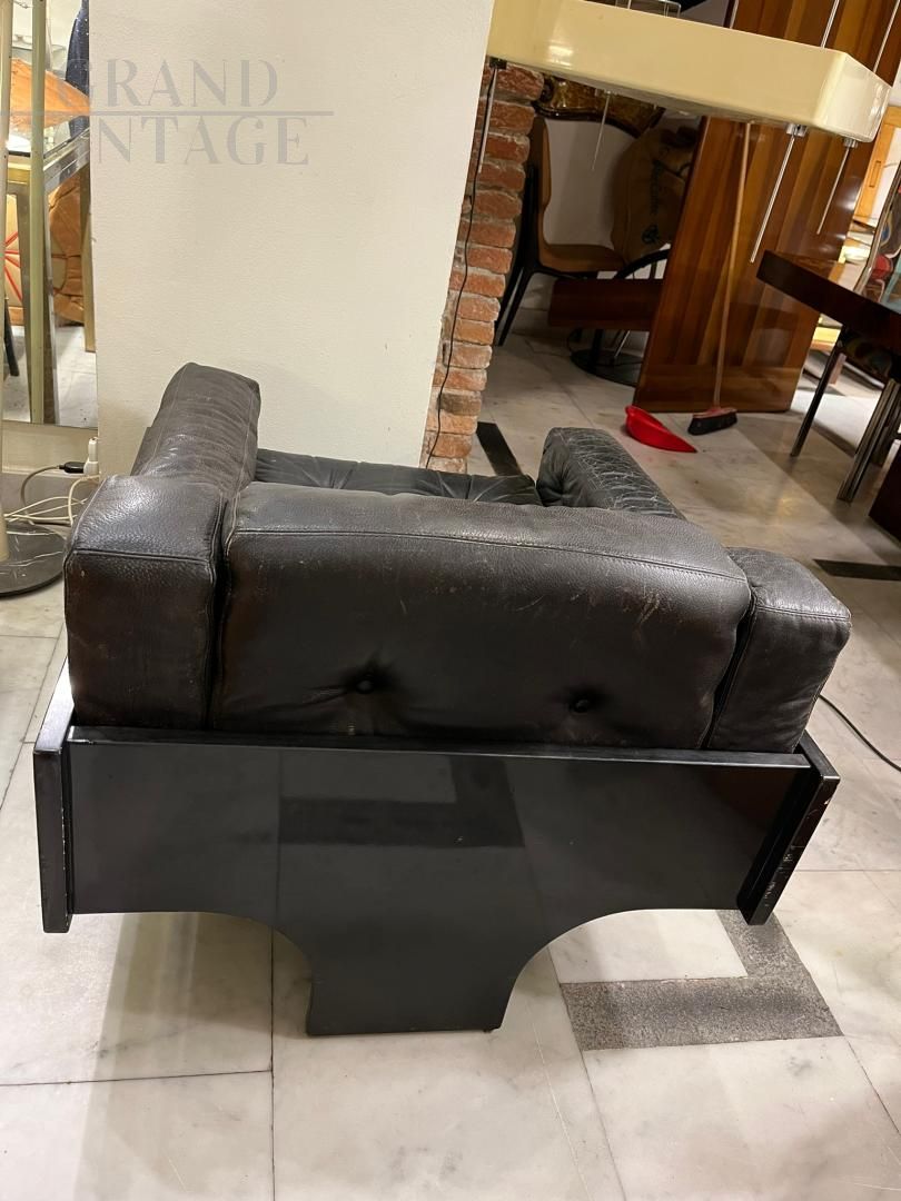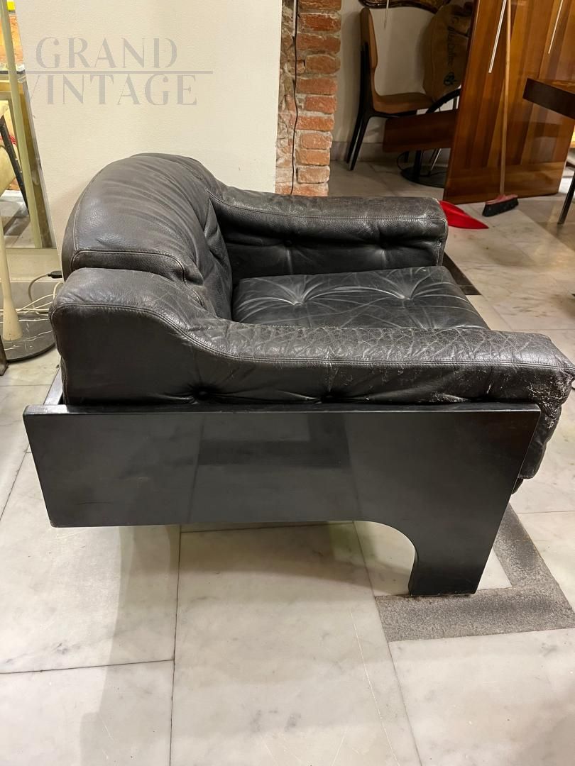 Coppia di poltrone design anni '70 modello Oriolo di Claudio Salocchi per Sormani, con rivestimento in pelle di colore nero e struttura in legno marrone scuro. Ottime condizioni, presenta i naturali segni del tempo sul rivestimento in pelle.