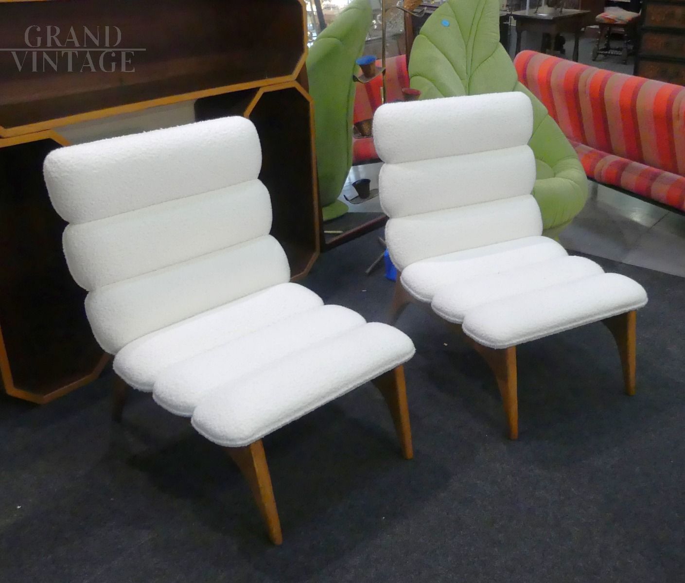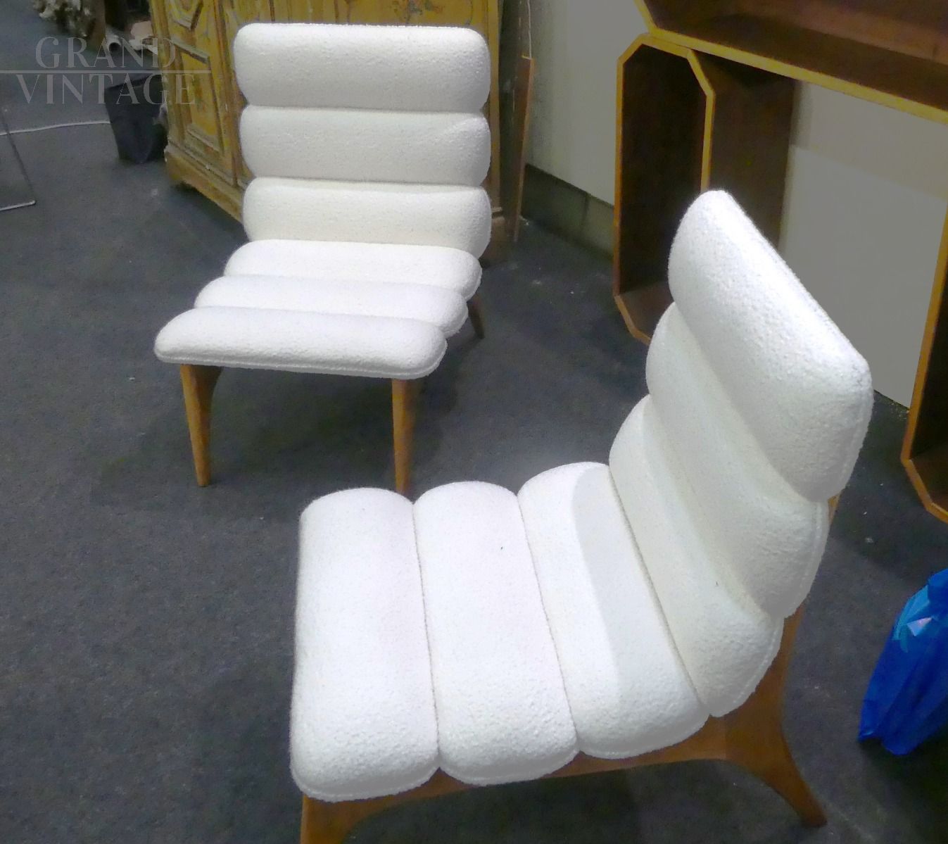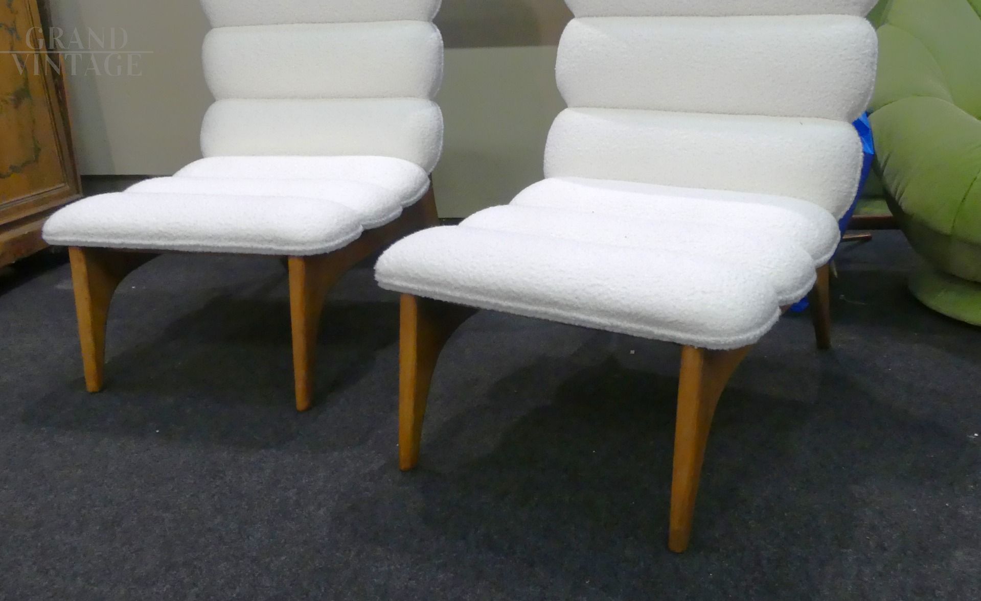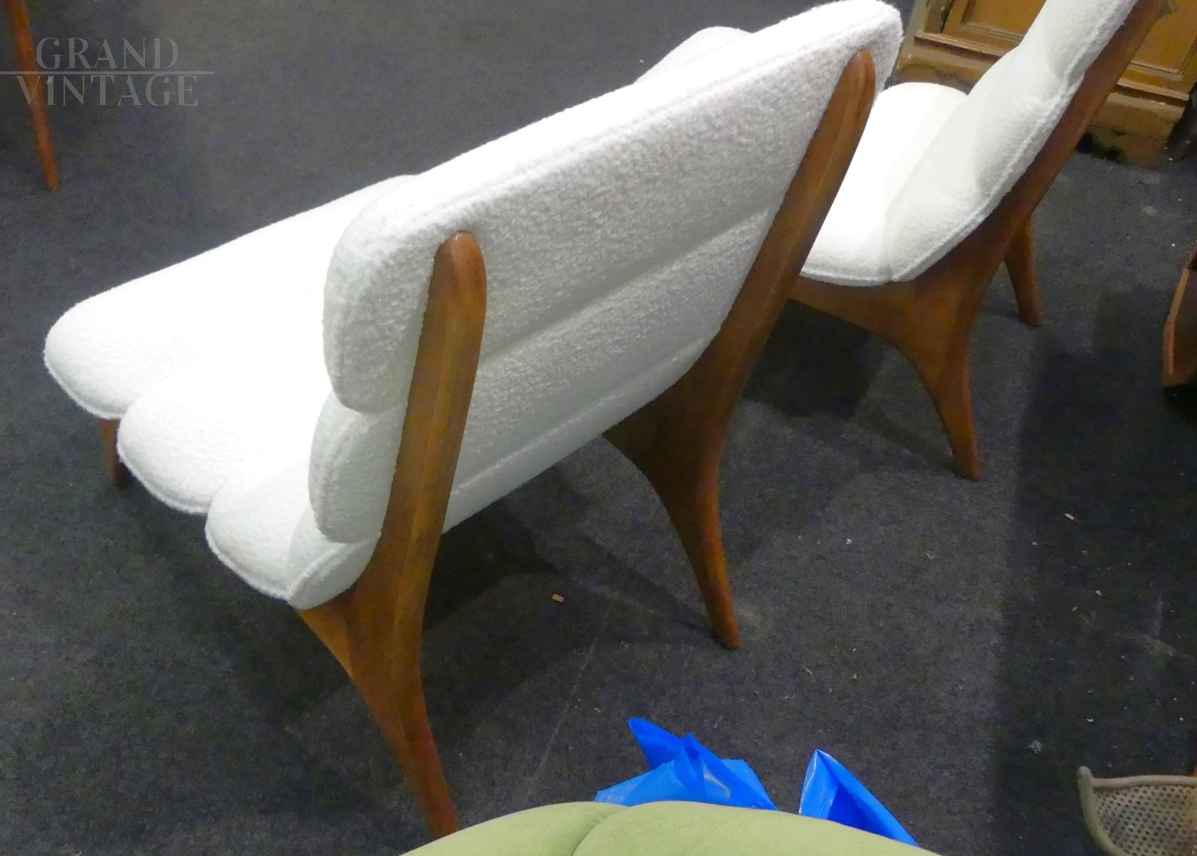 Coppia di bellissime poltrone vintage in stile danese in legno di faggio, con comoda seduta rivestita in lana bouclé bianca.