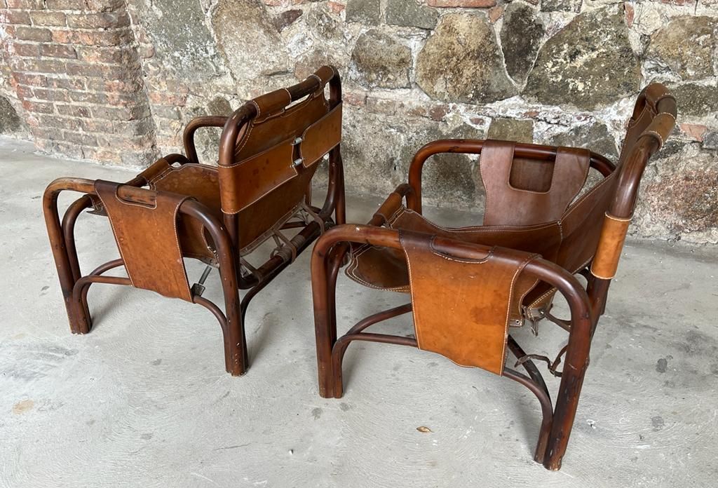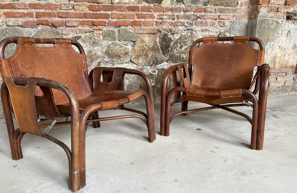 Le poltrone sono in buone condizioni, sono in patina, le parti in cuoio sono integre, necessitano di restauro nei lacci di chiusura dietro lo schienale e ad alcune cuciture che risultano allentate.