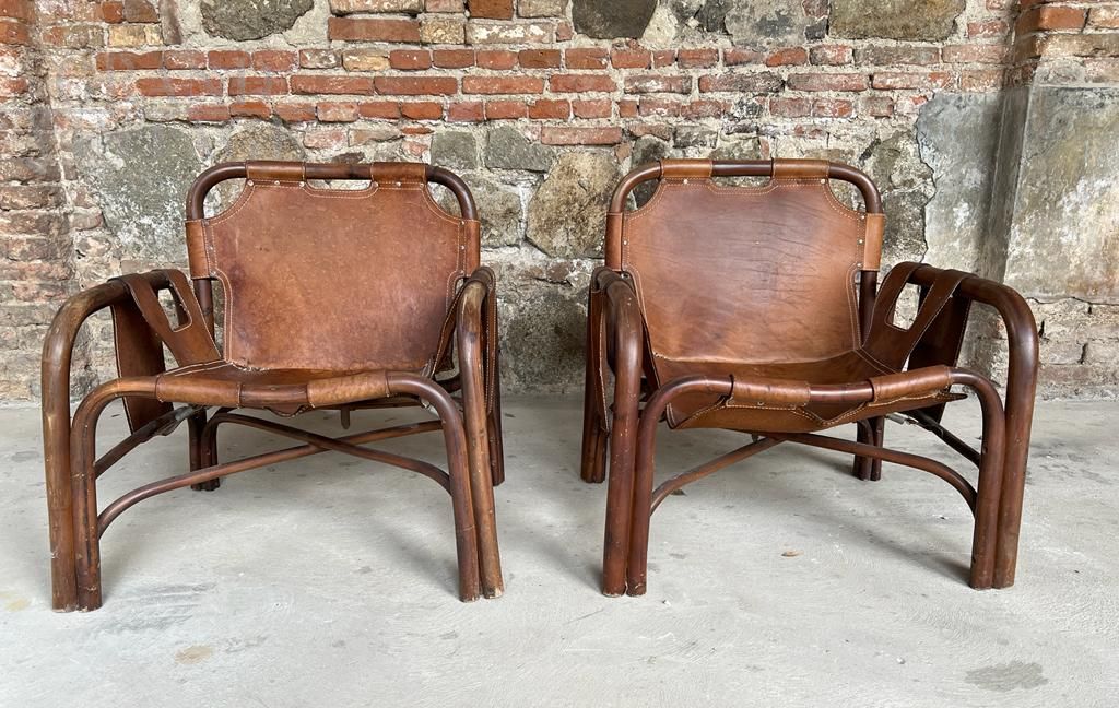 Coppia di poltrone design di Tito Agnoli in cuoio su struttura in bamboo e giunco, anni '60.