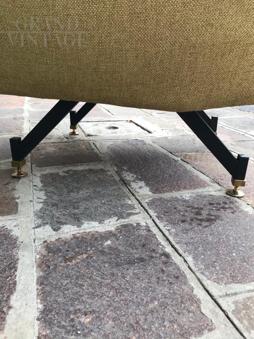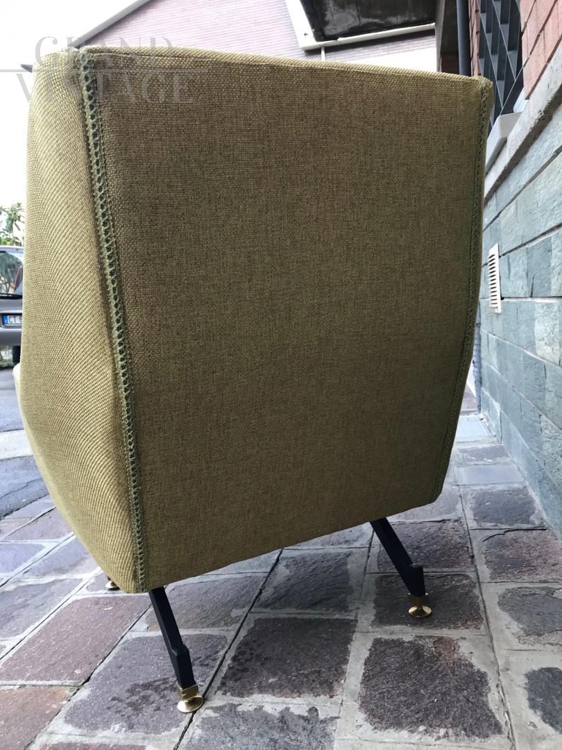 Coppia di poltrone anni '60 completamente imbottite e rifoderate. Struttura interna in legno e piedi in metallo nero opaco con puntali in ottone regolabili. Seduta ampia e comoda, non reclinabili. Cm 70x 75x 90 in altezza.
