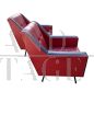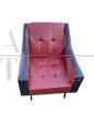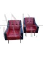 Inconsueta coppia di poltrone vintage italiane in ecopelle con un particolare abbinamento di colori, rosso e nero. La seduta è molto comoda, le misure poco ingombranti.