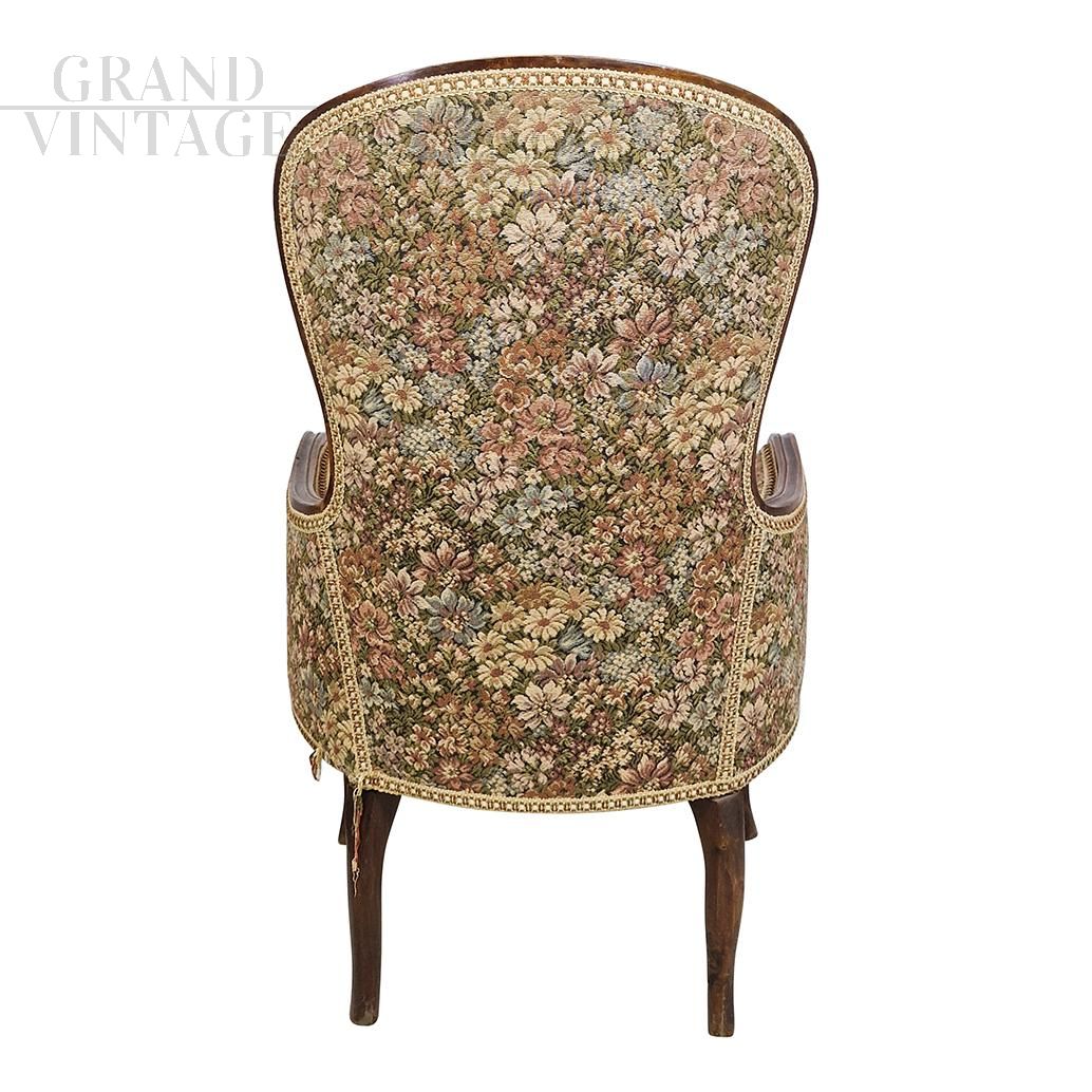 Coppia di poltrone vintage classiche con telaio in legno di noce e tessuto damascato con motivi floreali, Italia anni '50.