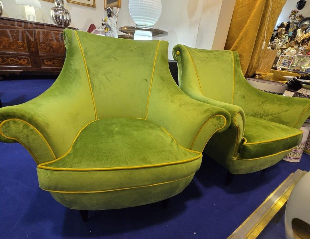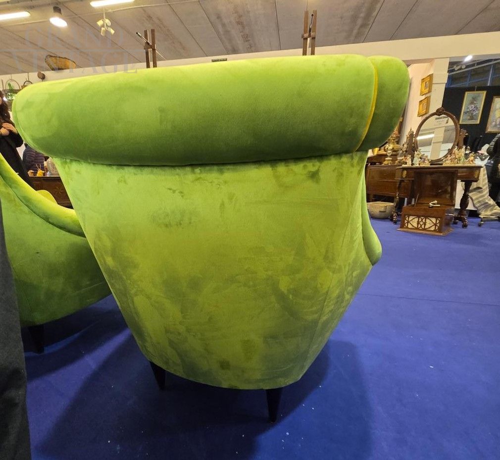Coppia di poltrone dal design particolare rivestite velluto verde chiaro, come nuove.