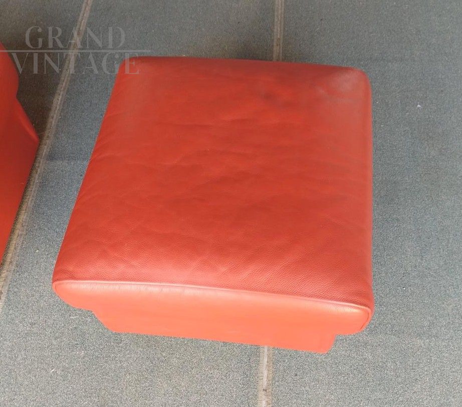 Coppia di pouf design di Matteo Grassi in pelle color arancione scuro, completi di etichetta originale e codice registrazione ad attestarne l'originalità.