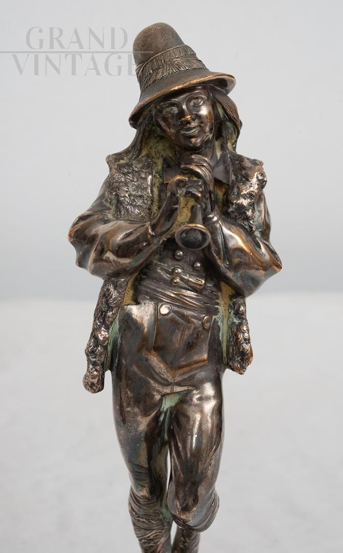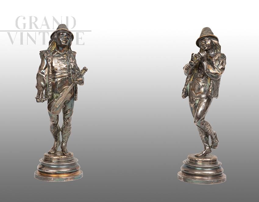 Coppia di sculture antiche in bronzo argentato raffiguranti due suonatori firmate Lalouette (1826-1883). Entrambe le sculture sono abbigliate con abiti dell'epoca e raffigurano un suonatore con flauto e un suonatore con violino. La finezza del cesello e l'originalità del soggetto fanno chiaro riferimento alla cultura francese di seconda metà ottocento. Provenienza: Francia XIX secolo.