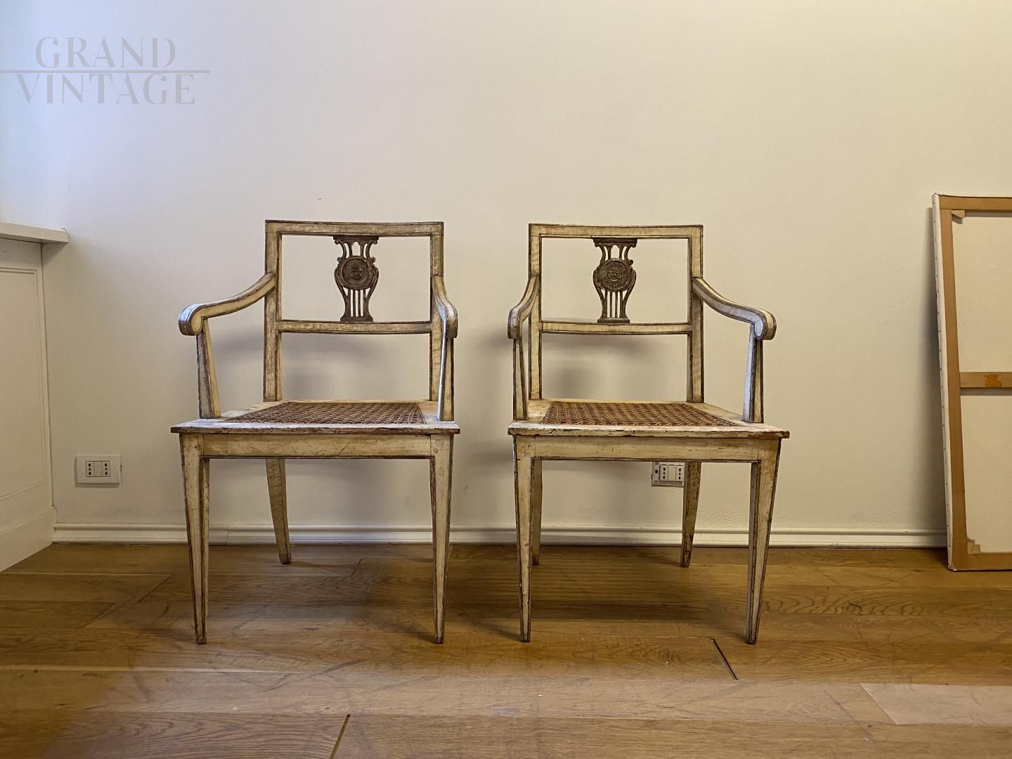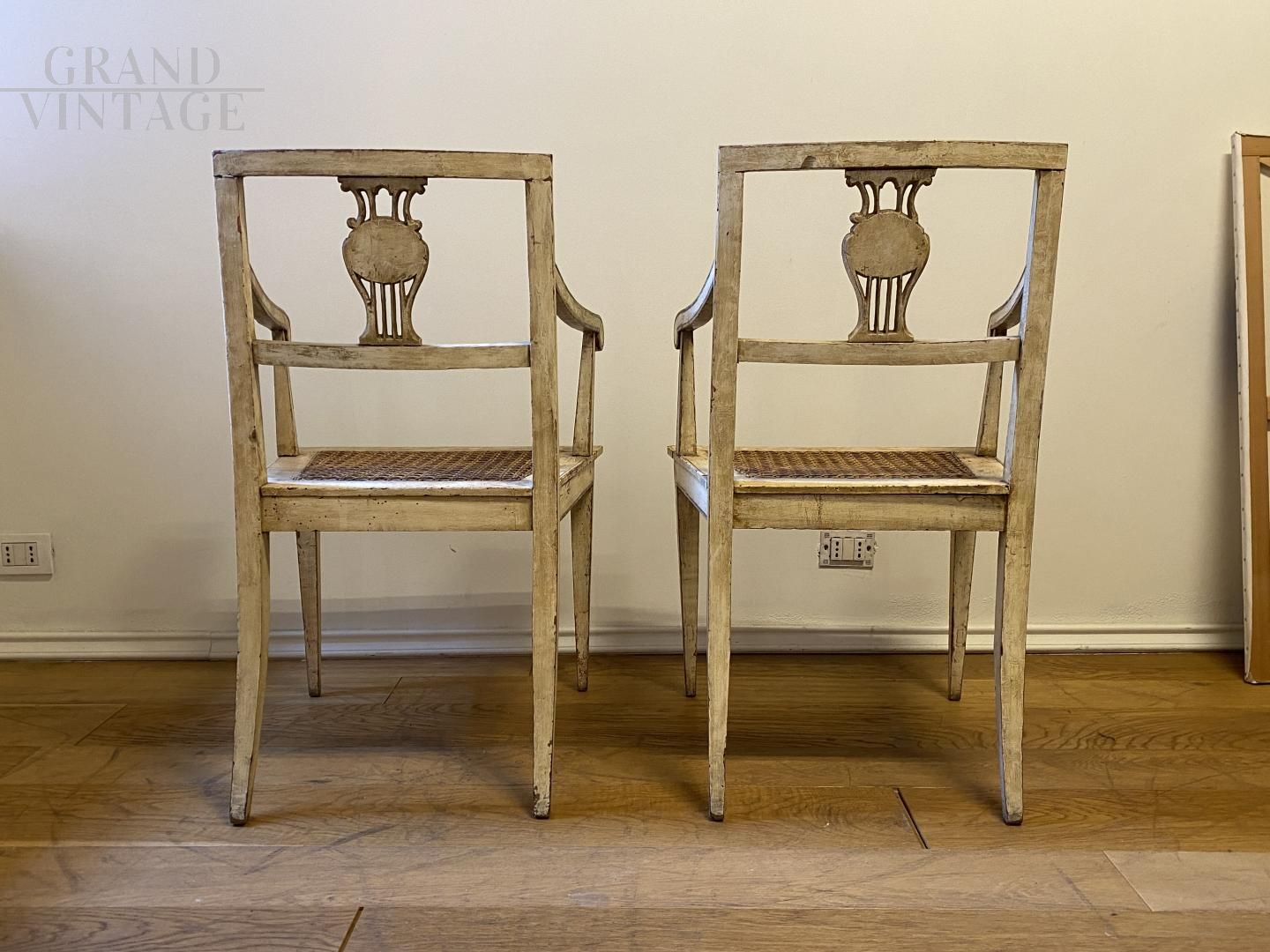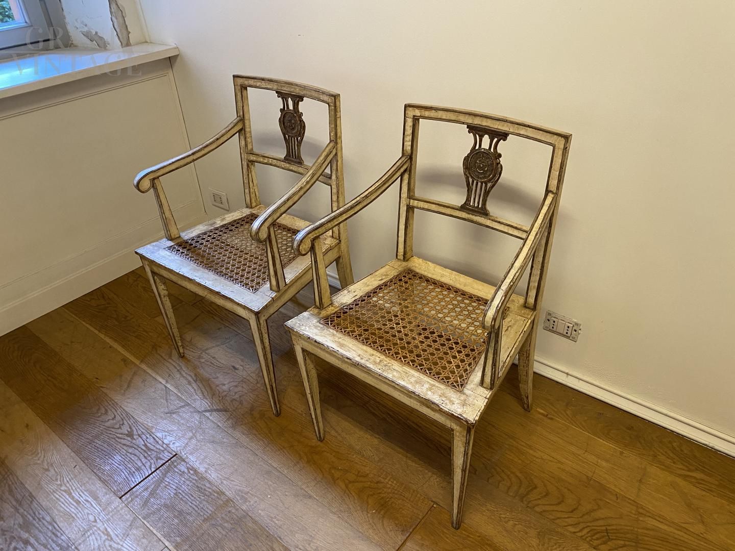 Coppia di sedie poltroncine antiche lombarde del '700 in patina, laccate e dorate, con ogni dettaglio autentico dell'epoca. Seduta in paglia di Vienna anch'essa originale e intelaiata a mano.