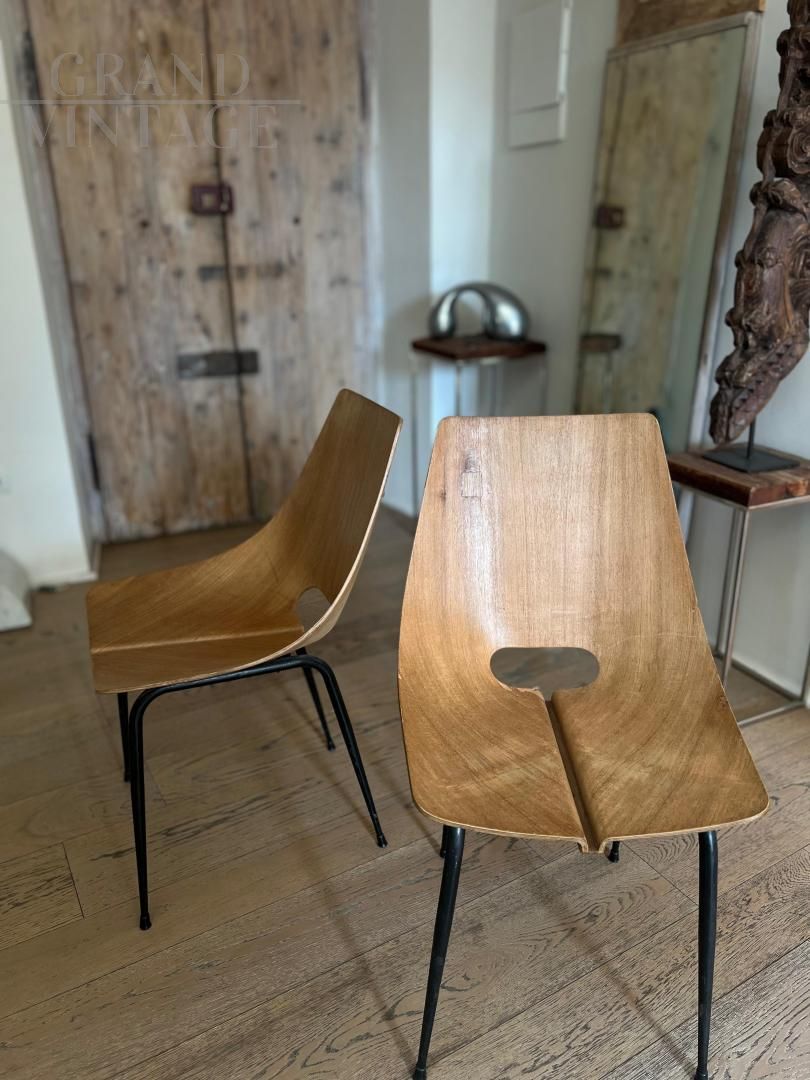 Design d’avanguardia. Espressione pura del modernismo italiano. Una rara coppia di sedie originali disegnate da Carlo Ratti negli anni ’60, esempio emblematico dell’innovazione progettuale del secondo dopoguerra. La scocca è realizzata in multistrato curvato a vapore, con un taglio centrale scultoreo che conferisce leggerezza visiva e una sofisticata tensione materica. La particolare fessura centrale e l’intaglio ovale posteriore sono soluzioni ergonomiche e formali insieme, che dimostrano la straordinaria capacità del designer di fondere estetica e funzionalità. Le gambe, in metallo verniciato nero, affusolate e leggermente arcuate, slanciano la struttura, contribuendo a una silhouette snella ed elegante — perfettamente coerente con i dettami del design radicale italiano e scandinavo degli anni '60.