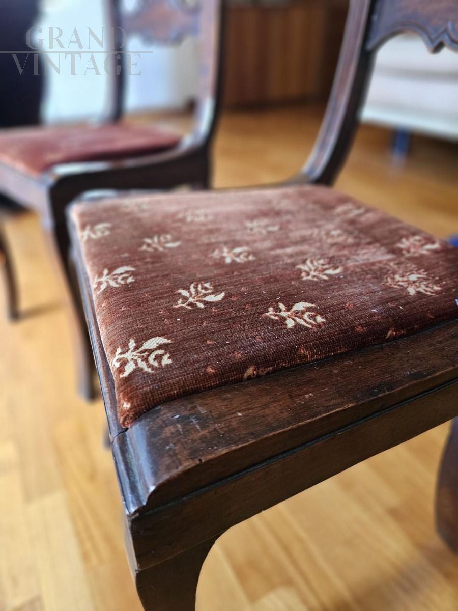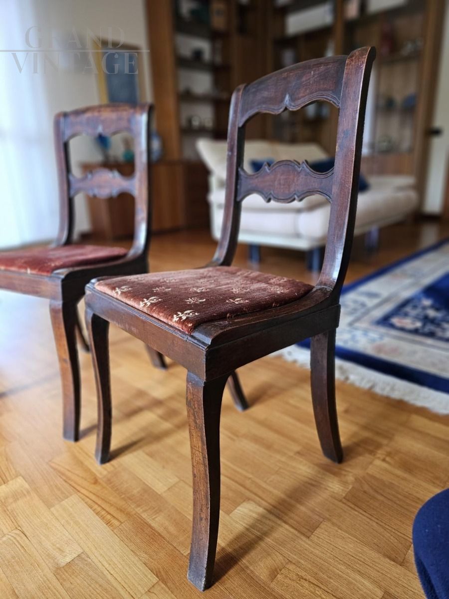 Coppia di sedie antiche di ottima fattura perfettamente tenute ed ancora utilizzabili, databili intorno alla fine dell'800. La linea estetica pregevole e le ottime proporzioni ne fanno un set di sedute dall'immagine leggera e aggraziata. Schienale con fine lavorazione di linea essenziale e armoniosa. La seduta è in velluto marrone con motivi floreali, in ottimo stato. Possibilità di acquistare una terza sedia identica ma da rifoderare.