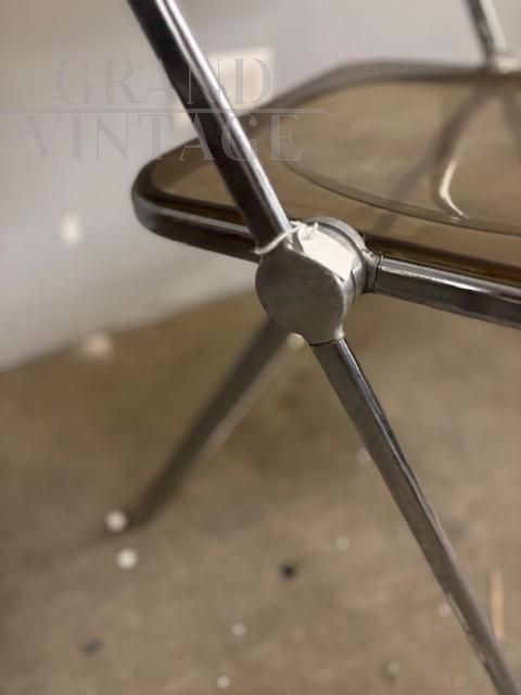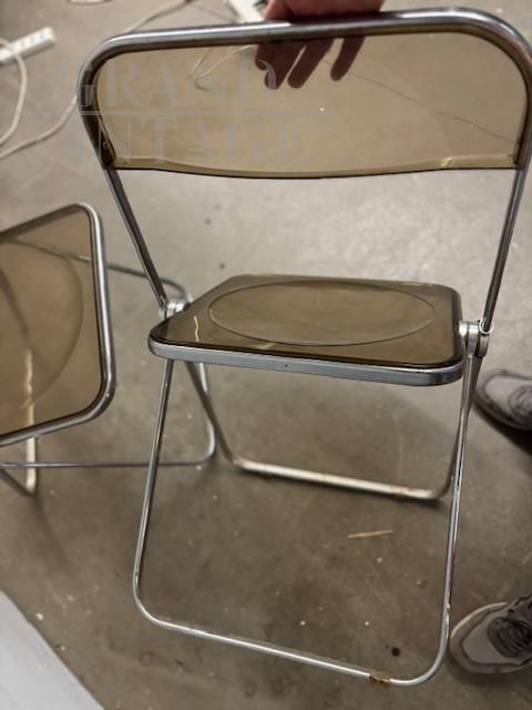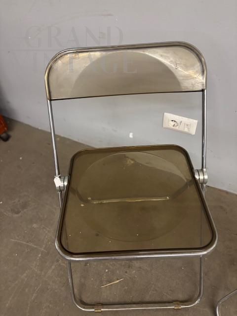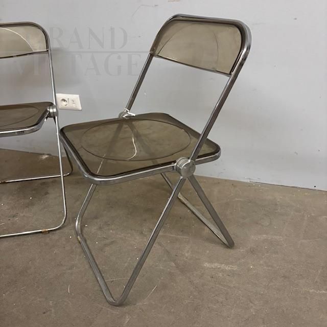 Coppia di sedie pieghevoli Plia di Giancarlo Piretti per Anonima Castelli in plastica trasparente grigia fumé, Italia 1967, firmate e in buono stato, presentano i normali segni del tempo.
