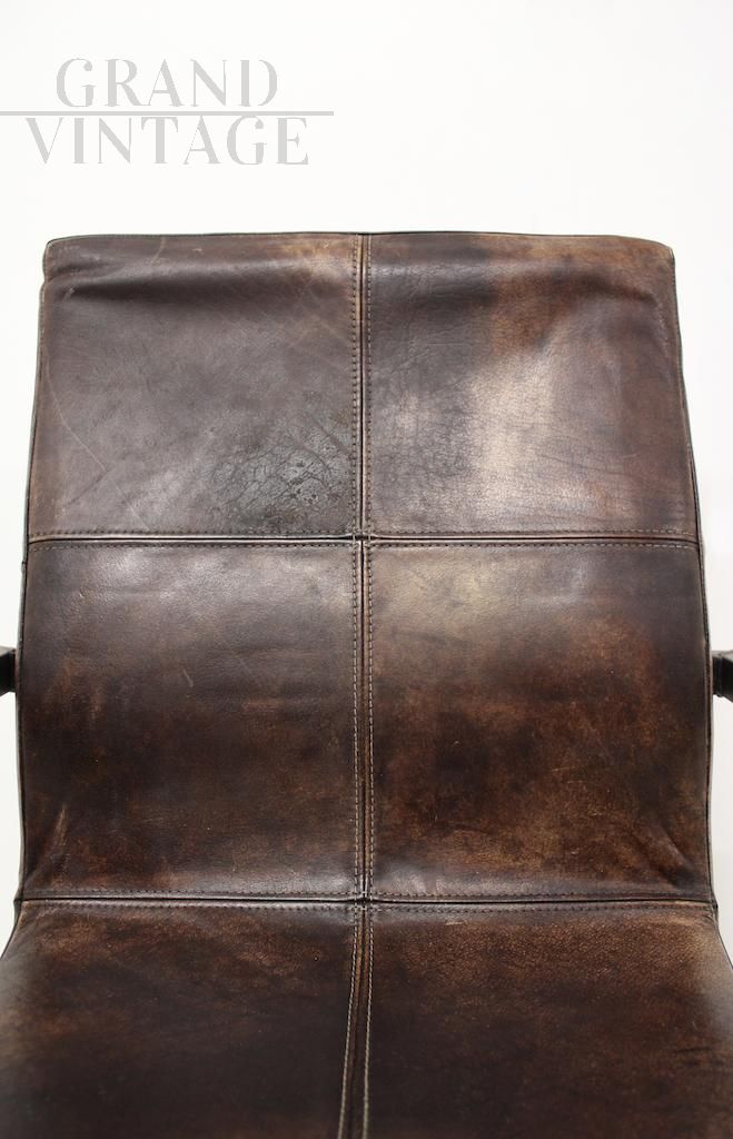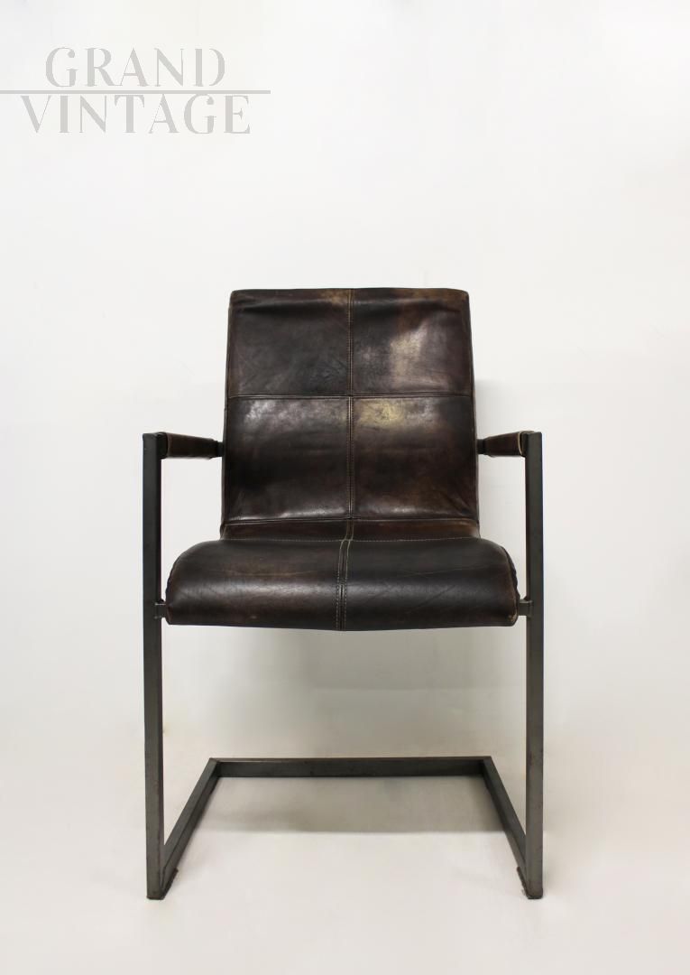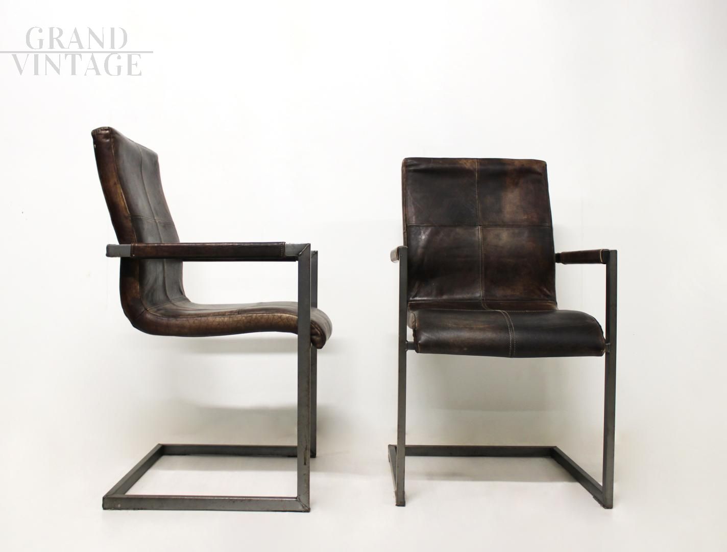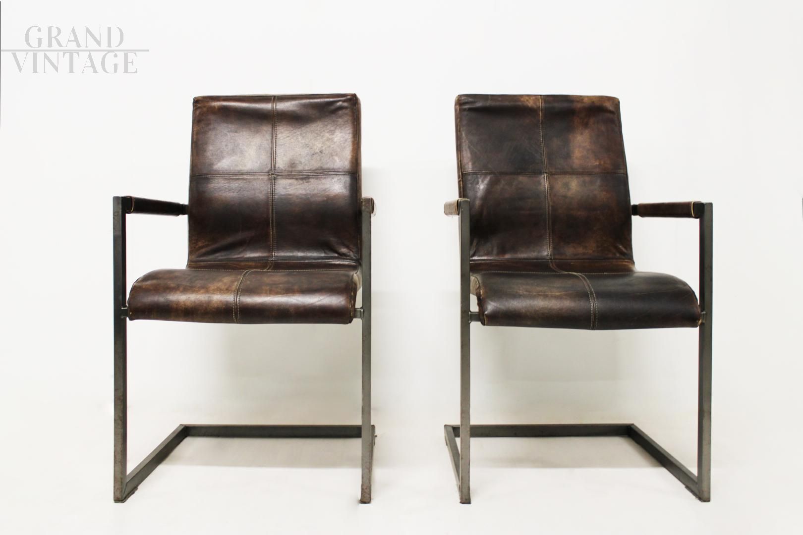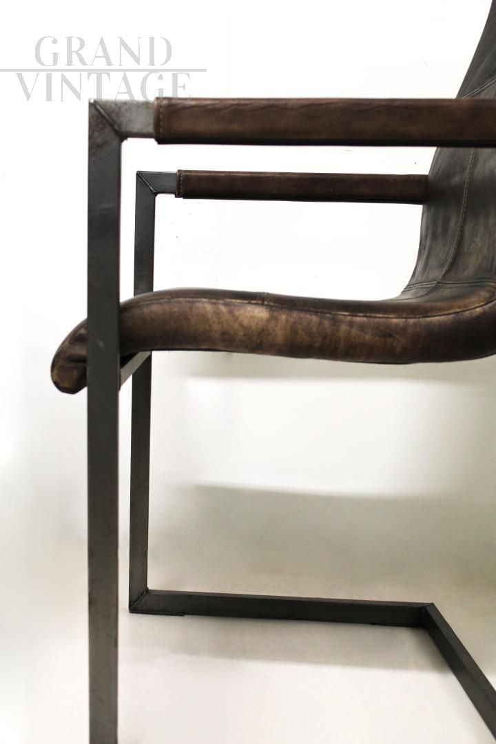 Particolare coppia di sedie poltroncine stile vintage modernariato in pelle marrone con struttura in ferro, una produzione contemporanea di provenienza italiana.