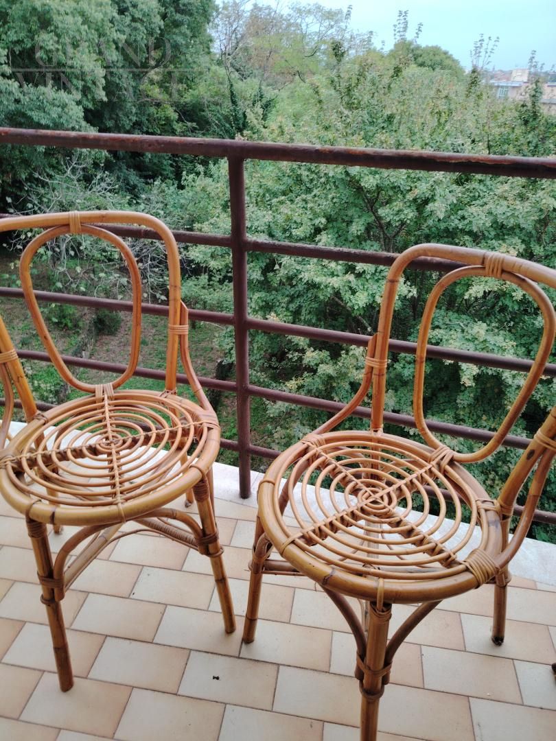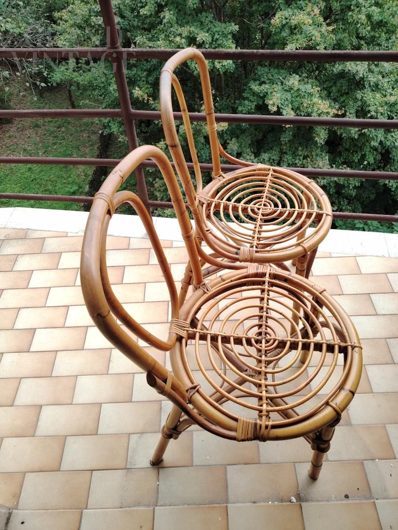Coppia di sedie vintage in bamboo e vimini con particolare seduta intrecciata a spirale.