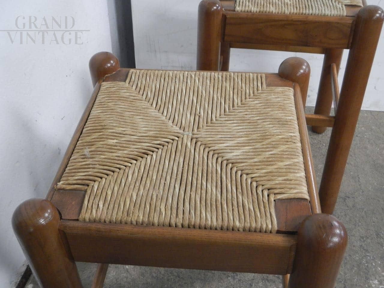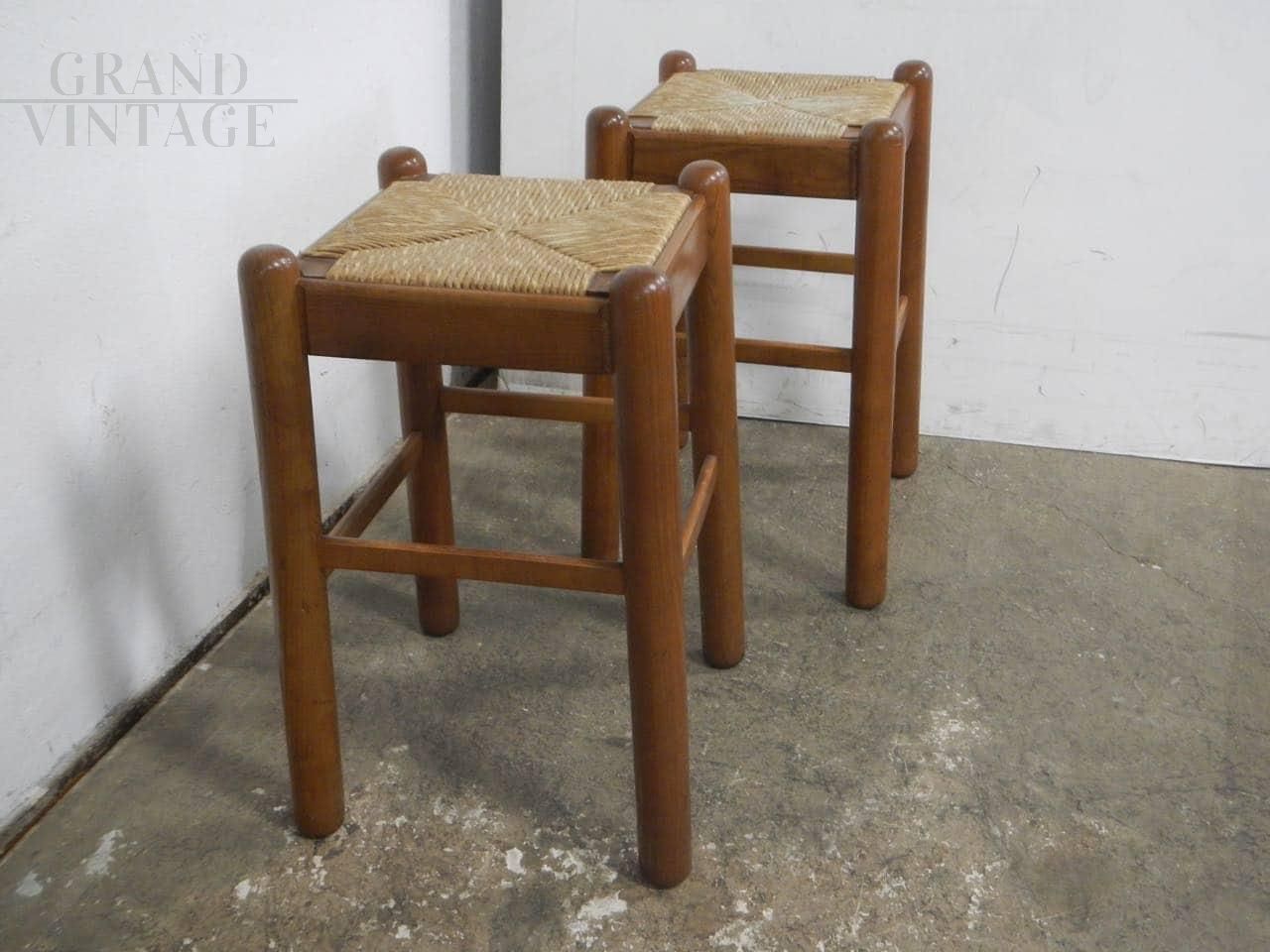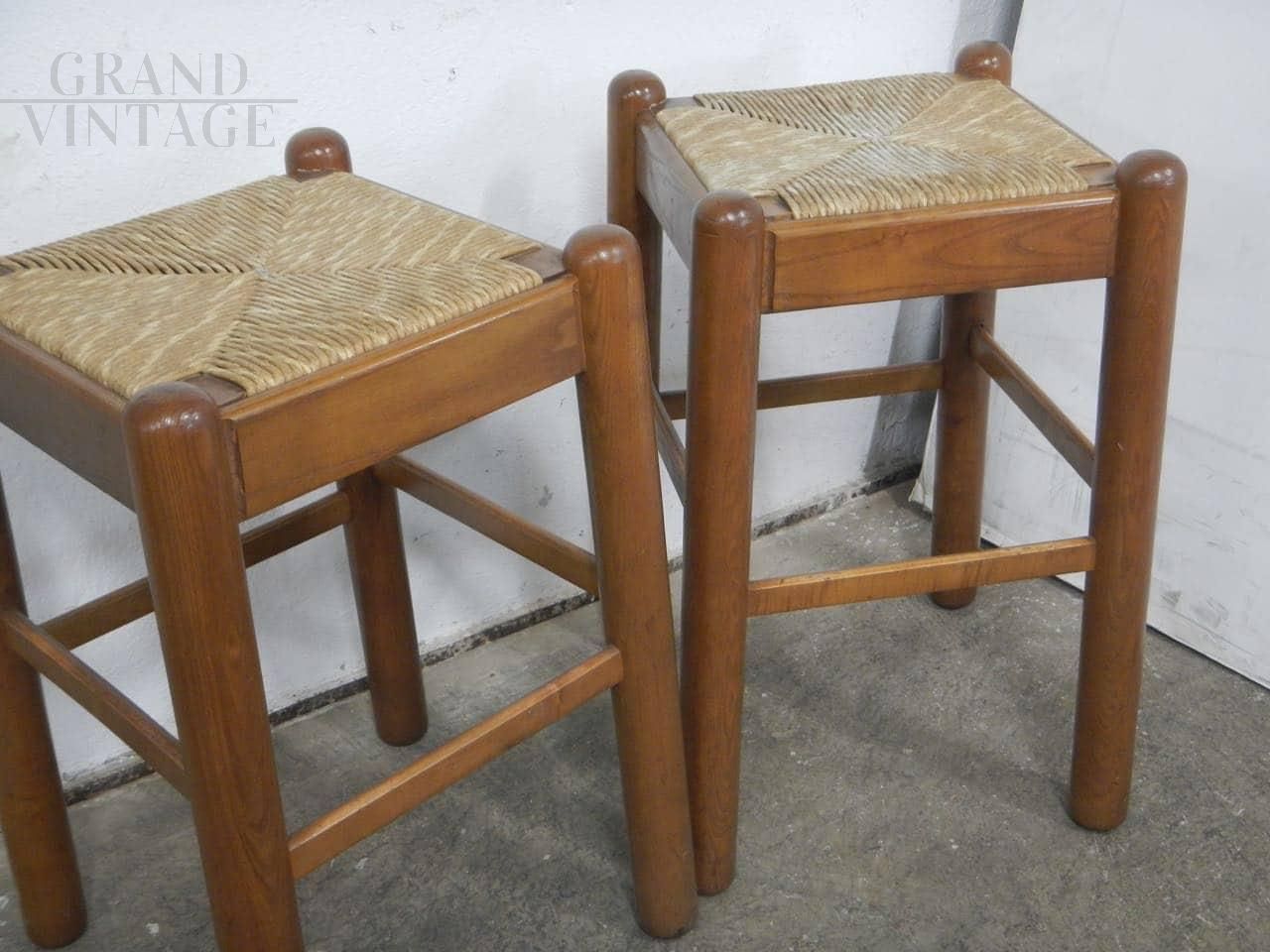 Coppia di sgabelli rustici vintage in legno di olmo colorato tinta noce con seduta in paglia intrecciata. La seduta misura 35 x 35 cm, altezza sgabelli 62 cm. In ottime condizioni, usati pochissimo.