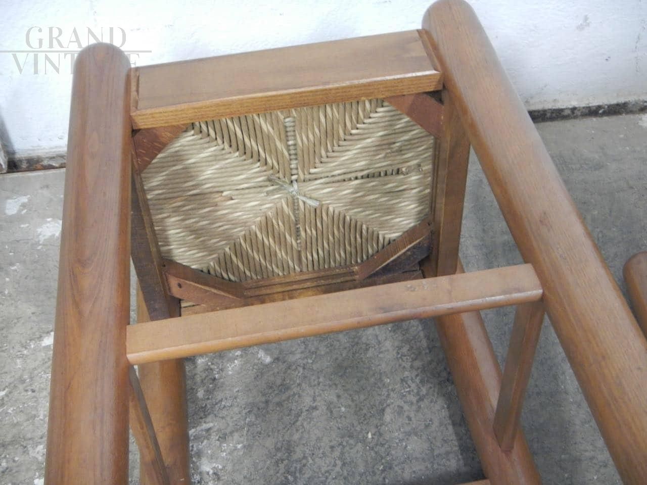 Coppia di sgabelli rustici in olmo con seduta in paglia, anni '80