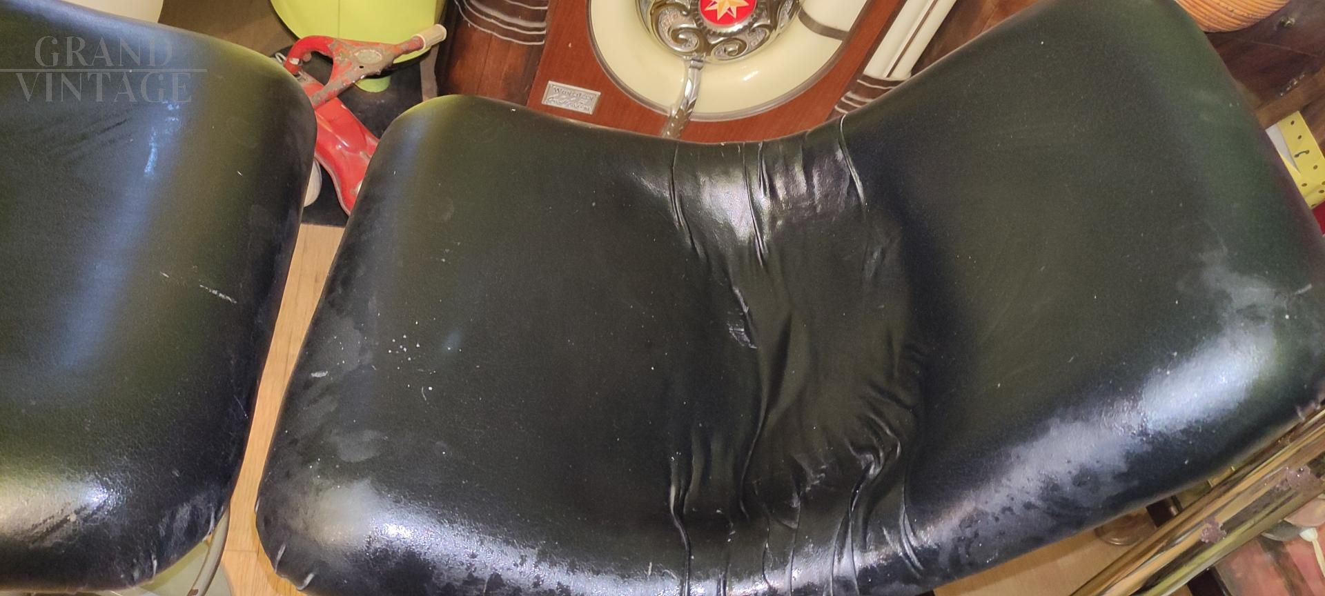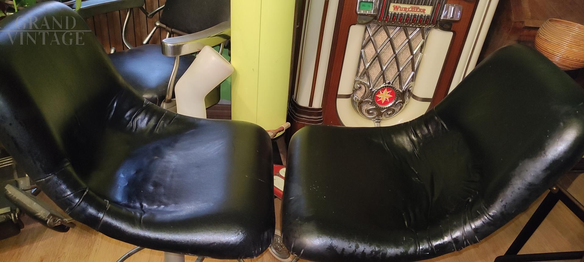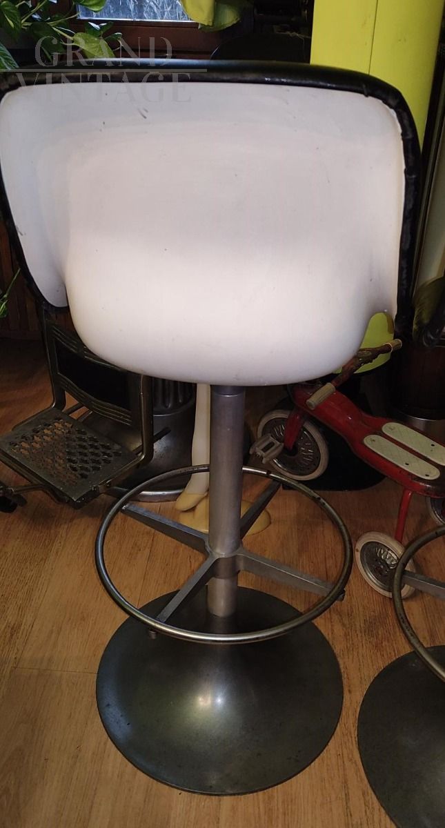 Coppia di sgabelli vintage alti modello Tulip imbottiti e rivestiti con similpelle nera, con struttura in materiale plastico su base in acciaio, completa di poggiapiedi. Buono stato di conservazione generale, presenta i naturali segni del tempo sia nell'acciaio che nel rivestimento, come da foto.