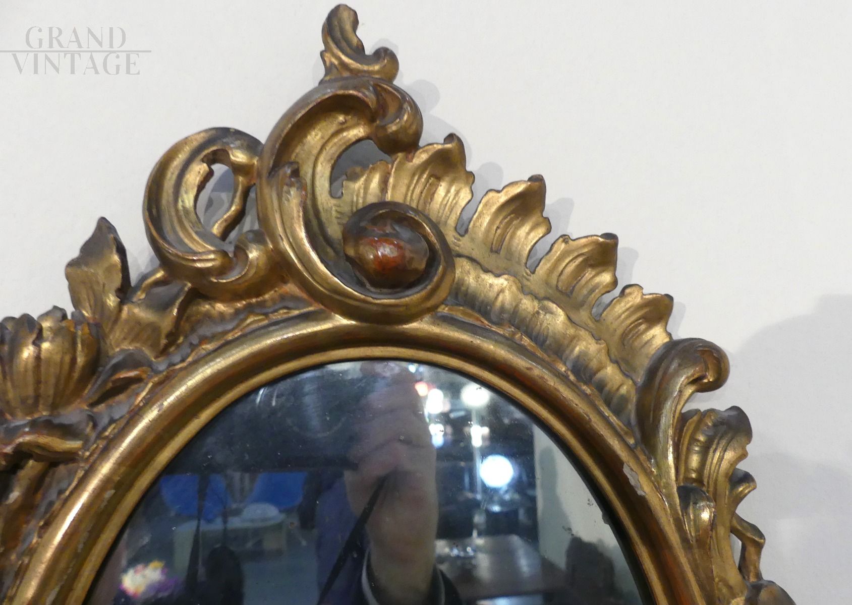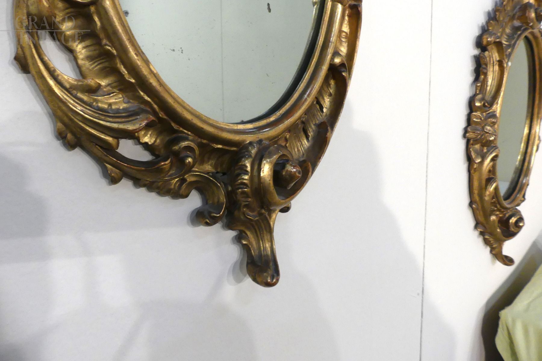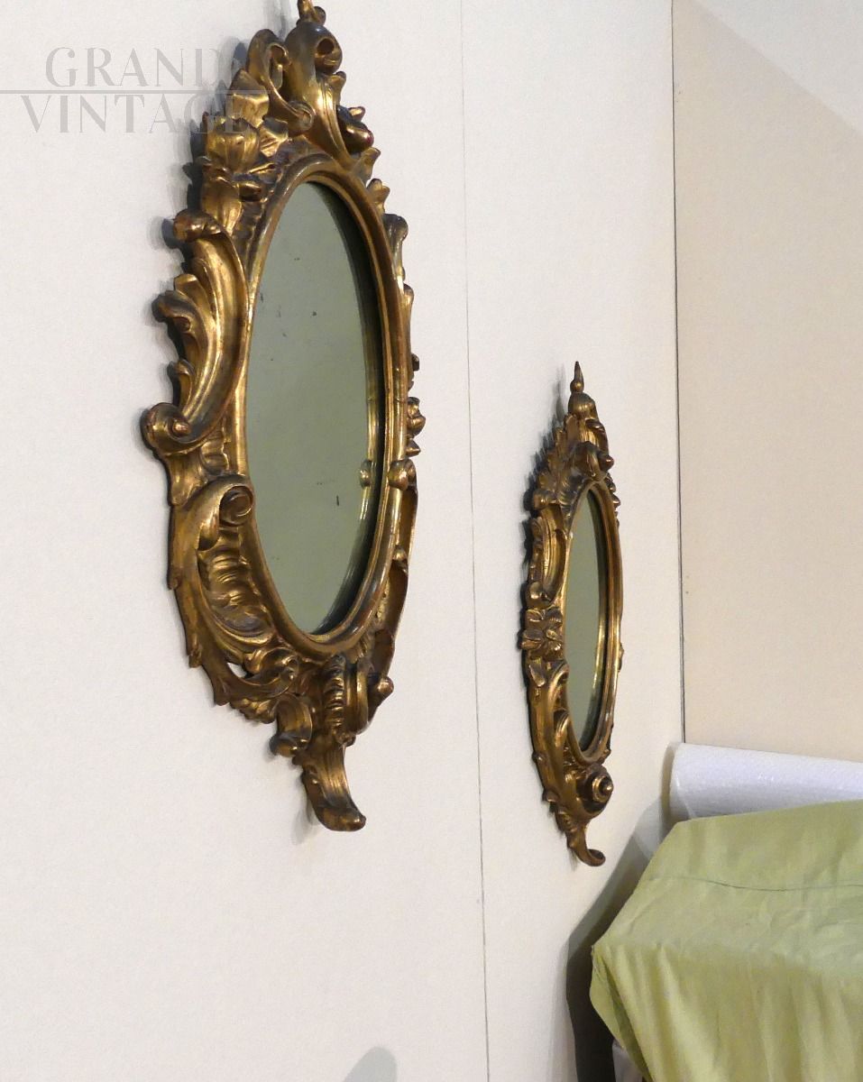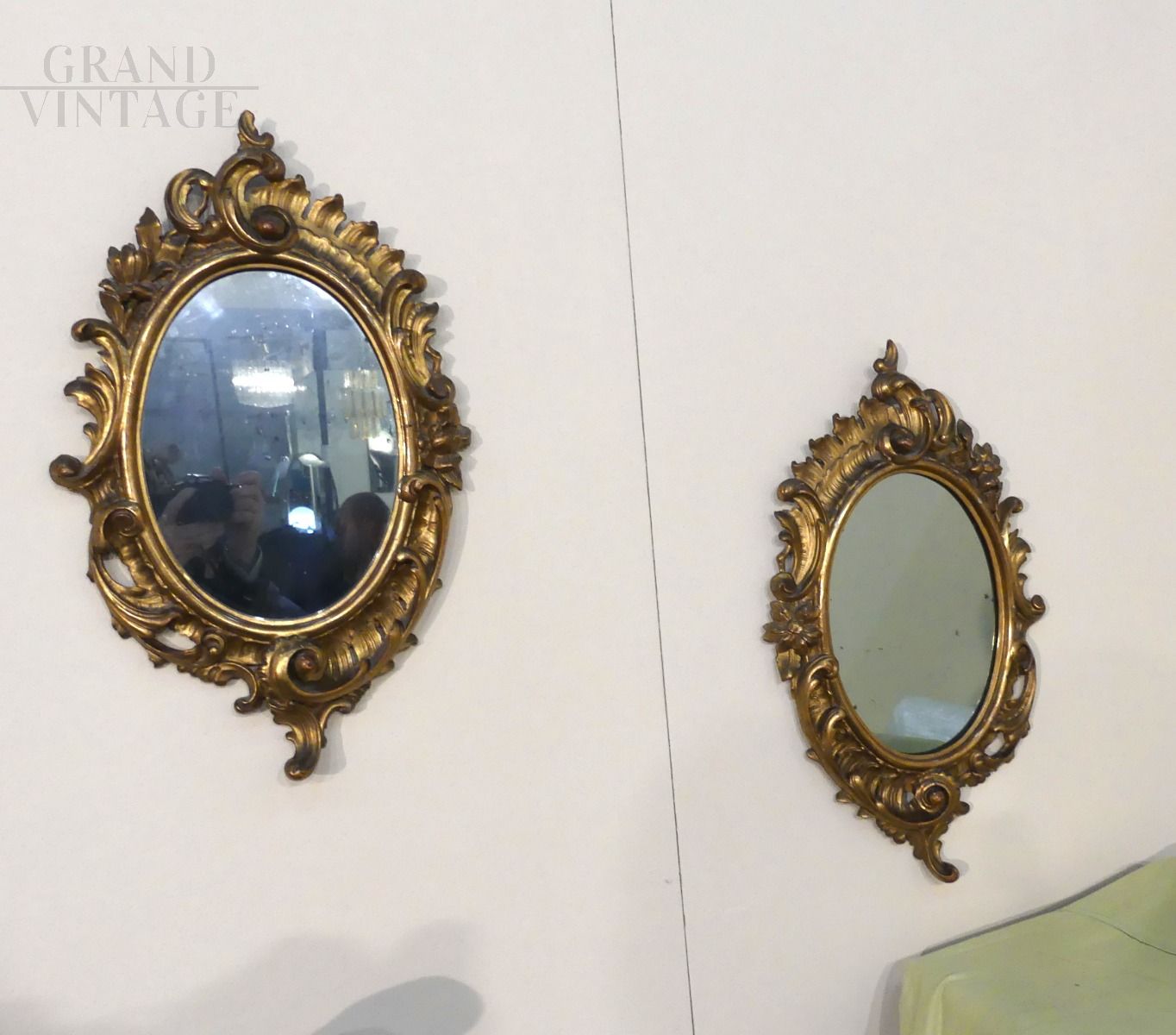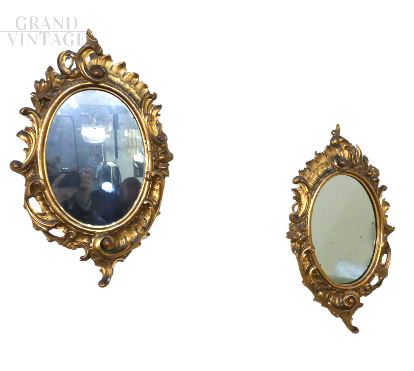 Coppia di piccoli specchi antichi dell'800 in legno scolpito e dorato in foglia d'oro, la parte specchiante è coeva e mostra bellissimi segni del tempo.