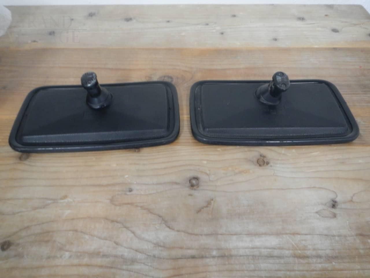 Coppia di specchi da camion vintage anni '90 in plastica nera con supporto, in buone condizioni.