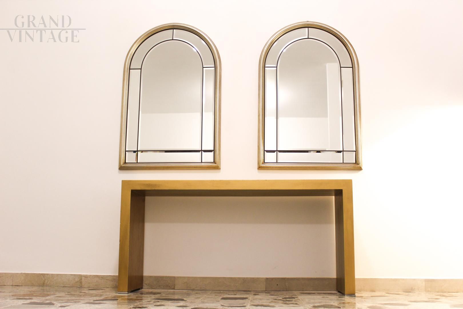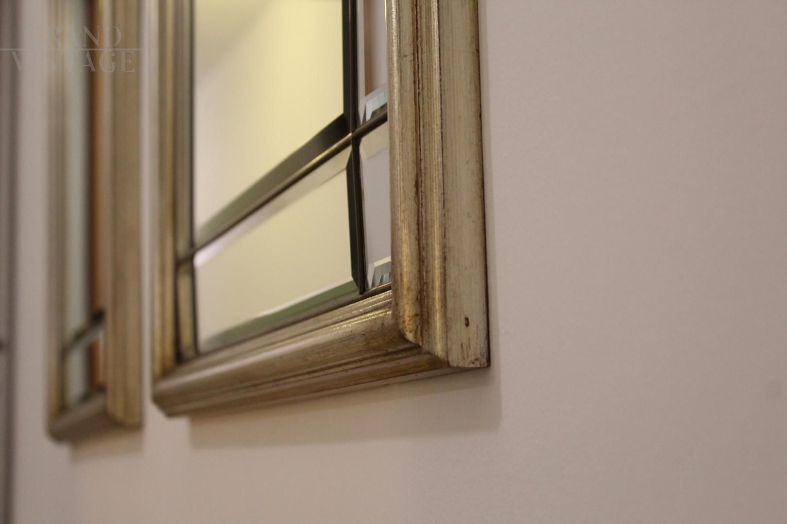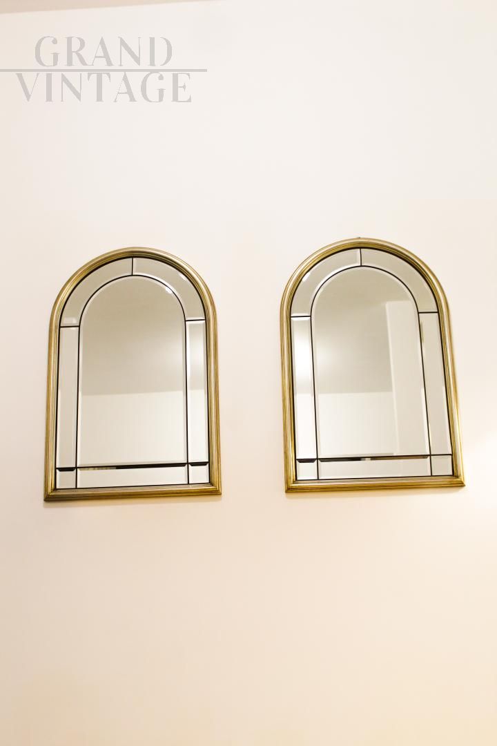 Coppia di specchi vintage bisellati in ottone e legno dorato