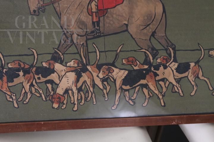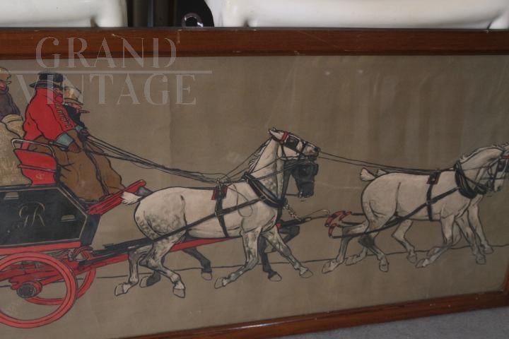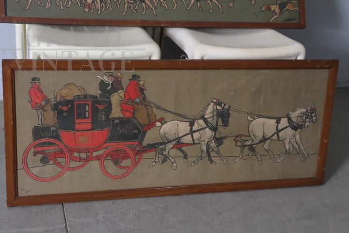 Antica coppia di stampe inglesi acquerellate raffiguranti carrozze con cavalli e personaggi, probabilmente cacciatori con cani al seguito, firmate in basso a sinistra dall’artista. Ottimo stato.