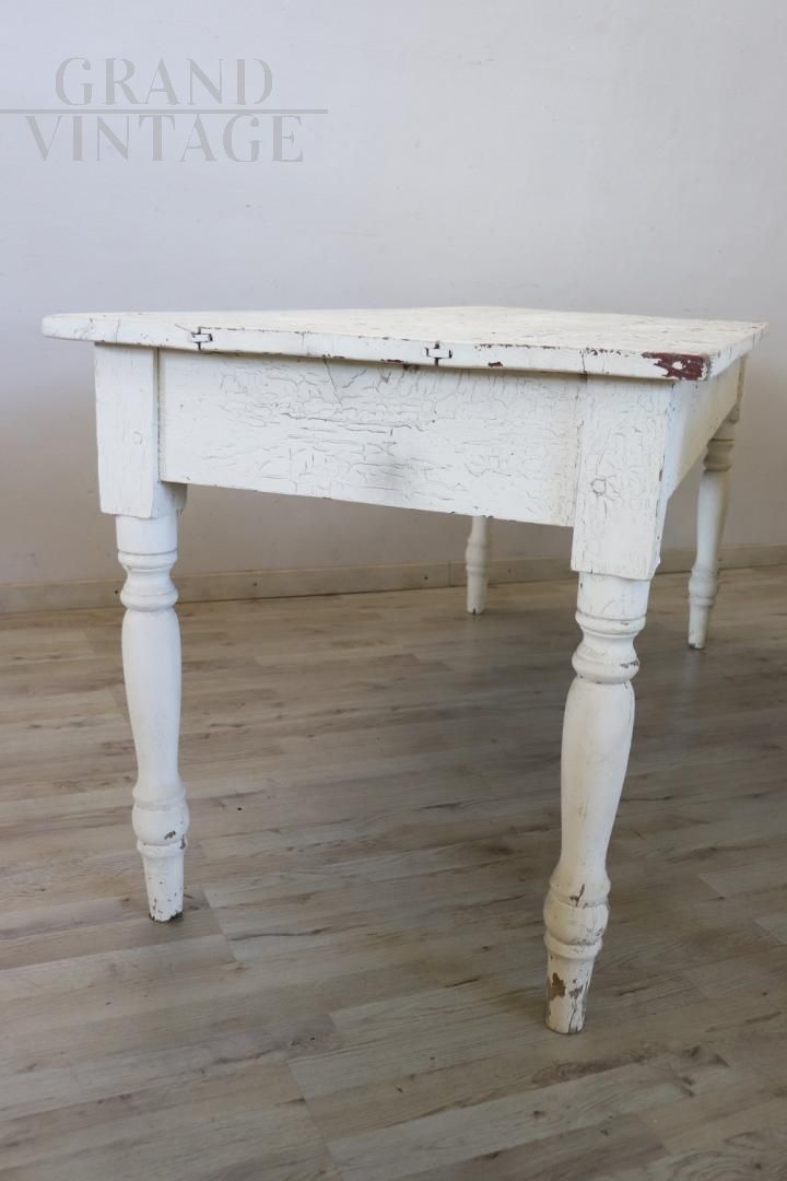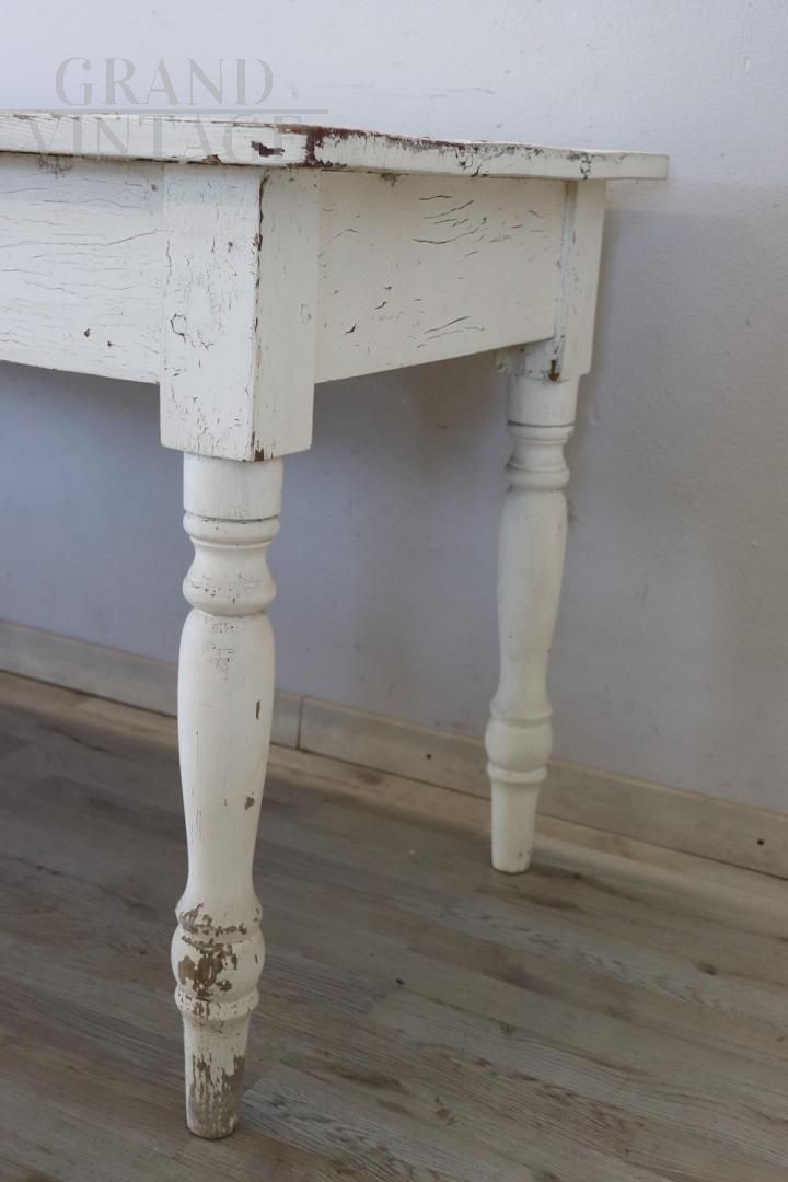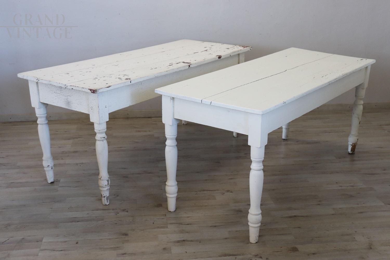 Coppia di tavoli antichi rustici in pioppo laccato bianco, XIX secolo