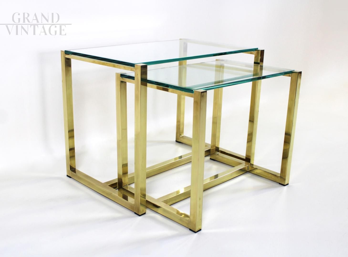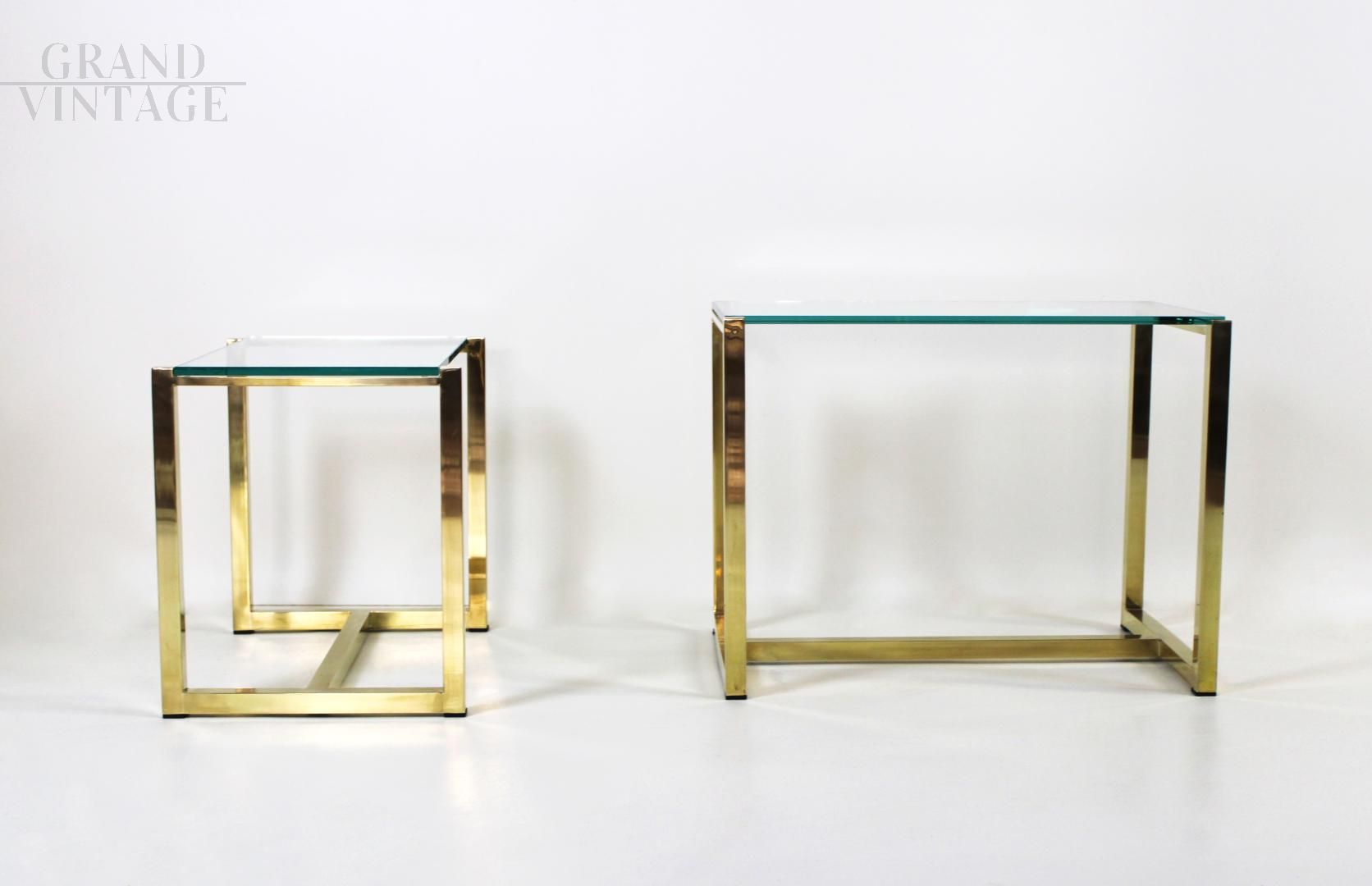 Coppia di tavolini a nido con struttura in ottone e piano in vetro, anni '70.