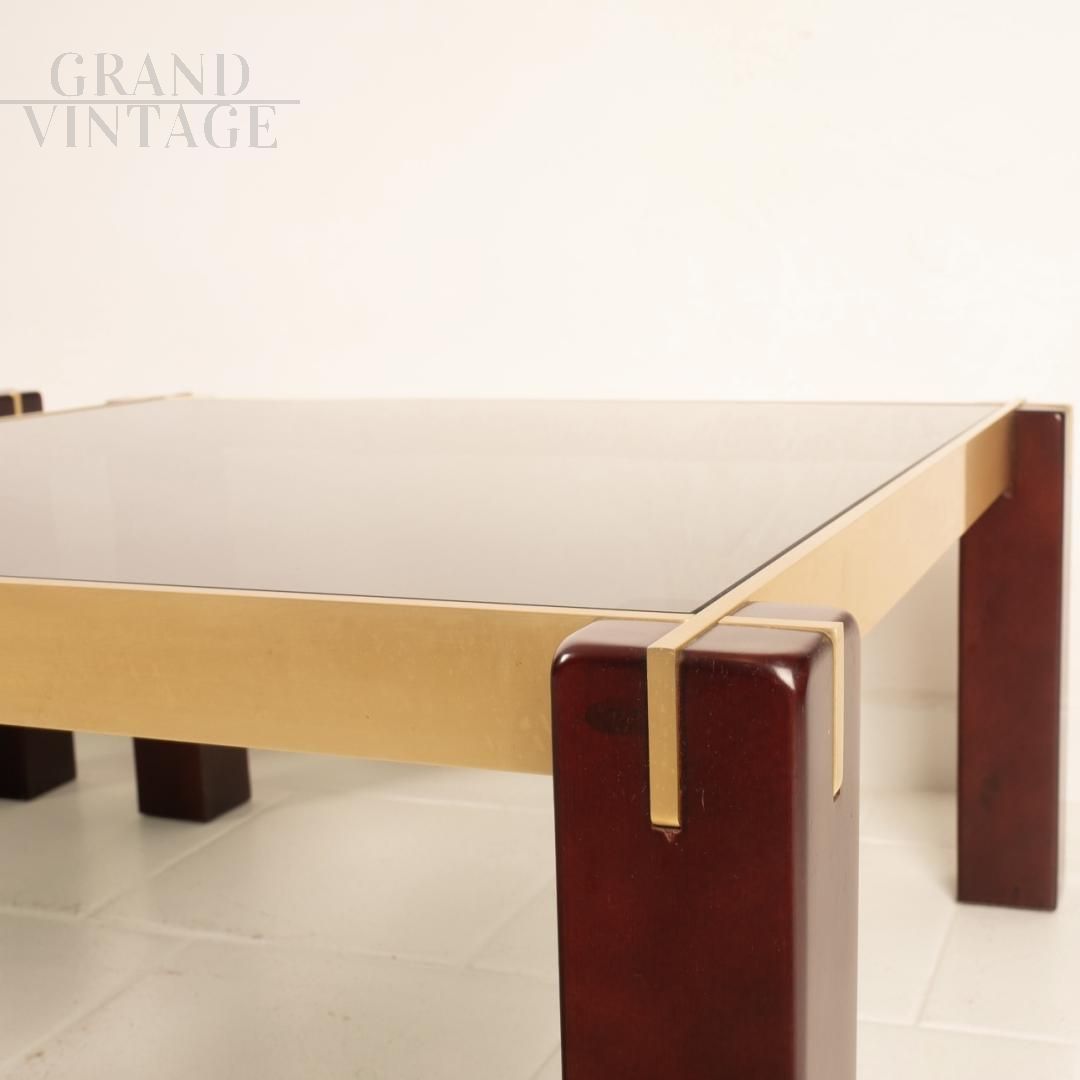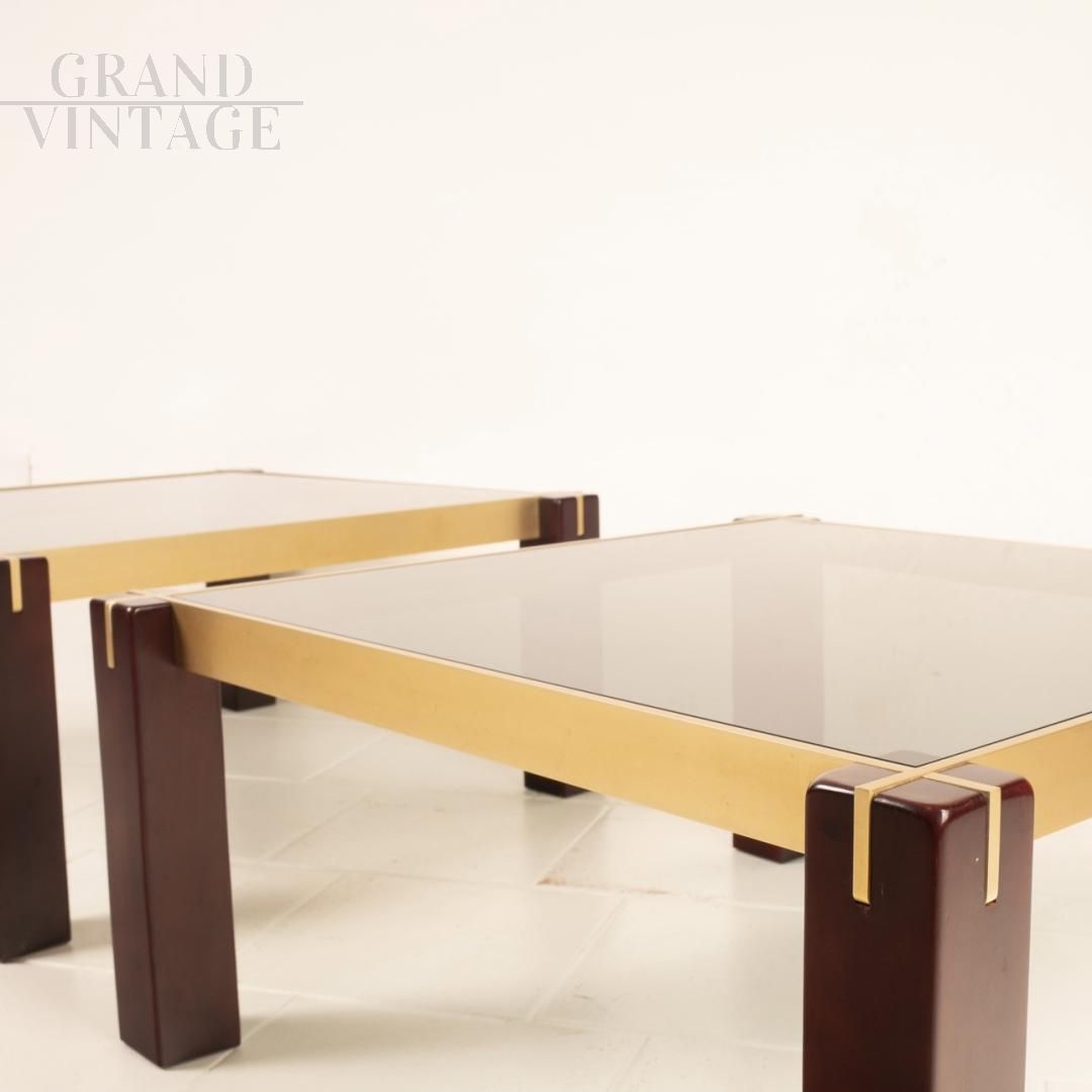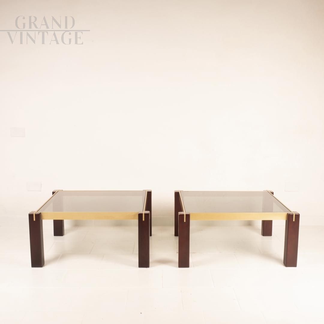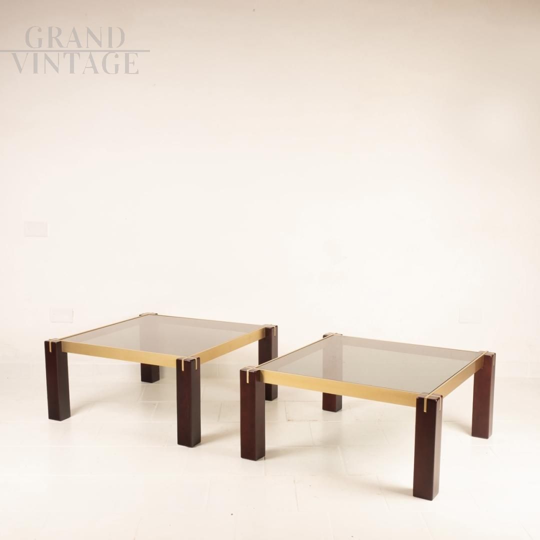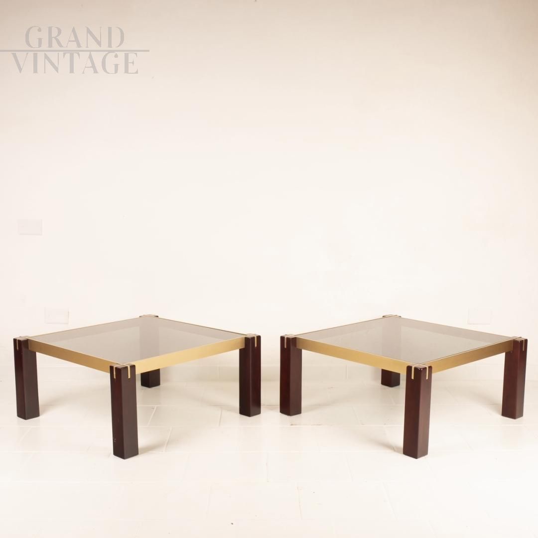 Coppia di tavolini da salotto Faraone, design di Renato Polidori per Skipper, anni '60, in legno massello e alluminio ottonato con piano in cristallo fumé.