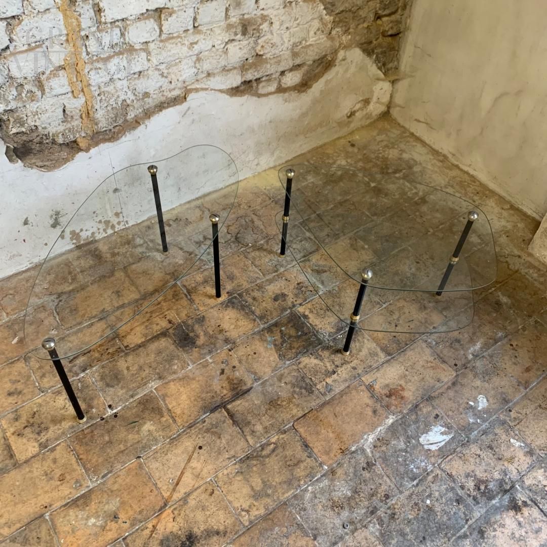 Coppia di tavolini in vetro e metallo degli anni '50, nello stile di Edoardo Paoli, originali dalla forma organica, sono anche pratici perché smontabili! In buone condizioni generali, con qualche graffio sui piani, una scheggiatura e alcune bolle d'aria nel vetro, come da foto.