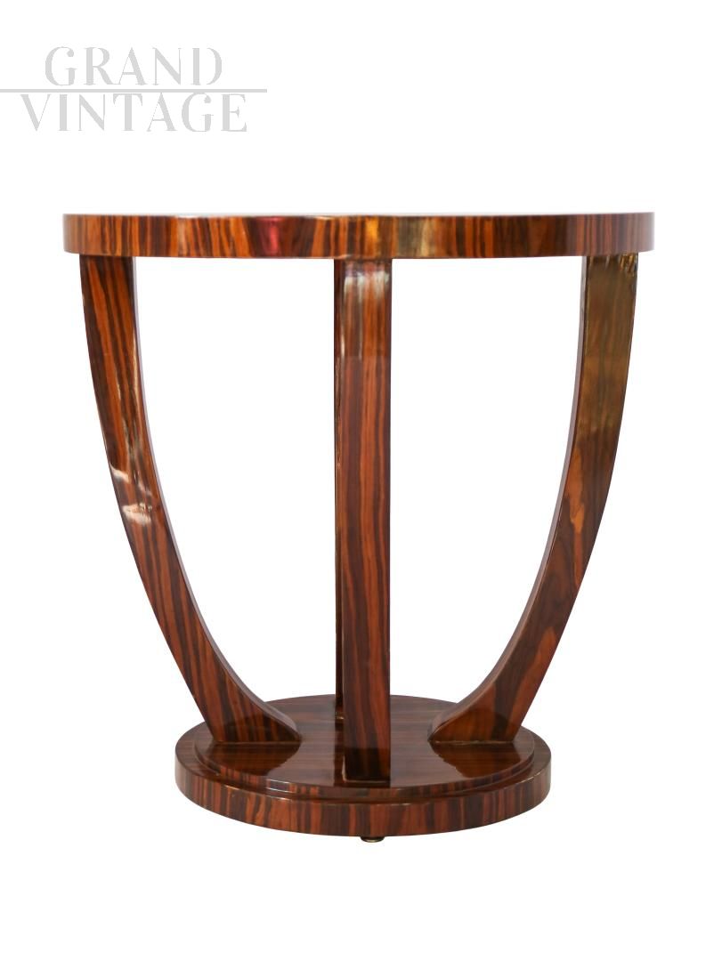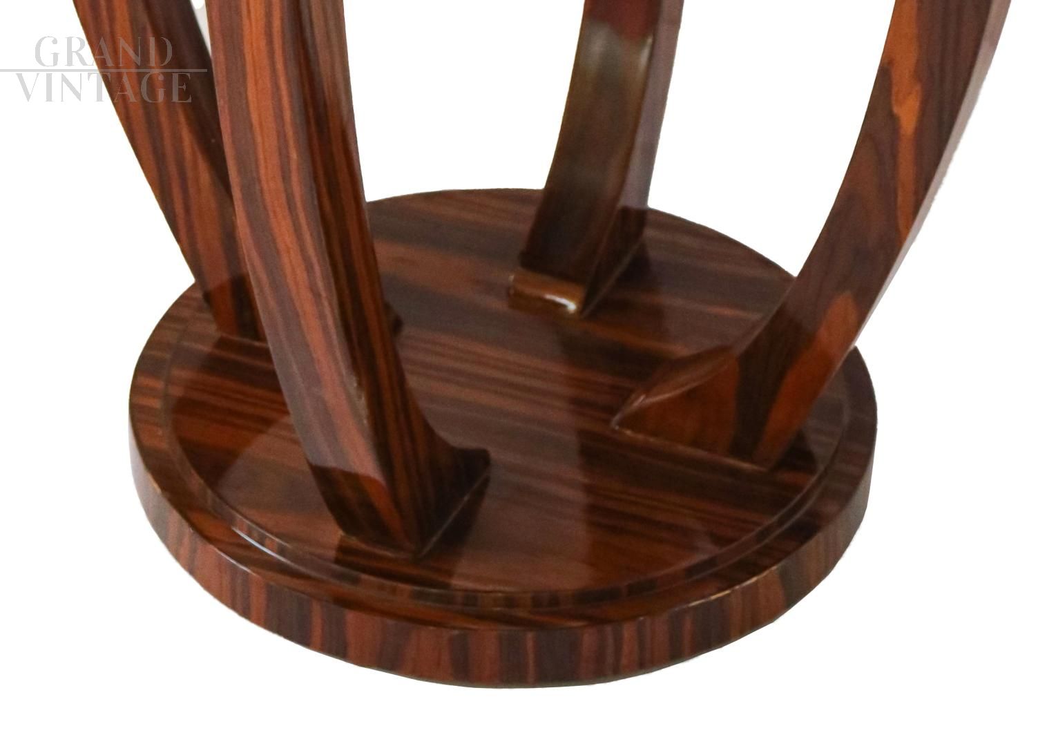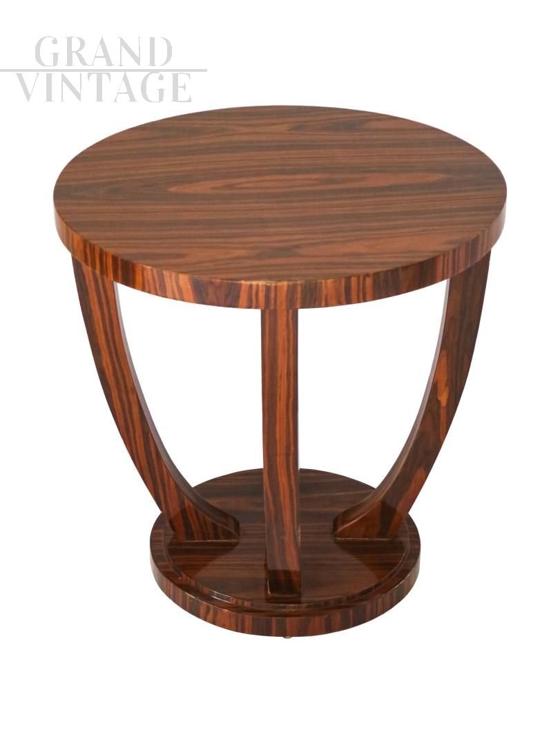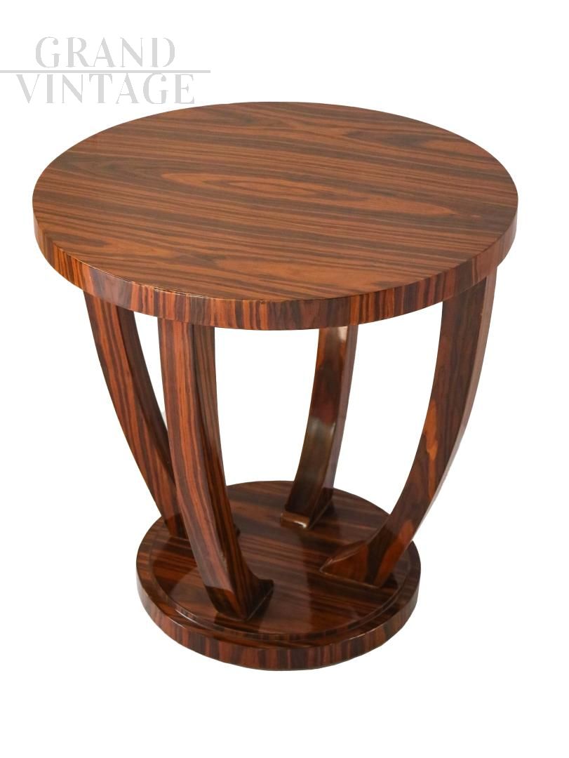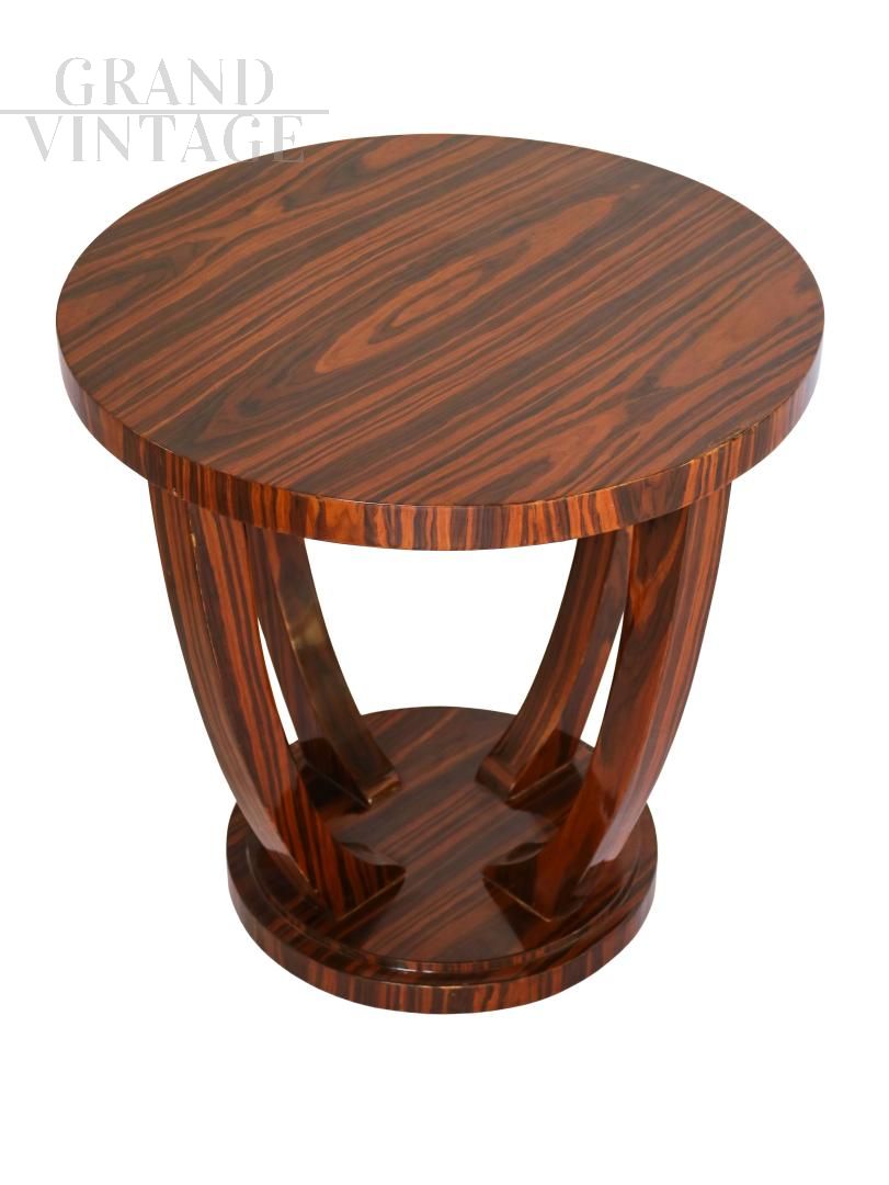 Coppia di tavolini rotondi in stile art déco in legno di makassar, con piano e base circolari e quattro gambe curve.