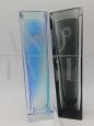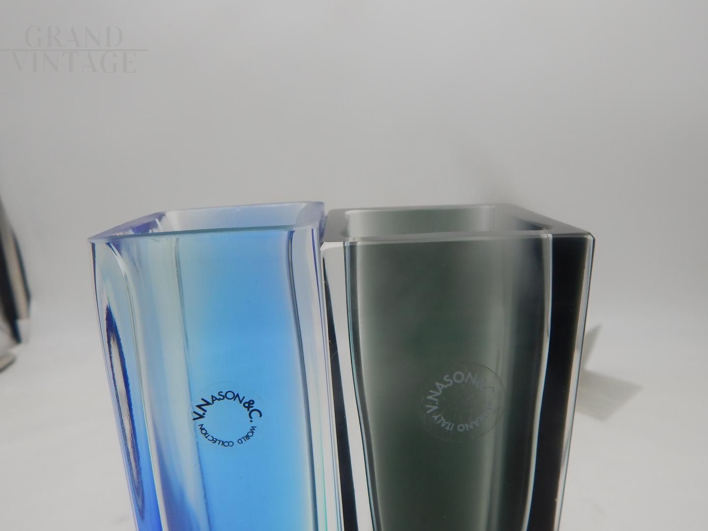 Coppia di vasi in vetro di Murano di V. Nason, della linea Eklettika, anni '70, realizzati con la tecnica del vetro sommerso, uno in colore azzurro e l'altro in colore nero. Il set è nuovo, completo di scatole, con documentazione originale e sigillo anticontraffazione.