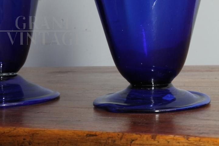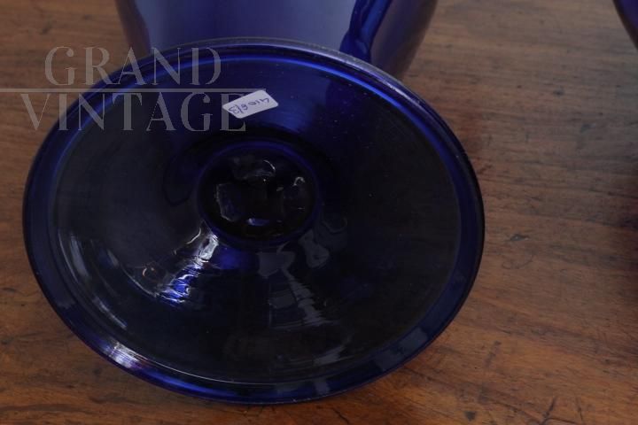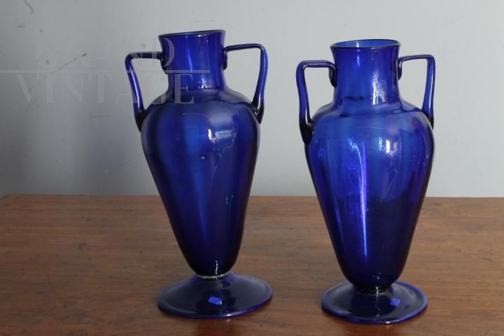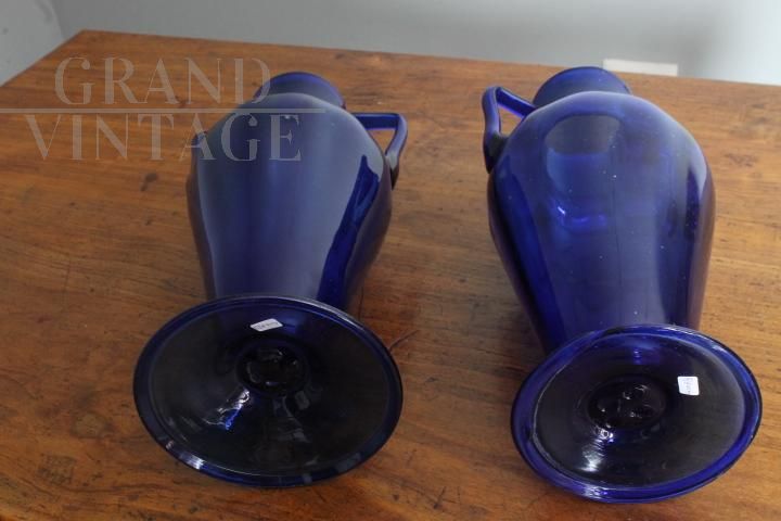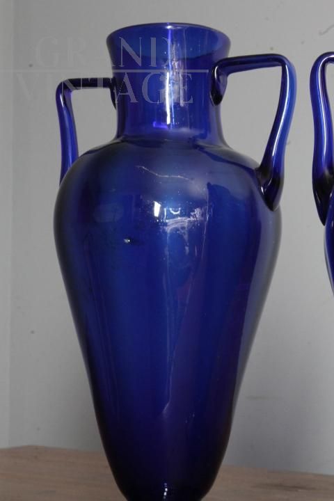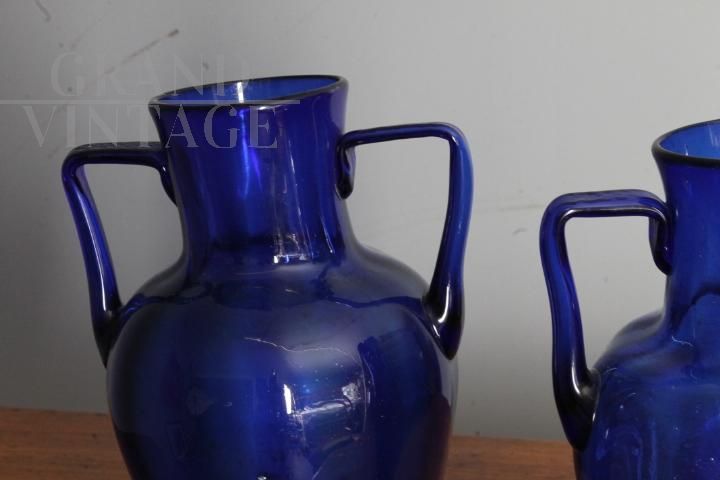 Coppia di vasi ad anfora liberty in vetro di Murano blu cobalto