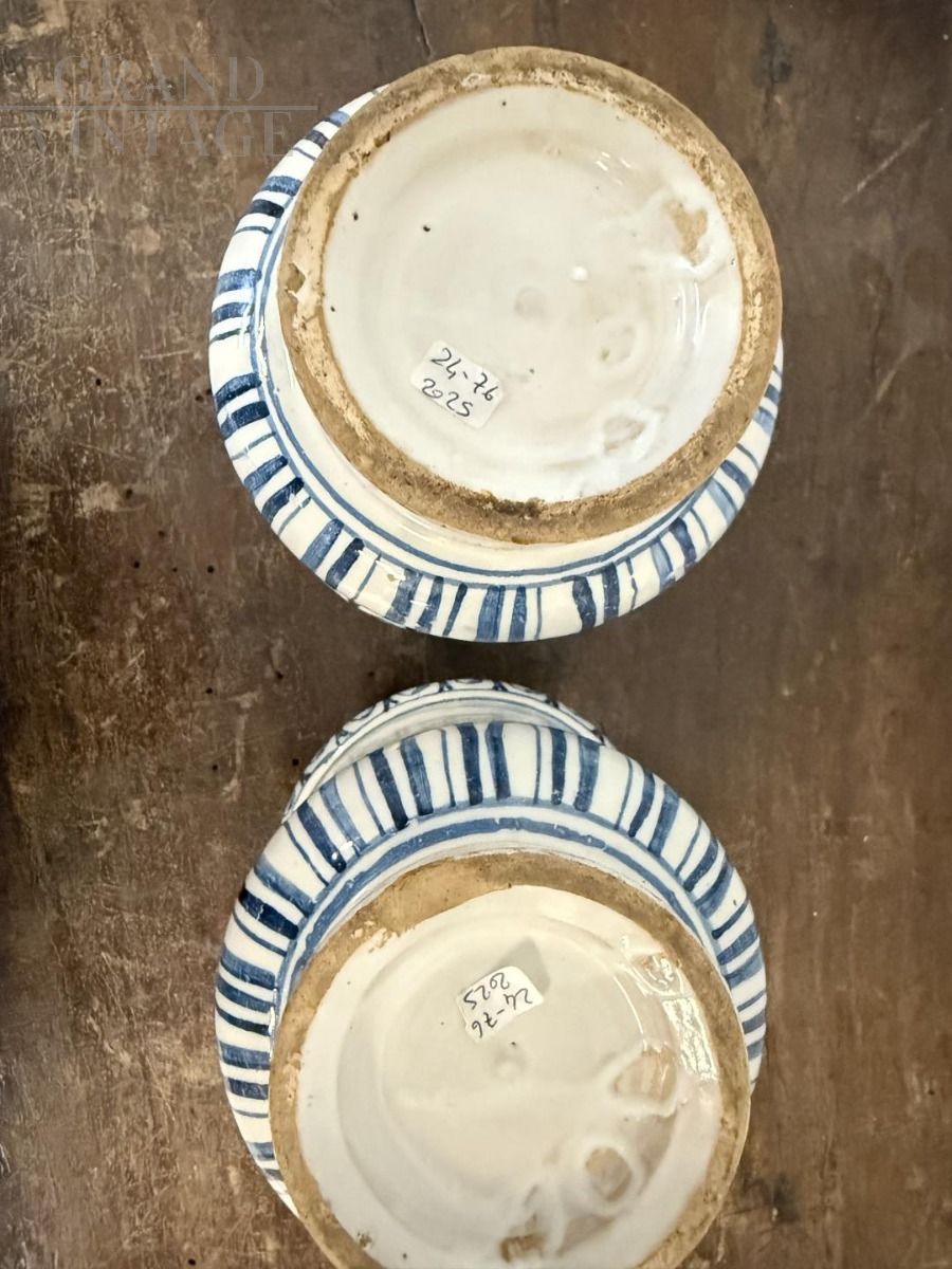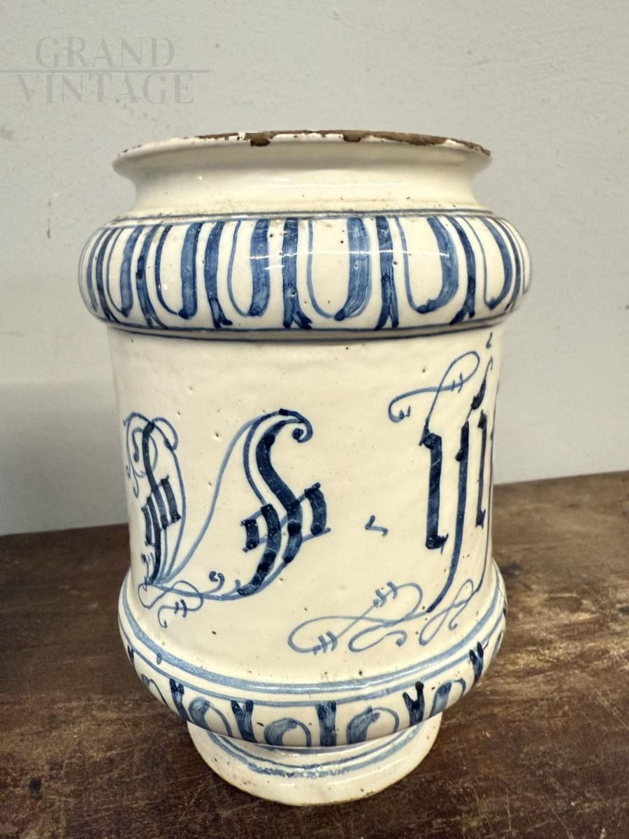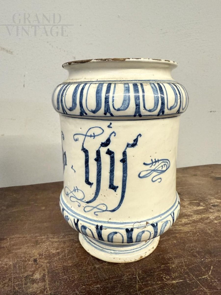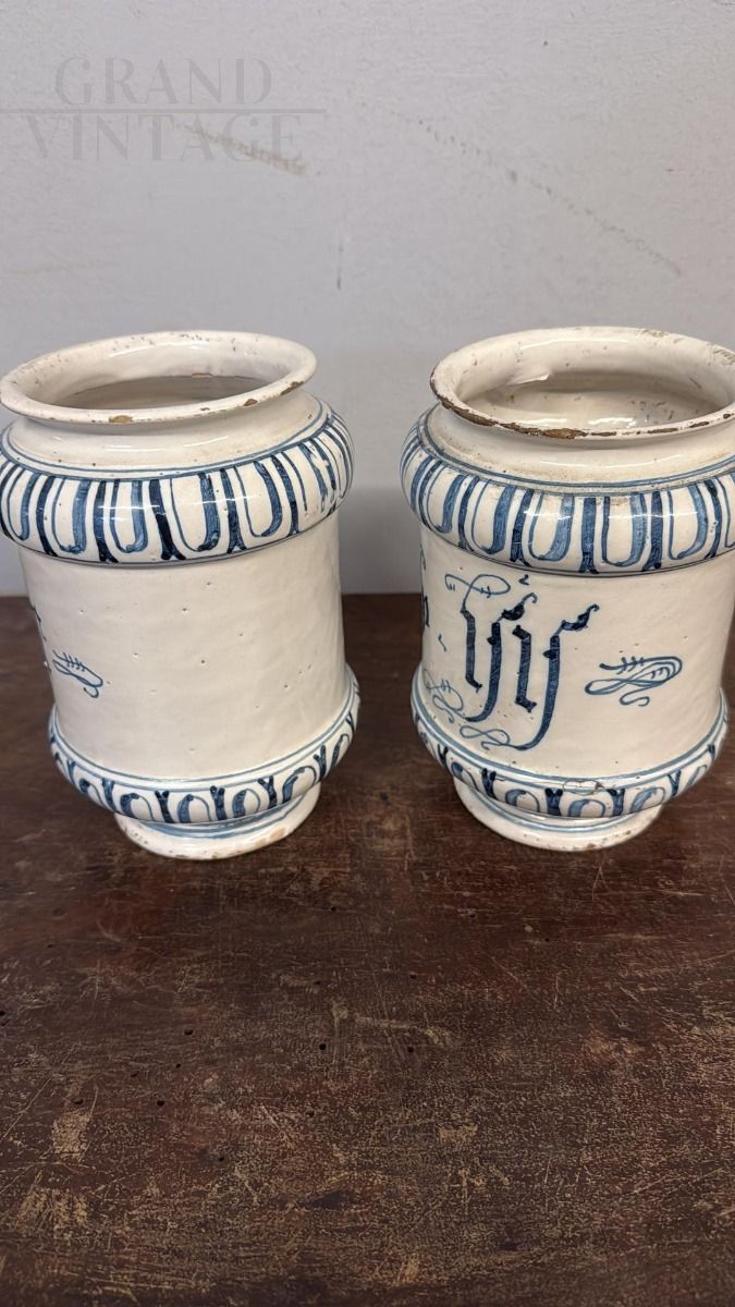 Coppia di vasi da farmacia antichi del '700 in ceramica albarello bianca con scritte blu, Bassano XVIII secolo, 20 x 14 cm.