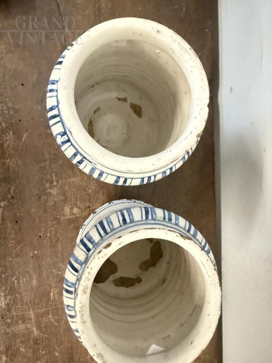 Coppia di vasi albarello da farmacia antichi in ceramica di Bassano, XVIII secolo
