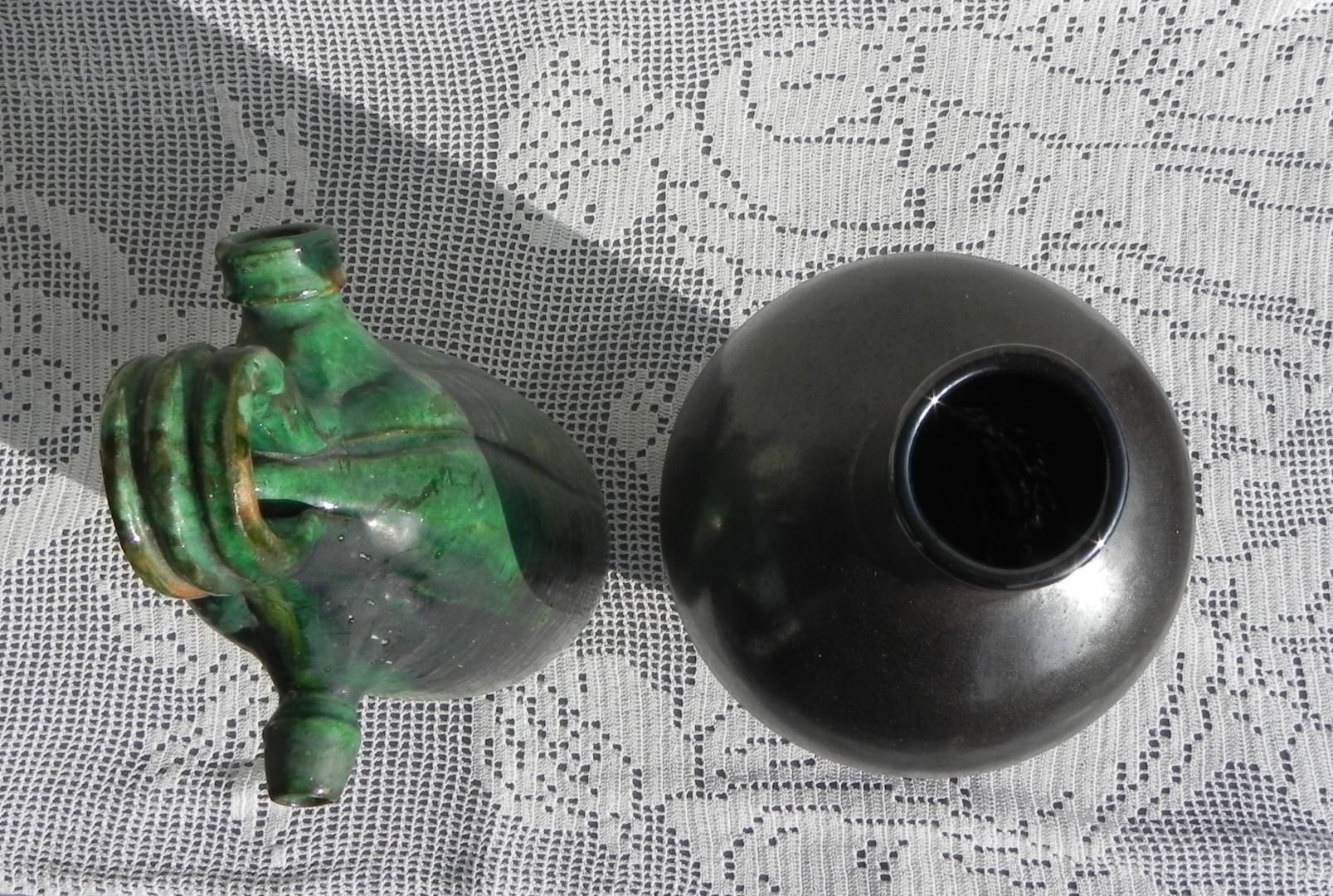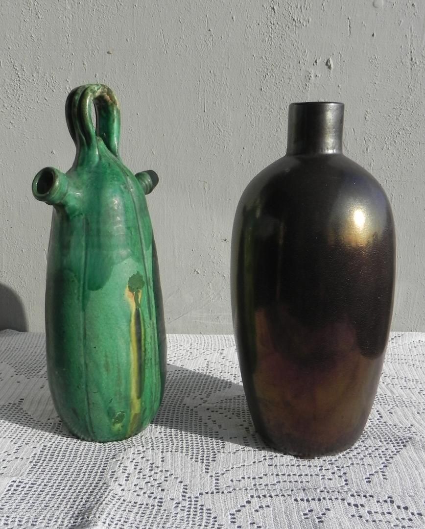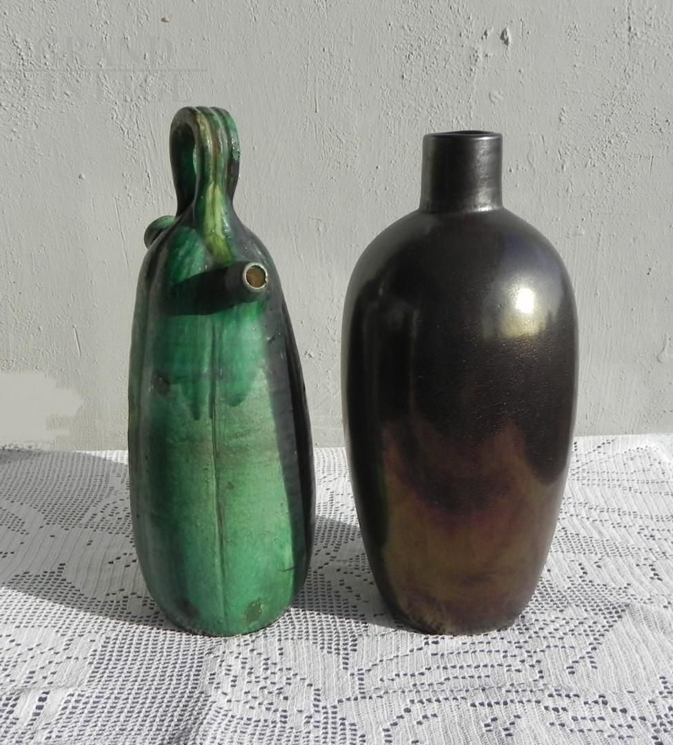 Coppia di vasi a bottiglia artistici da collezione. Il set è formato da una fiaschetta in terracotta smaltata verde degli anni '70, origine Catalan - Spagna, detta anche Terrissa Catalana - Cantir d'Hivern del Vendrell. E da un vaso design di Barbini in vetro di Murano trattato al silicio in superficie,origine Italia anni '90, pesante e di forte spessore, nel fondello si nota la lavorazione a sovrapposizioni cromatiche di ossidi per ottenere il colore marrone / bordeaux. In ottime condizioni e senza difetti.