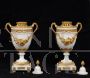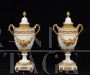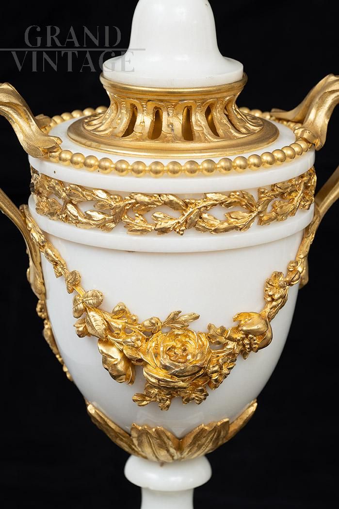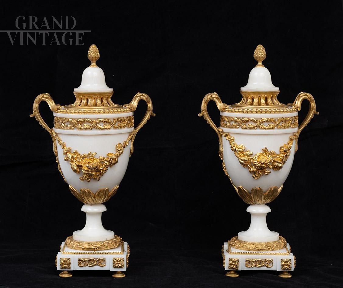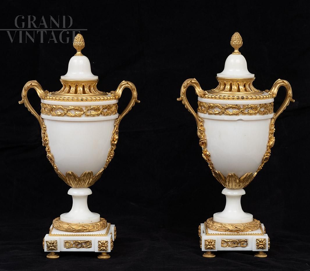 Coppia di vasi cassolette antichi Napoleone III in marmo bianco statuario e bronzo dorato appartenente alla seconda metà del XIX secolo. Il corpo centrale in marmo bianco statuario presenta delle decorazioni in bronzo dorato finemente cesellato. Il coperchio termina con una presa a forma di pigna dorata. L'orlo superiore è ornato da una fascia con foglie di alloro intrecciate tipica del gusto neoclassico. Le anse laterali ricurve sono decorate con volute a motivi floreali.