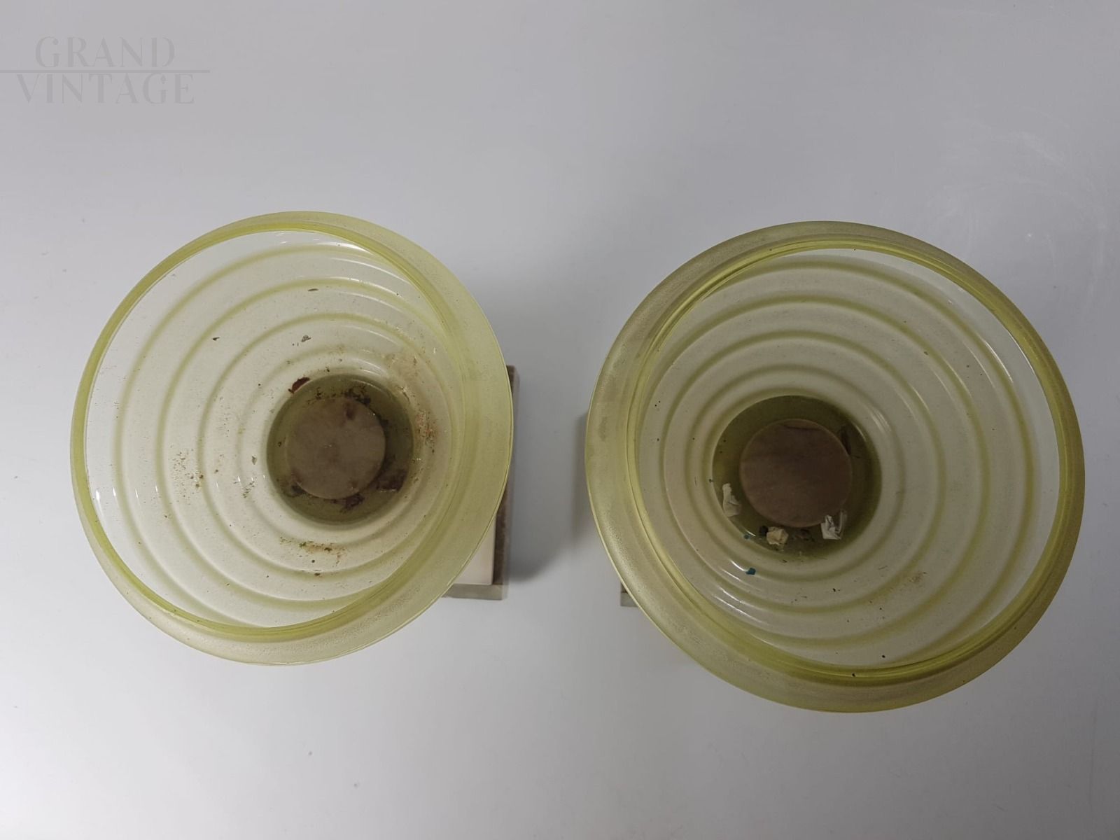 Coppia di vasi vintage anni '30 con coppa in vetro ambrato, fusto in ottone e base in marmo.