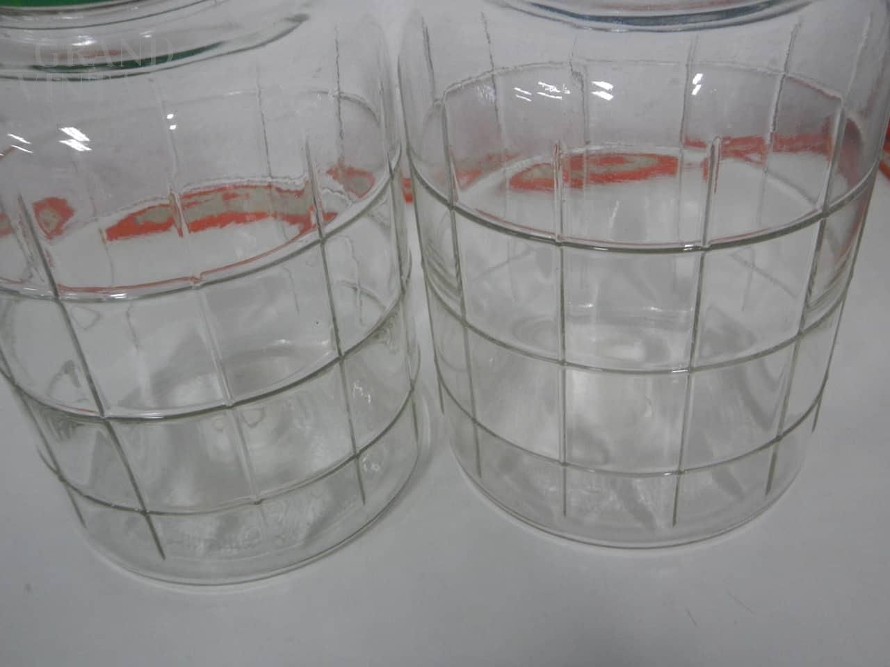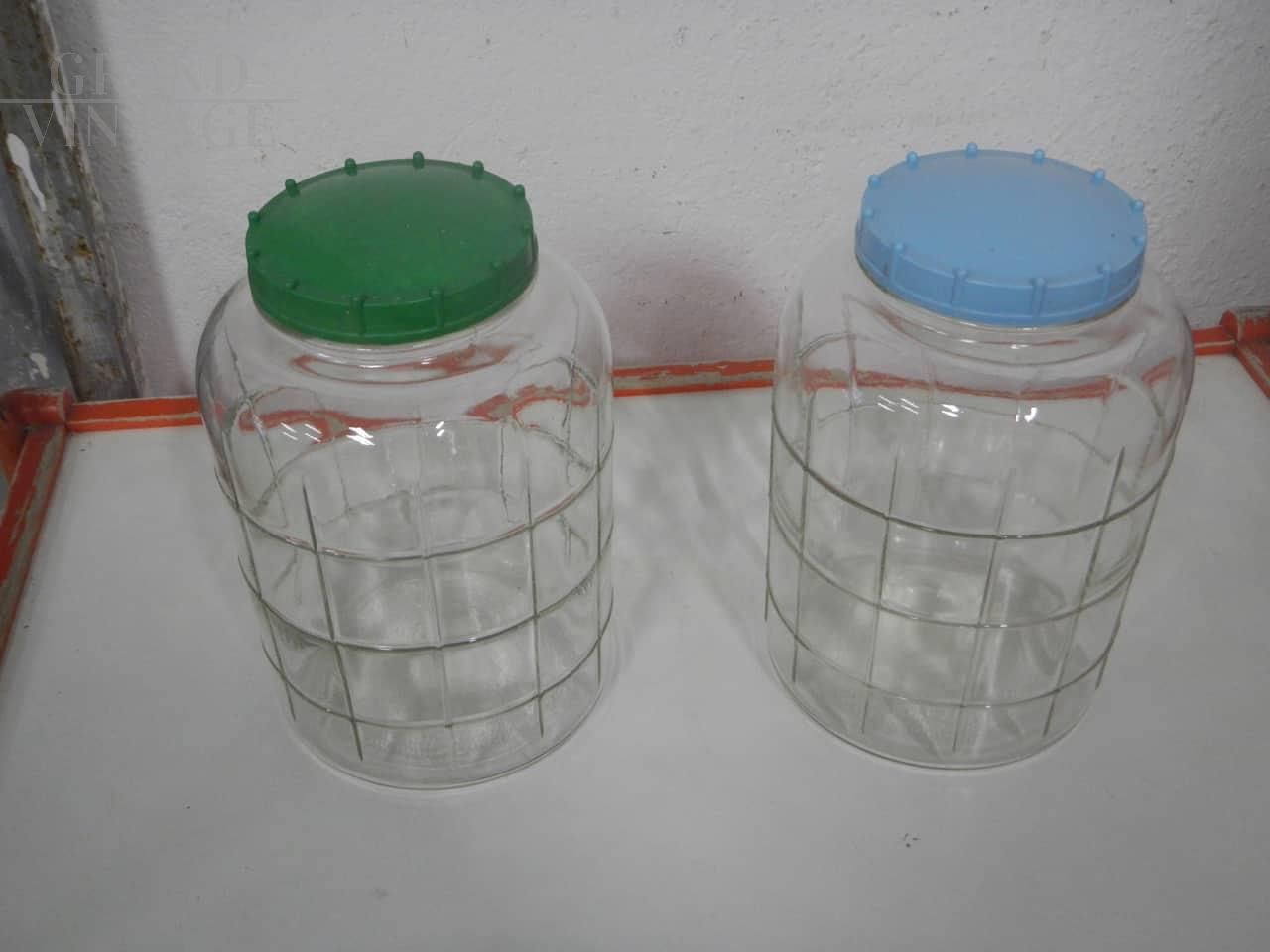 Set composto da 2 vasi barattoli da negozio vintage in vetro con decorazioni in rilievo e con coperchi in plastica blu e verde. Usati nei negozi di rivendita tabacchi e giocattoli come contenitori caramelle. In buone condizioni.