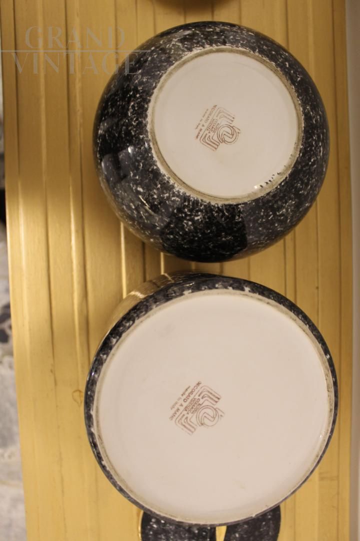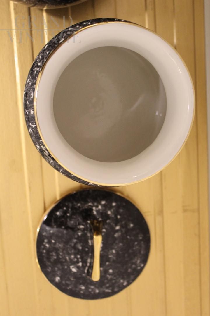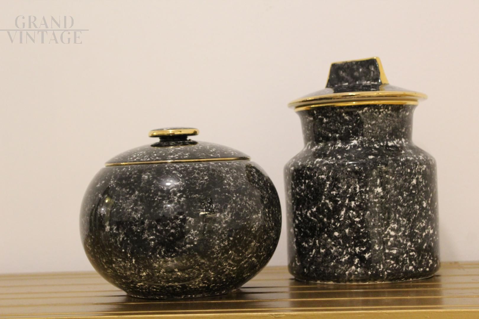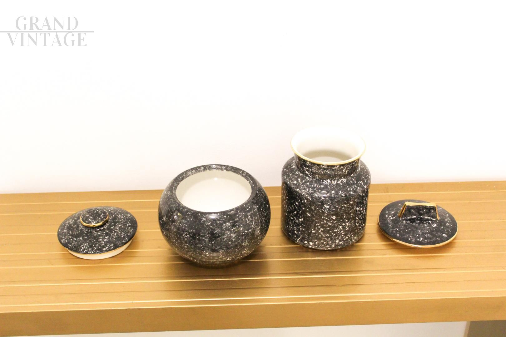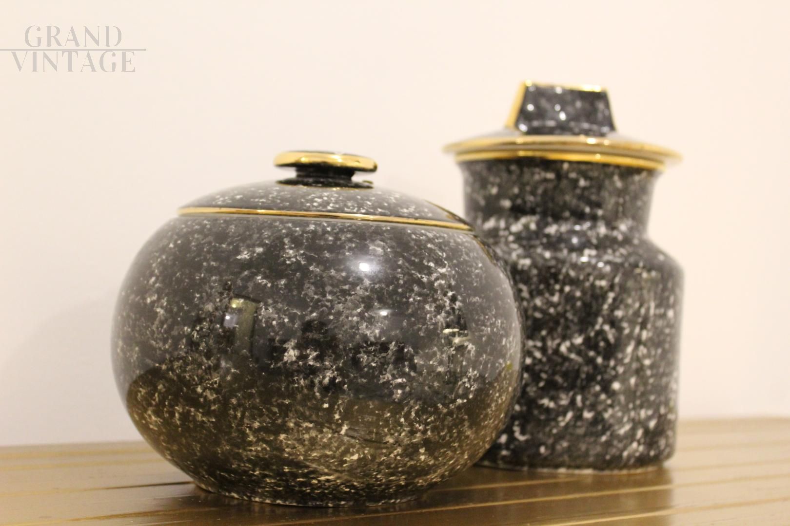 Coppia di vasi con coperchio in ceramica Vicentina, Art Déco anni '40, decorati a mano, con dettagli dorati.