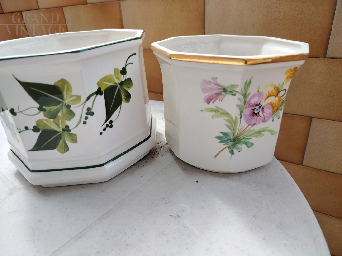 Coppia di vasi vintage in porcellana bianca con decori floreali dipinti a mano.