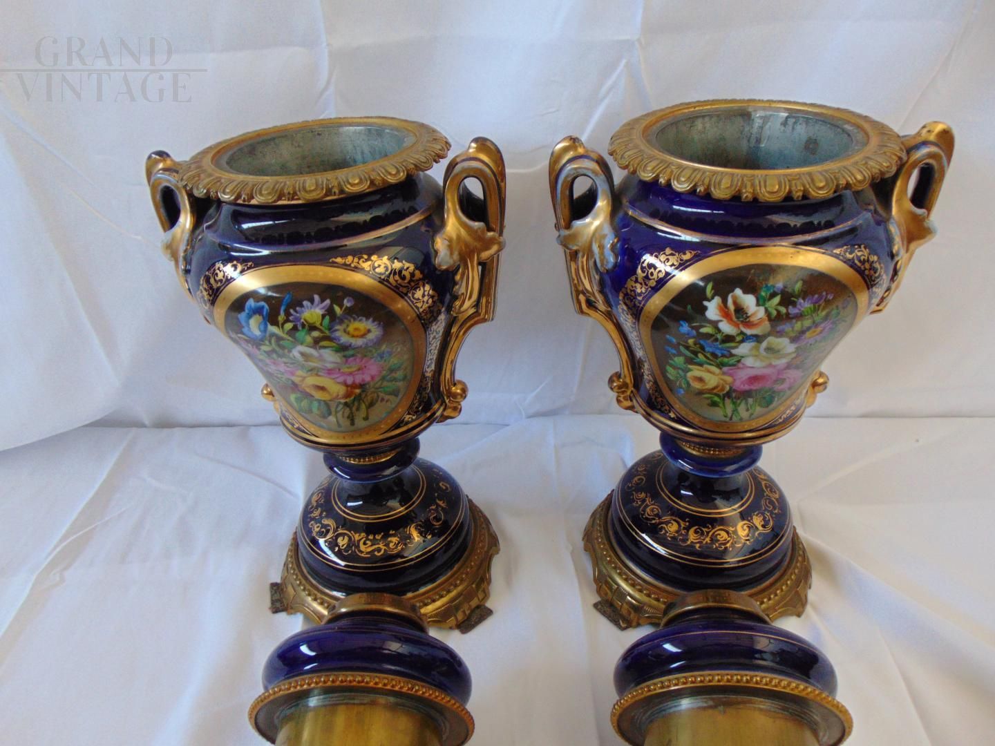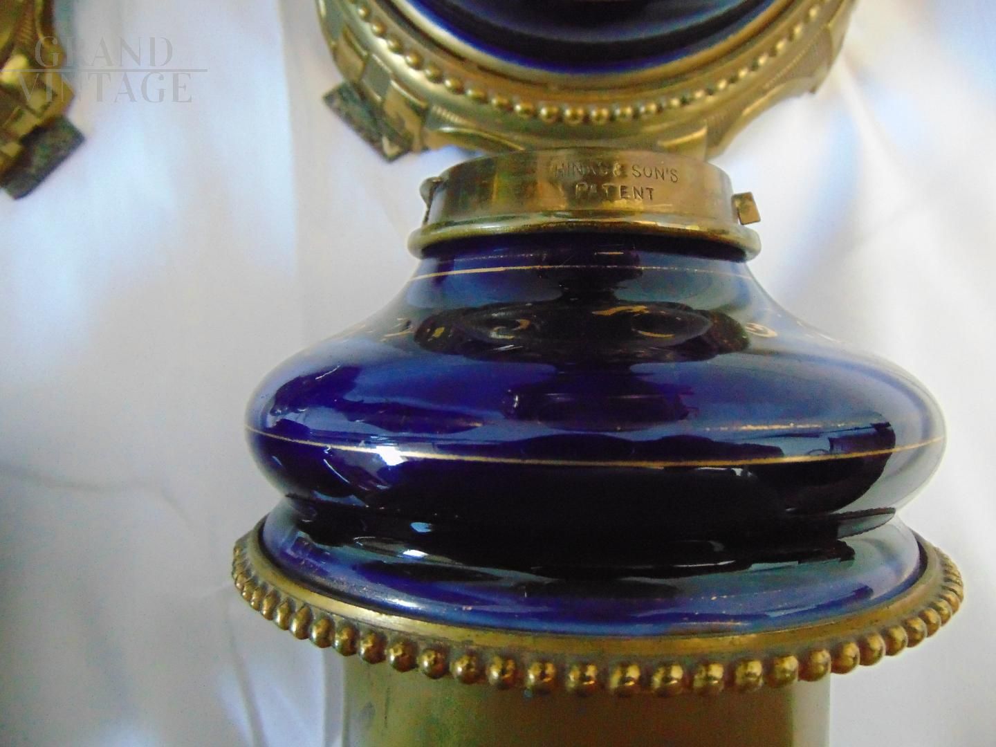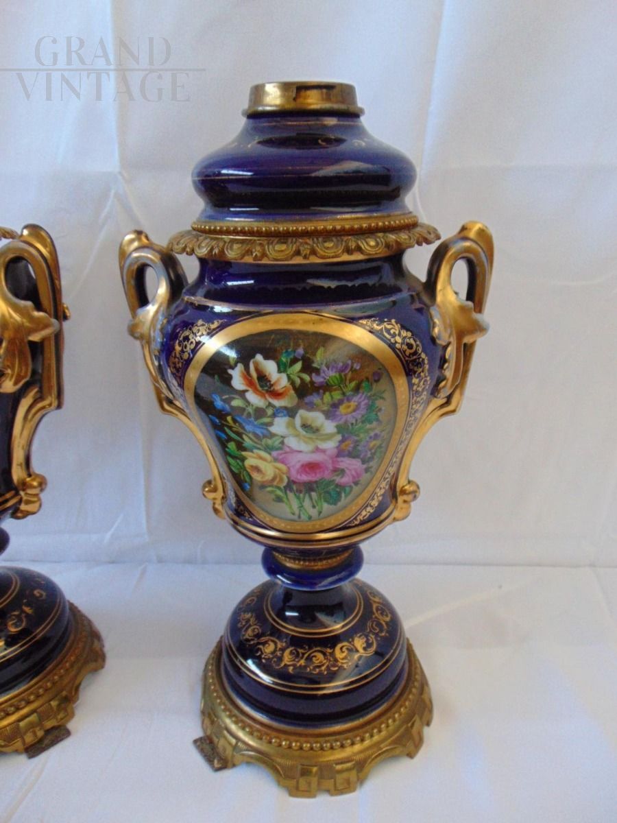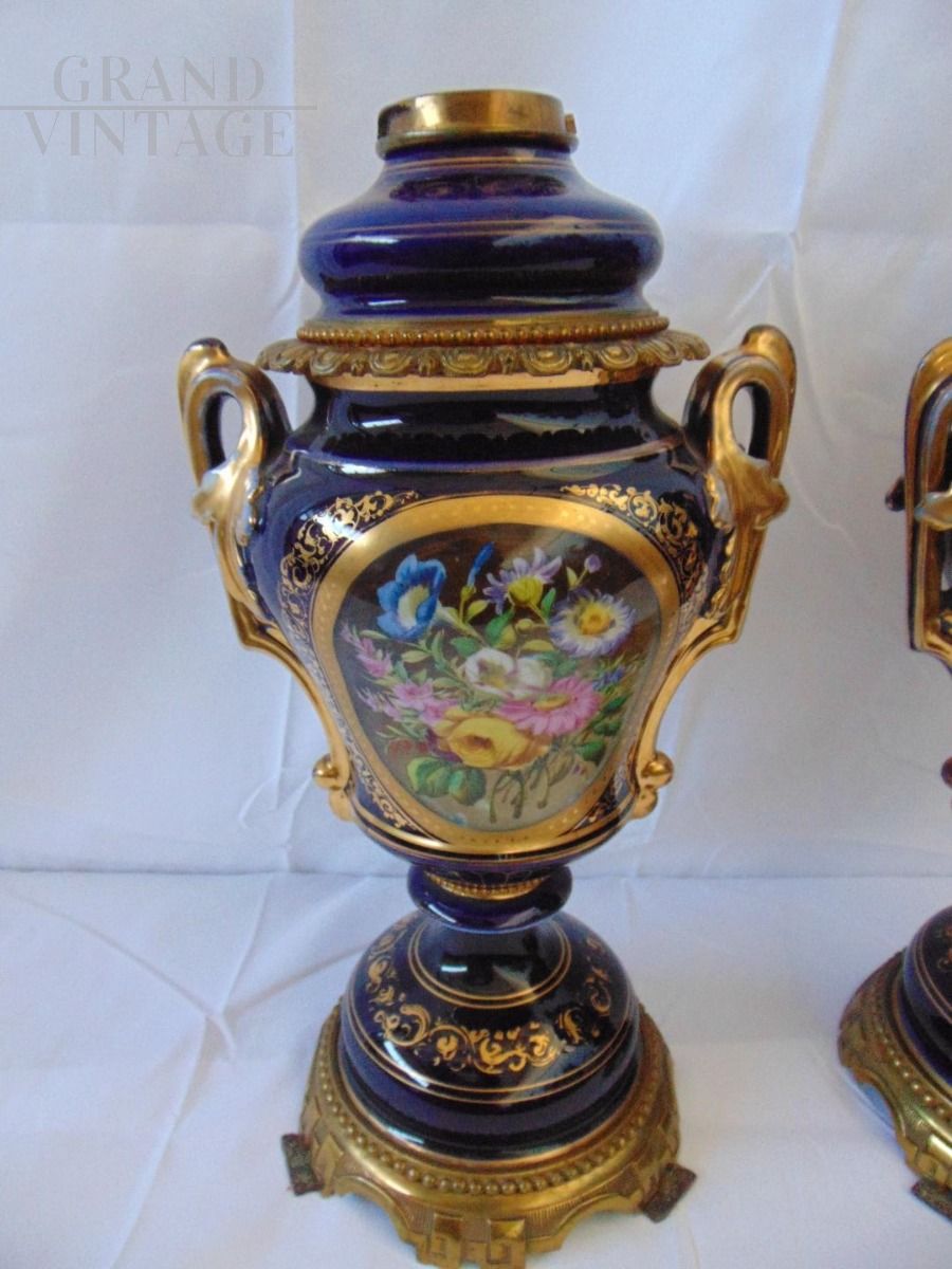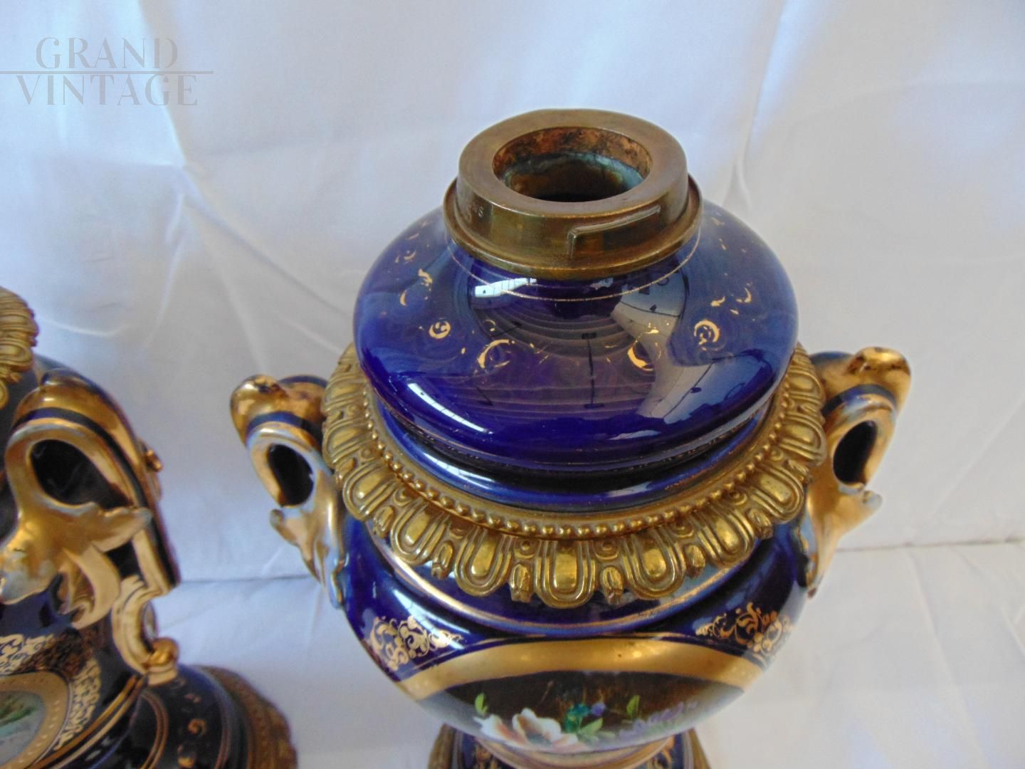 Coppia di splendidi vasi ex lampade ad olio vittoriane Inglesi Hinks & Son in ceramica blu decorata con medaglione centrale floreale dipinto a mano e dettagli dorati, base e parti in bronzo. In buone condizioni.