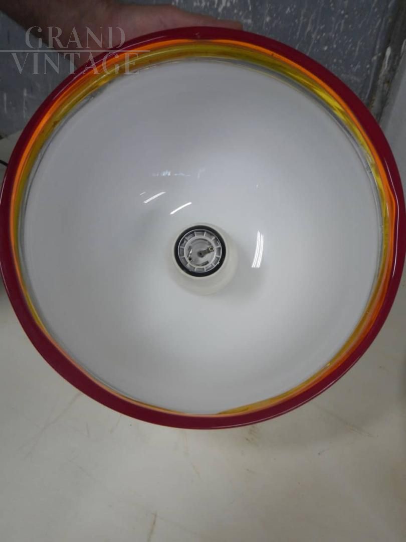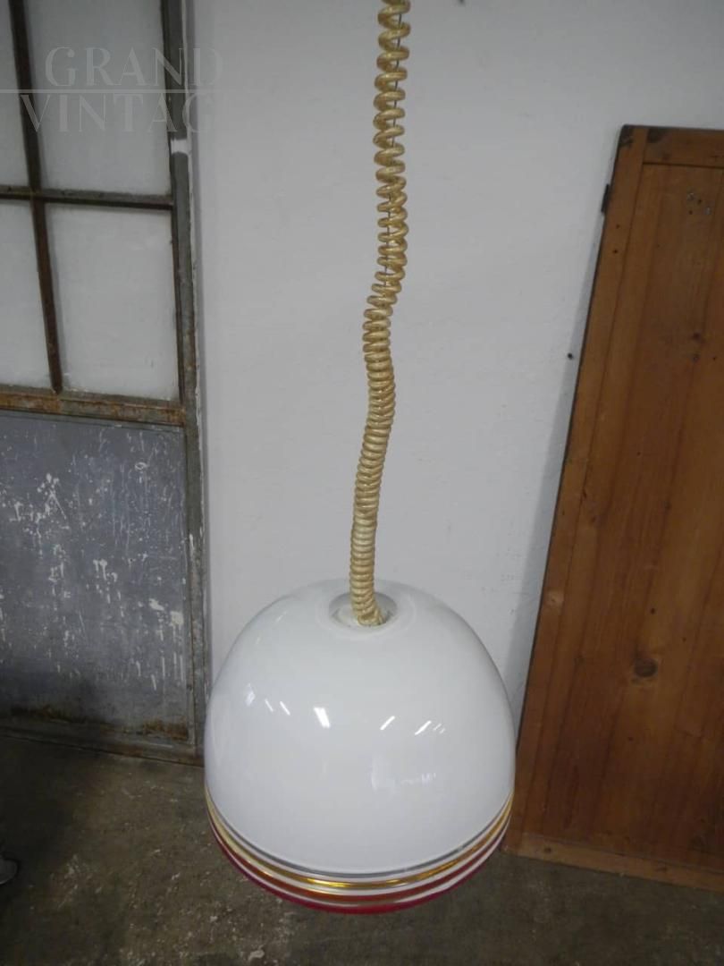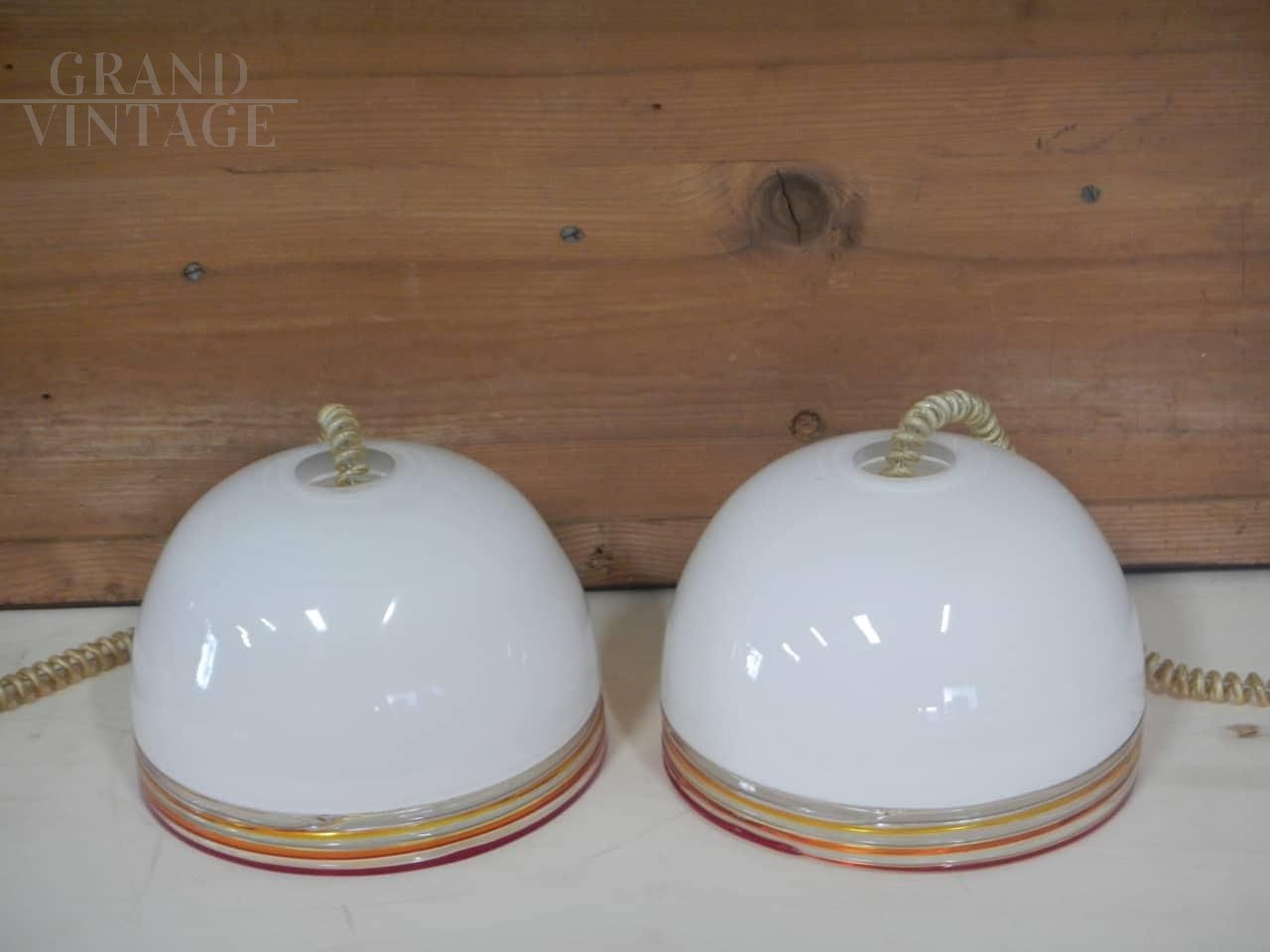 Coppia di lampadari lampade a sospensione design di Roberto Pamio & Renato Toso per Leucos in vetro di Murano bianco dalla forma a cupola semisferica con righe in tonalita dal rosso all’arancio. Il cavo di sostegno è allungabile fino a cm 72. In ottime condizioni con impianto originale.
