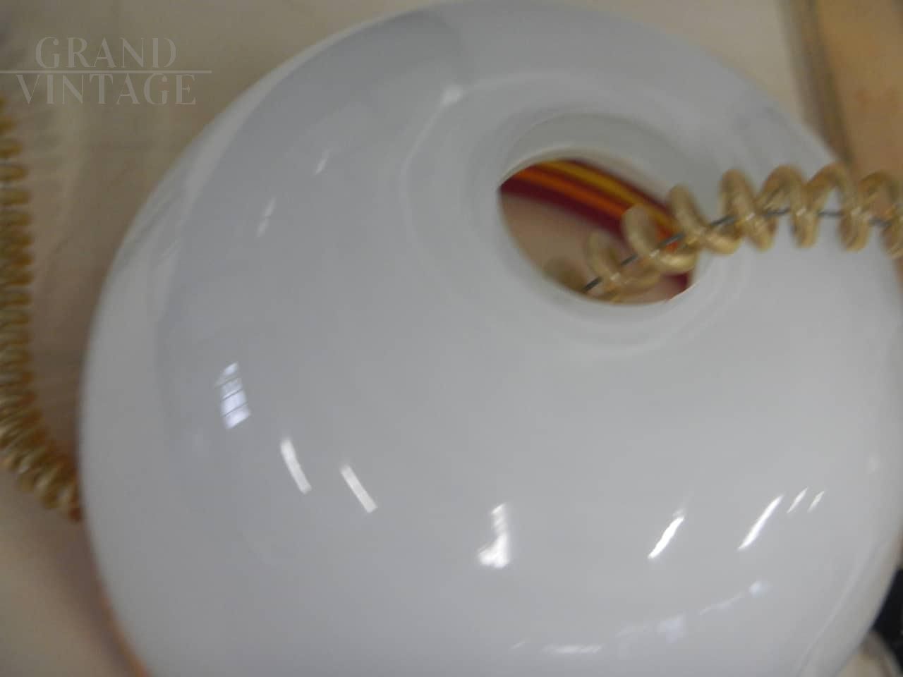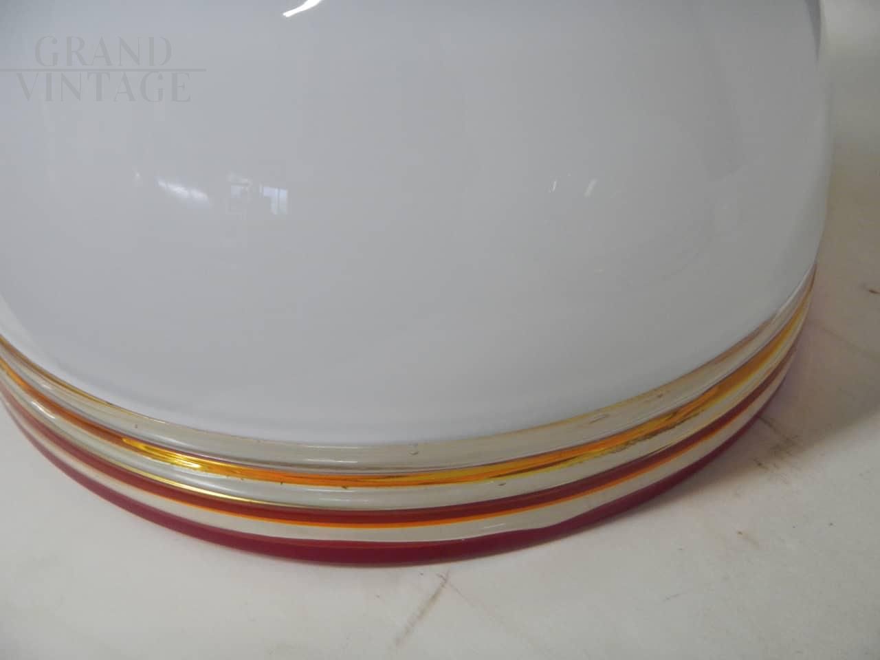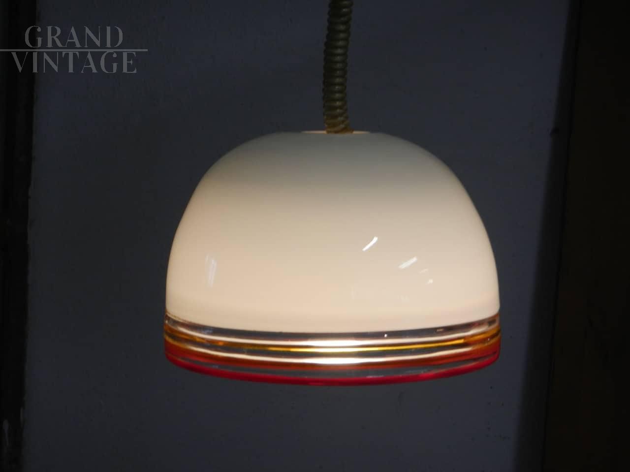 Coppia di lampadari lampade a sospensione design di Roberto Pamio & Renato Toso per Leucos in vetro di Murano bianco dalla forma a cupola semisferica con righe in tonalita dal rosso all’arancio. Il cavo di sostegno è allungabile fino a cm 72. In ottime condizioni con impianto originale.