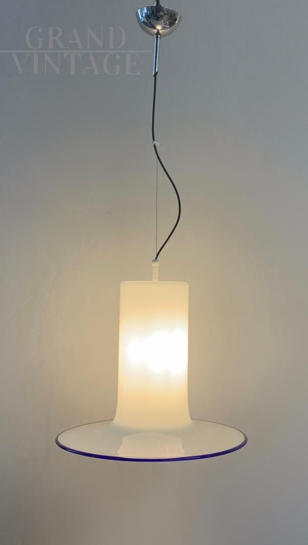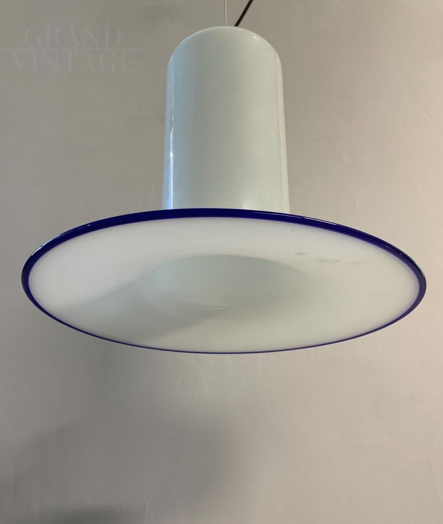 Coppia lampade pendenti Vistosi in vetro di Murano bianco e blu