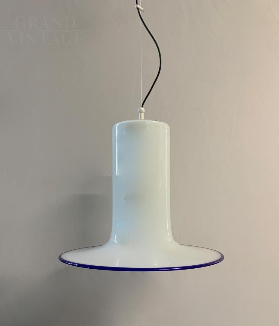 Coppia di bellissimi lampadari lampade a sospensione della ditta Vistosi in vetro di Murano bianco panna con bordo blu scuro, Italia anni '70. I lampadari sono di medie dimensioni, il vetro è stato lavorato a mano su stampo rendendoli delle vere opere d'arte. La struttura portante è in metallo. In ottime condizioni con pochi segni del tempo, i vetri sono perfetti, intatti e non crepati, l'impianto elettrico è stato rifatto a nuovo e adattato per lampadine al Led, il cavo in acciaio è stato sostituito. Ottimo pezzo adatto ad illuminare diverse stanze, non abbaglia se vengono montate lampadine bianco latte.